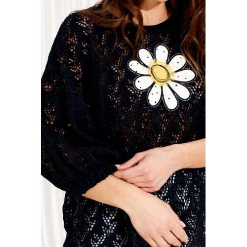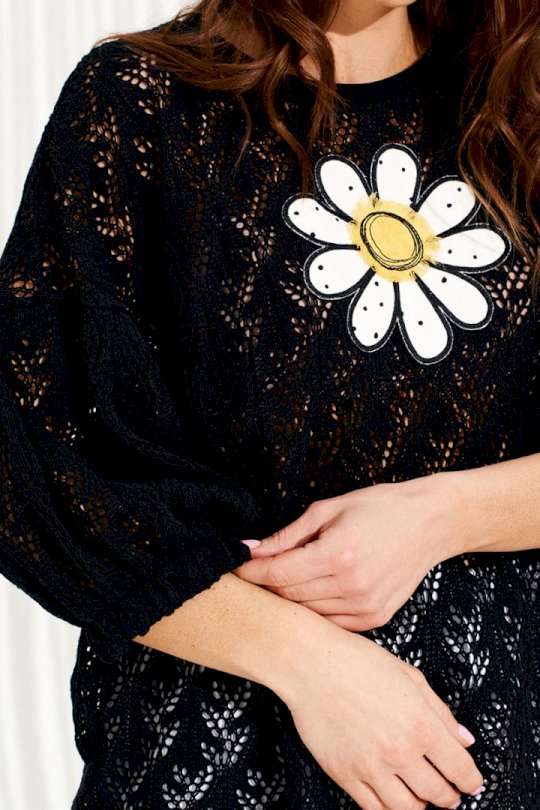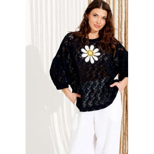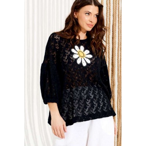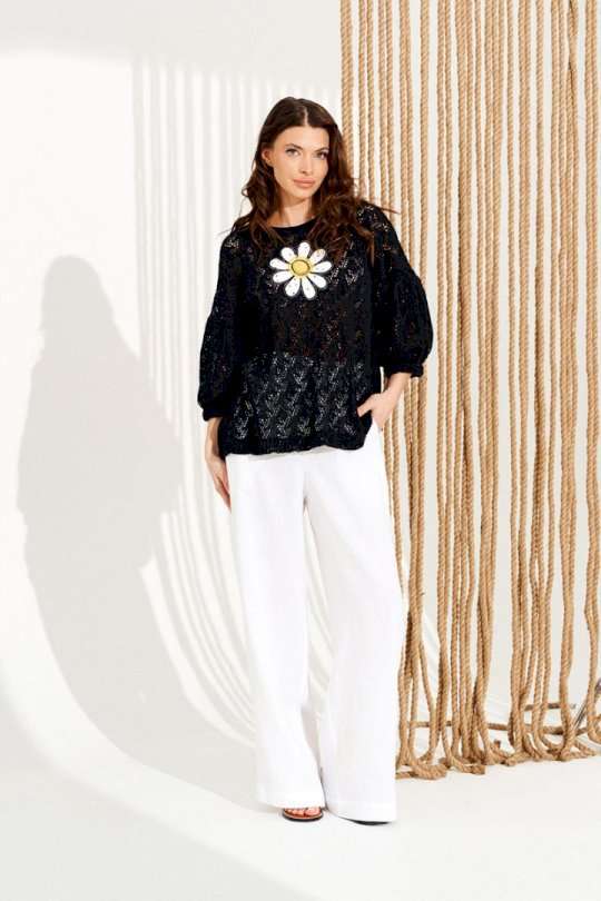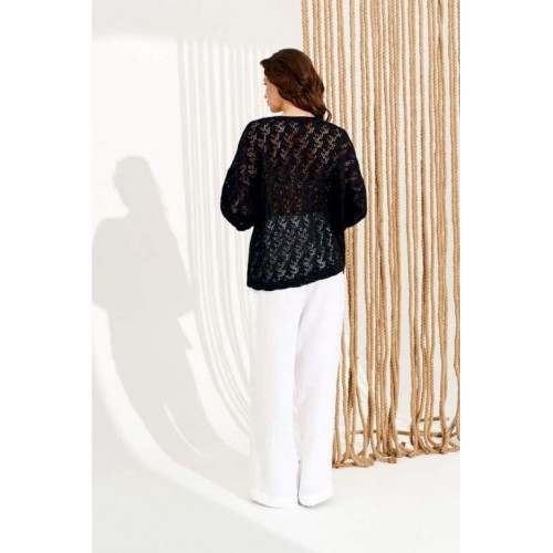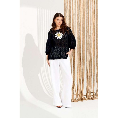 Блузка умеренного объема, приталенного силуэта, с центральной застежкой на навесные петли и пуговицы. Воротник-стойка. Детали переда с односторонними складками от плечевого шва. Спинка цельная. Для регулировки приталенности в боковые швы вставлены пояски-завязки. Боковые швы заканчиваются разрезами. Рукав втачной, короткий. Длина изделия на модели вдоль середины спинки — 69 см (допустимое отклонение +/- 1 см)