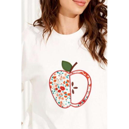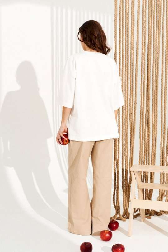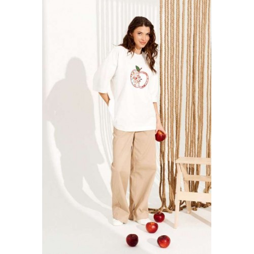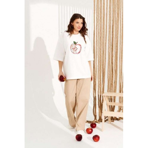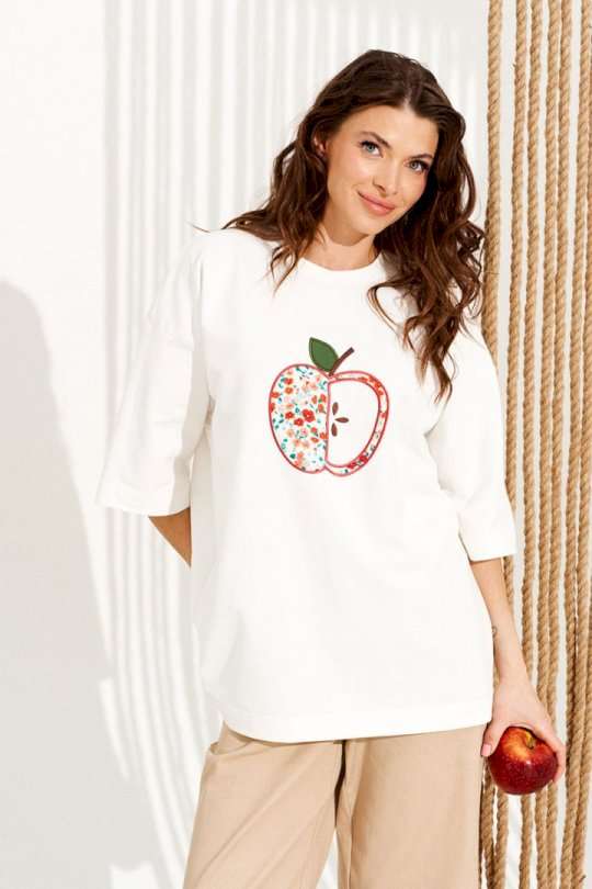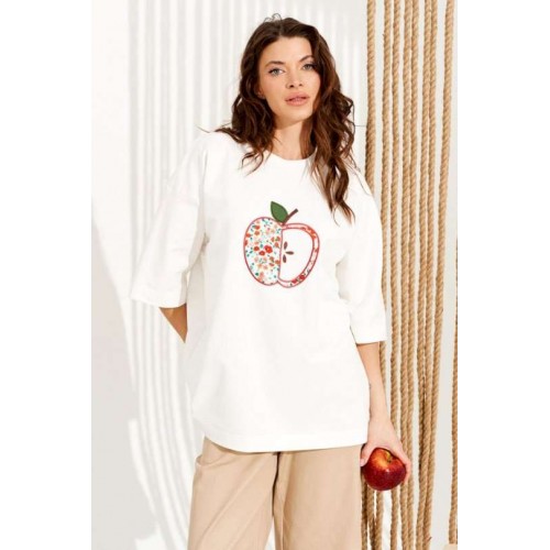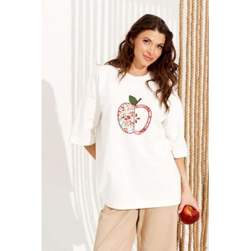 Джемпер из трикотажного полотна свободного объема, прямого силуэта, с круглым вырезом горловины. Вырез горловины обработан притачной обтачкой. Перед и спинка цельные. По переду выполнена вышивка-аппликация «Яблоко». Рукав втачной, одношовный, короткий. Длина изделия на модели вдоль середины спинки — 68,5 см (допустимое отклонение +/- 1 см)