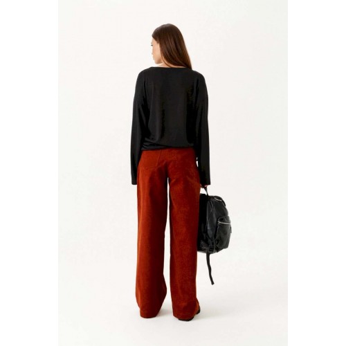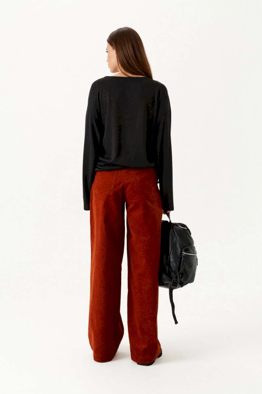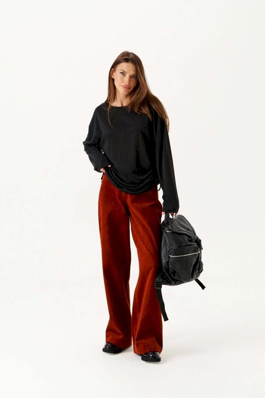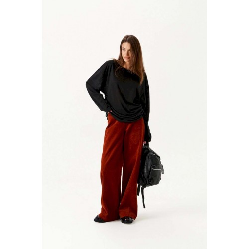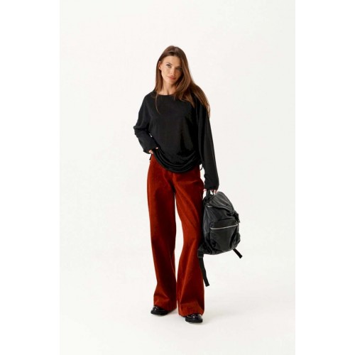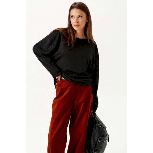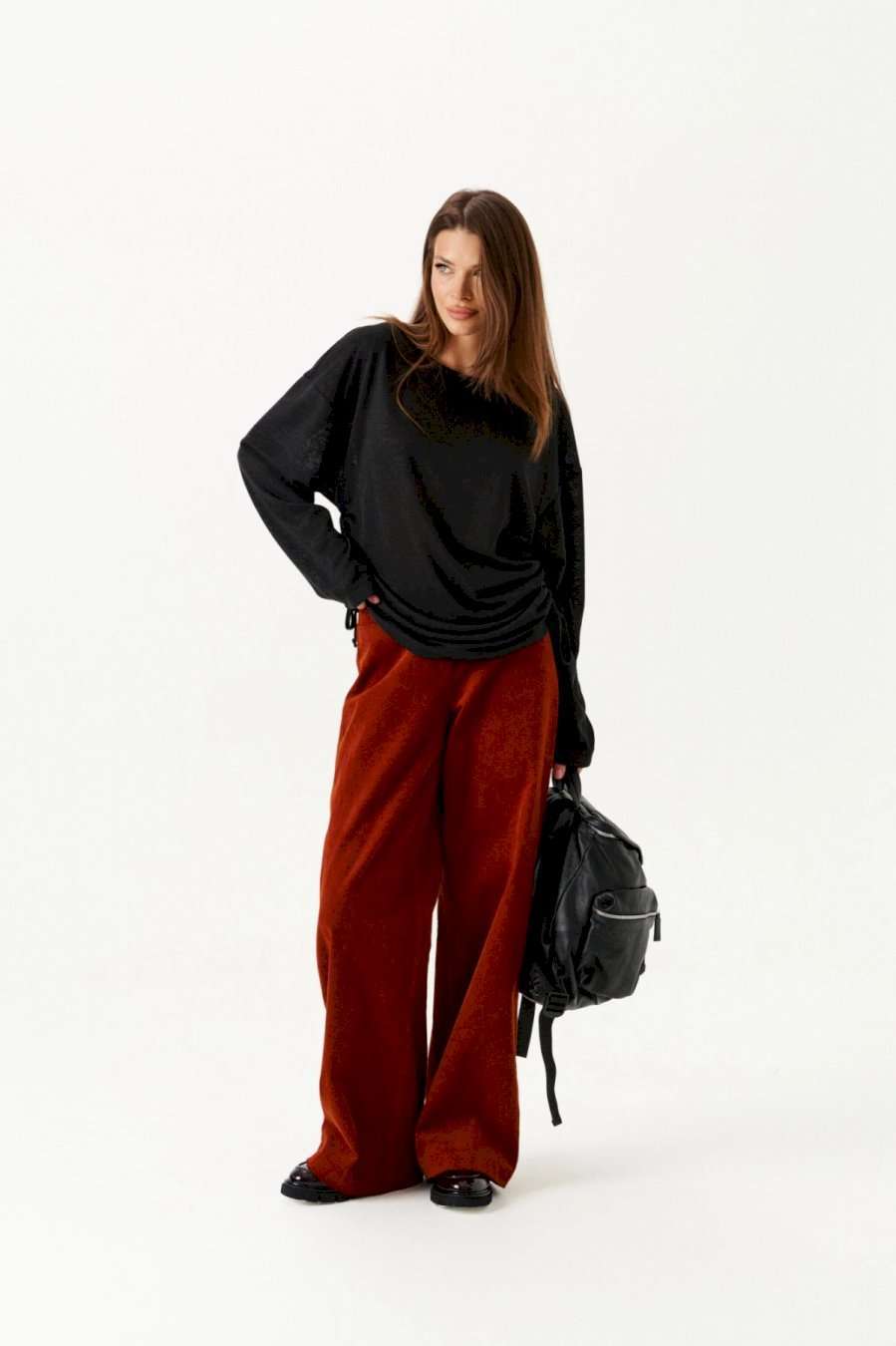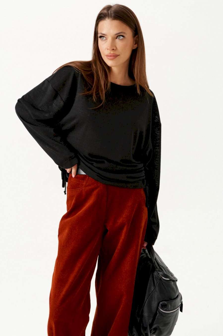Джемпер из трикотажного полотна, прямого силуэта, свободный. Вырез горловины в форме "лодочка". В боковых швах кулиса со шнуром-завязкой. Рукав длинный, втачной, одношовный, широкий.