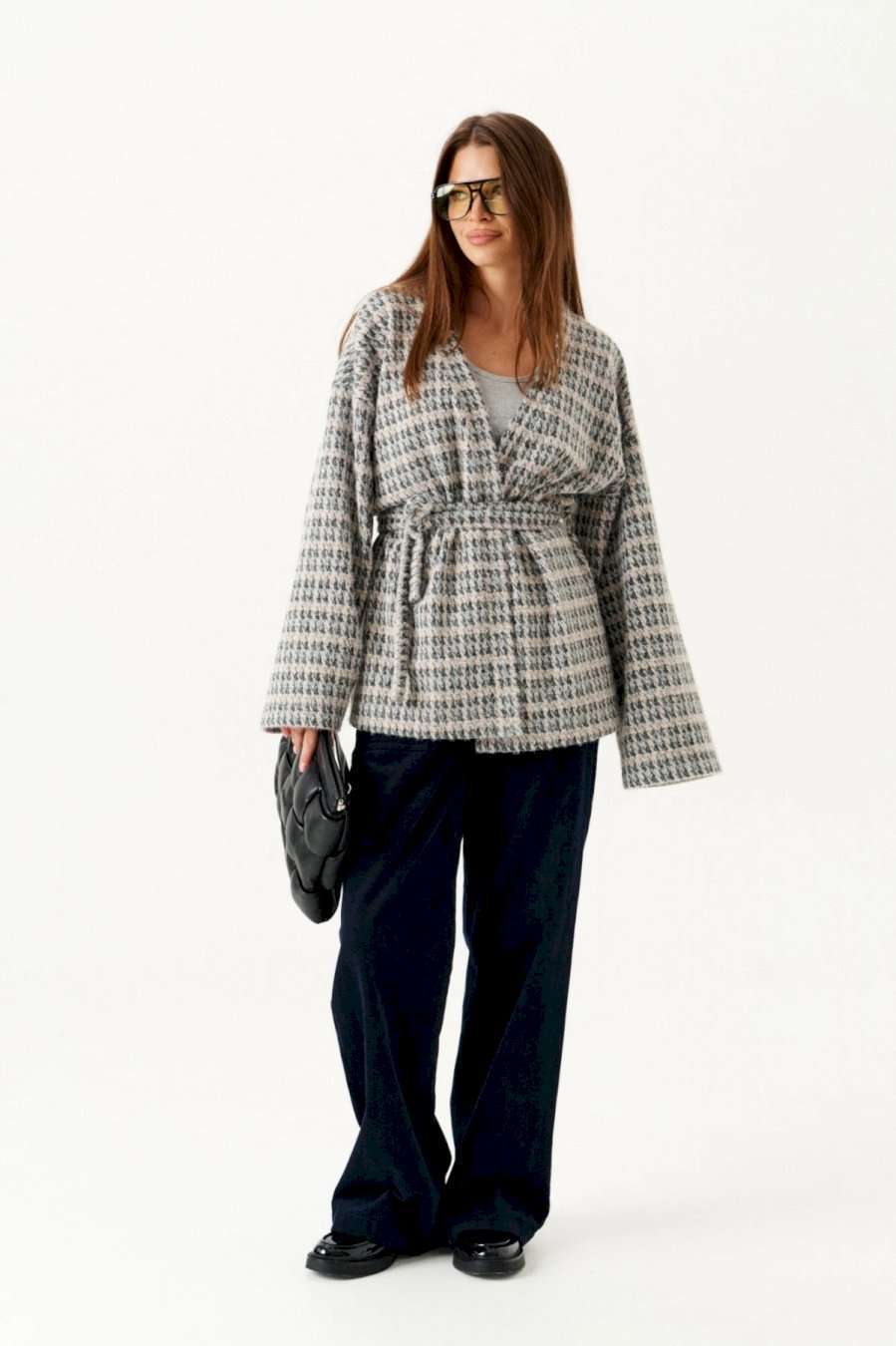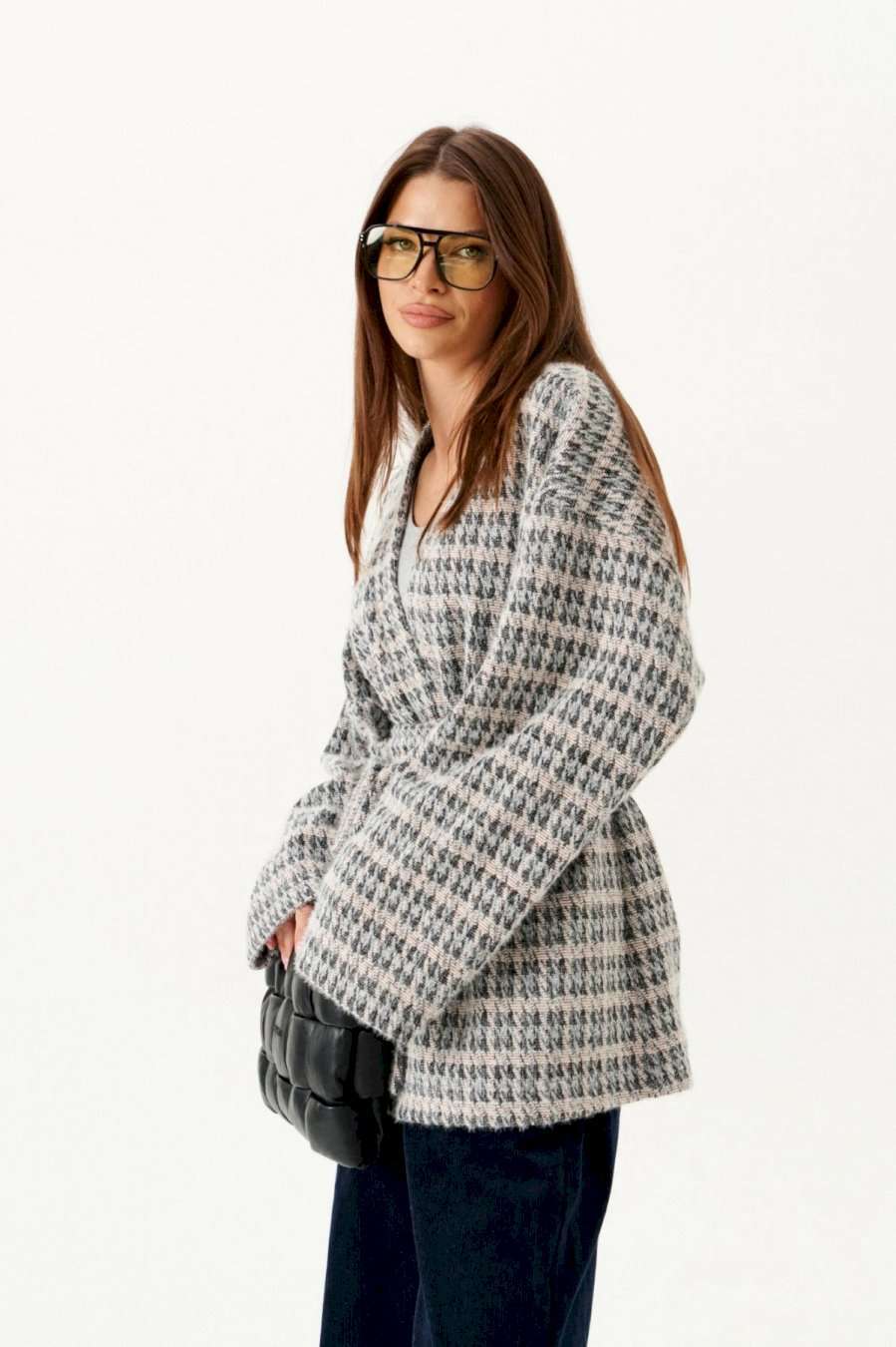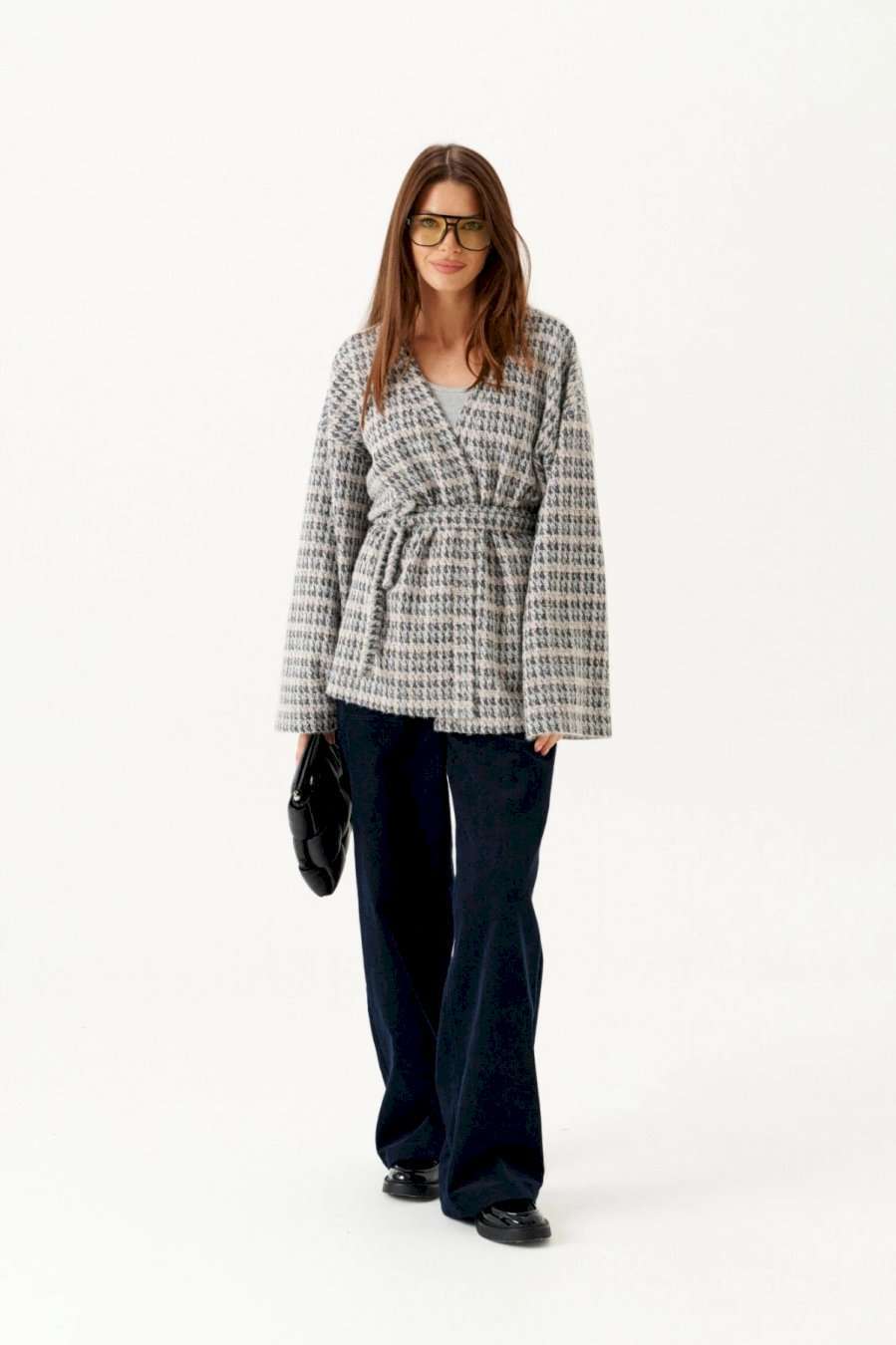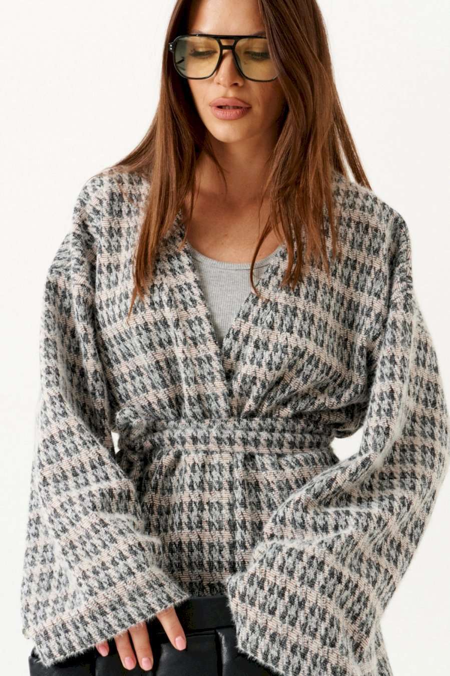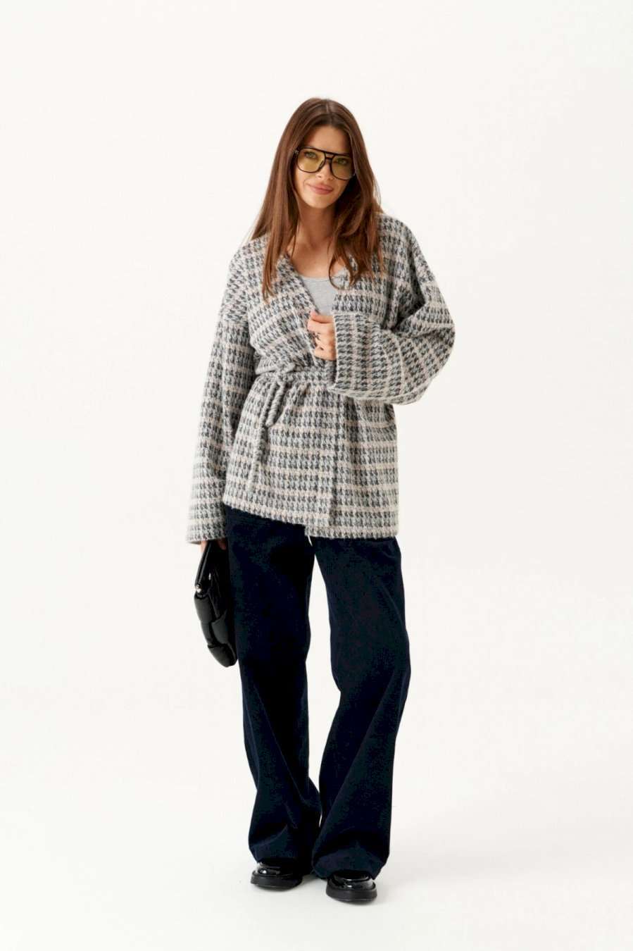 Кардиган из трикотажного полотна умеренного объема, прямого силуэта. Вырез горловины и борта обработаны цельнокроеной планкой. Линия плеча спущенная. Спинка цельная. Рукав втачной, широкий. В комплекте пояс из основной ткани.