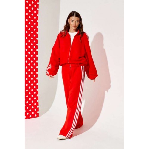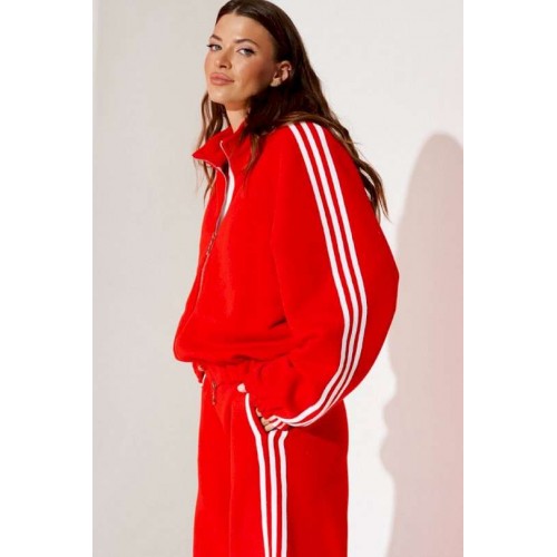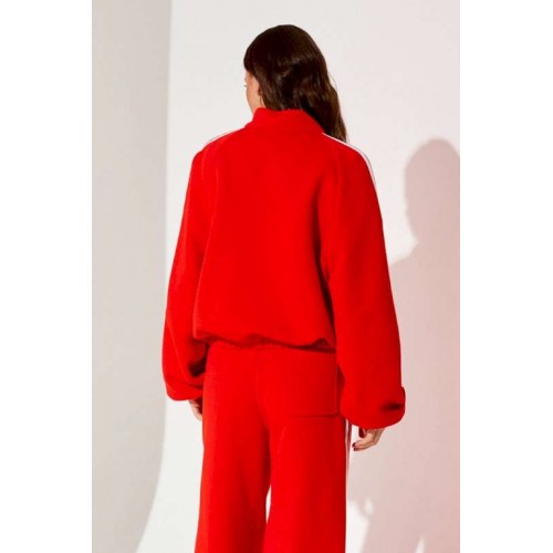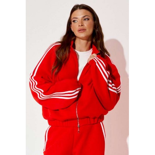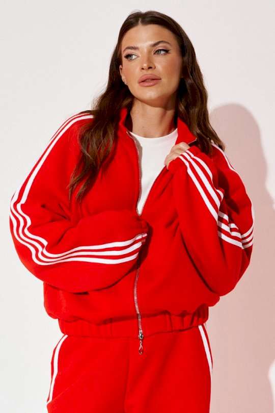 Бомбер из трикотажного полотна свободного объема, прямого силуэта, со спущенной линией плеча, с центральной застежкой на тесьму-молнию. Воротник-стойка. Нижний срез переда и спинки обработан притачной манжетой на резинке. Рукав покроя реглан. Нижний срез рукава на резинке. Рукав декорирован декоративной тесьмой.
