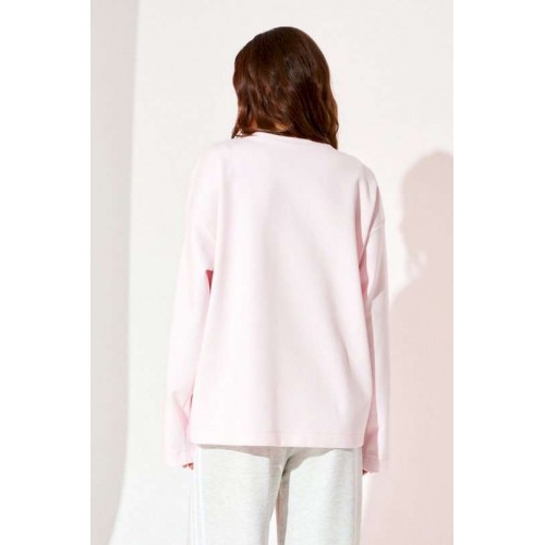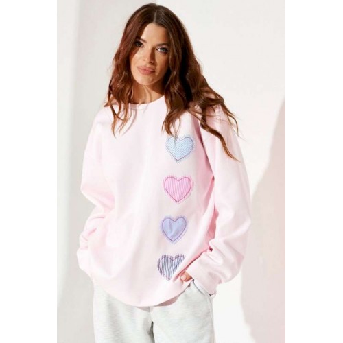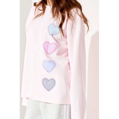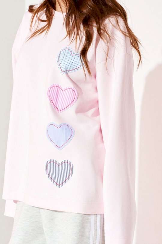 Джемпер из трикотажного полотна свободного объема, прямого силуэта, с круглым вырезом горловины. Вырез горловины обработан притачной обтачкой. Перед и спинка цельные. По переду выполнена вышивка-аппликация «Сердечки» из контрастных материалов. Рукав втачной, одношовный, длинный.
