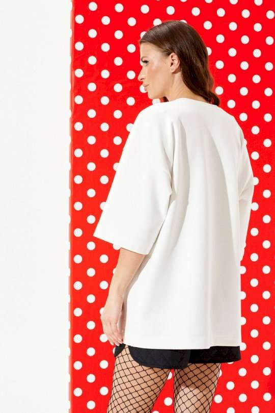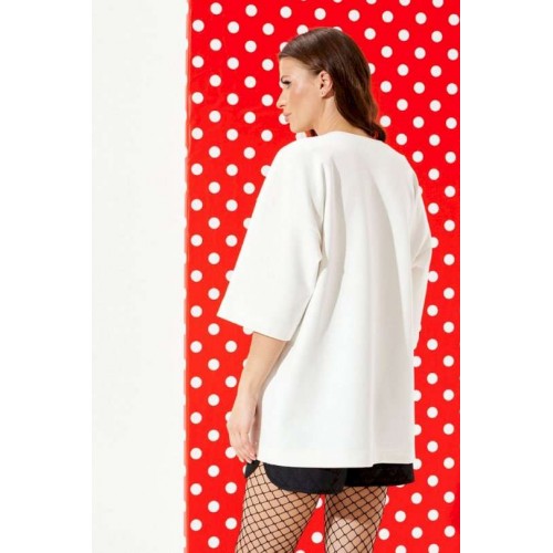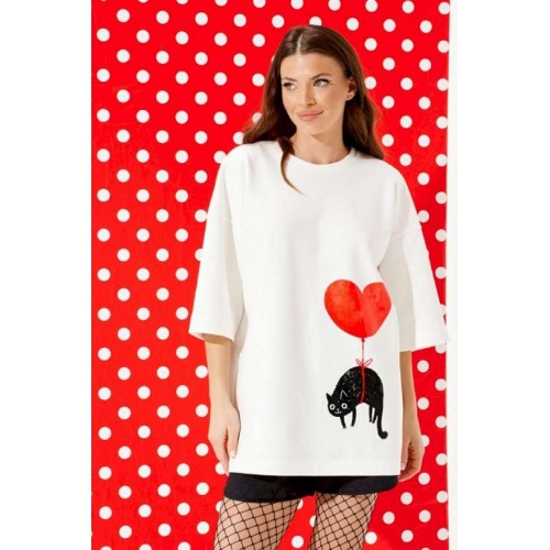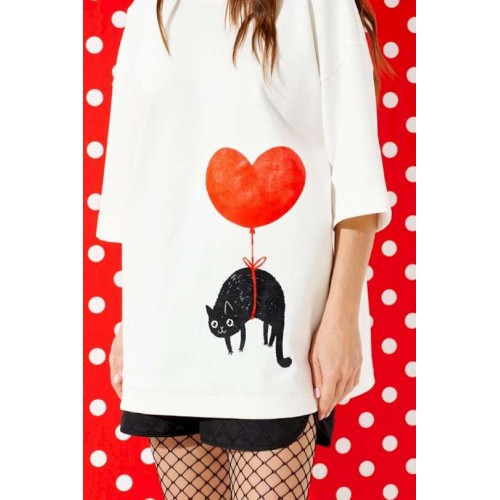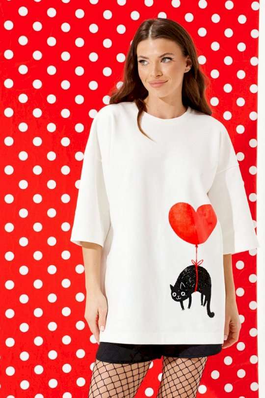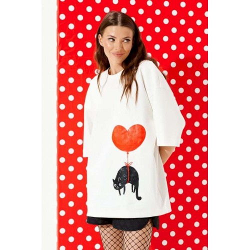 Джемпер из трикотажного полотна свободного объема, прямого силуэта, с круглым вырезом горловины. Перед и спинка цельные. По переду выполнена печать «Кот на воздушном шаре». Рукав втачной, одношовный, короткий.