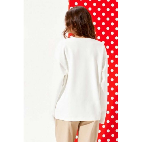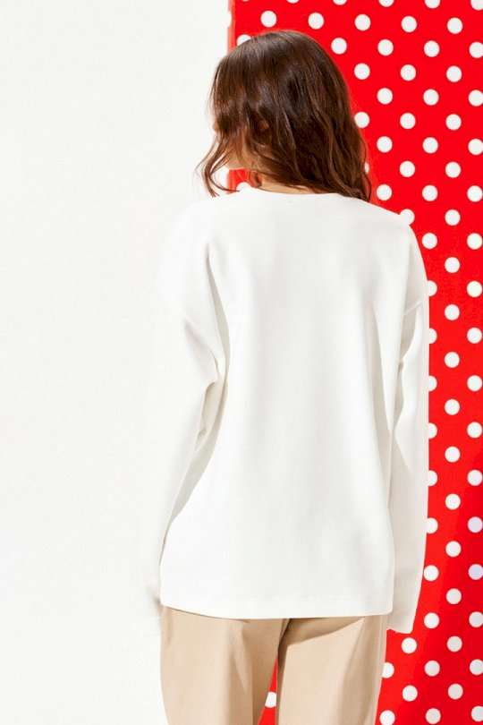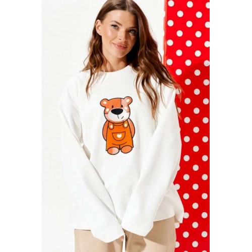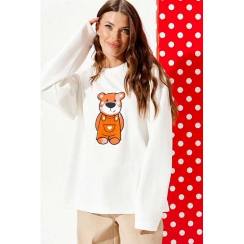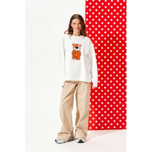 Джемпер из трикотажного полотна свободного объема, прямого силуэта, с круглым вырезом горловины. Вырез горловины обработан притачной обтачкой. Перед и спинка цельные. По переду выполнена вышивка-аппликация «Медвежонок» из контрастных материалов. Рукав втачной, одношовный, длинный.
