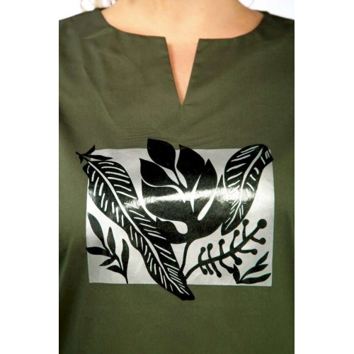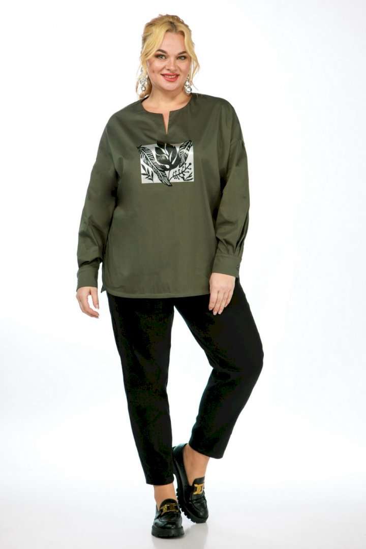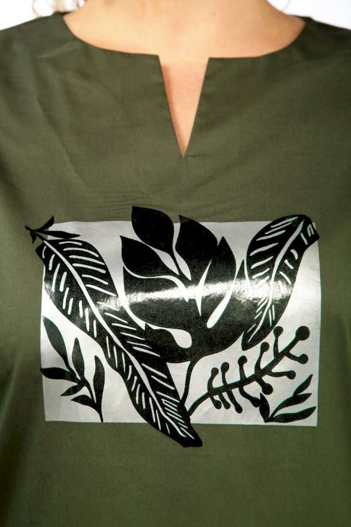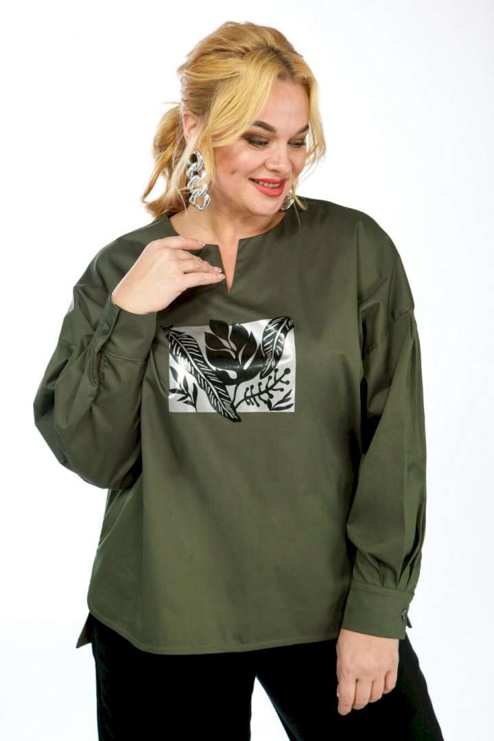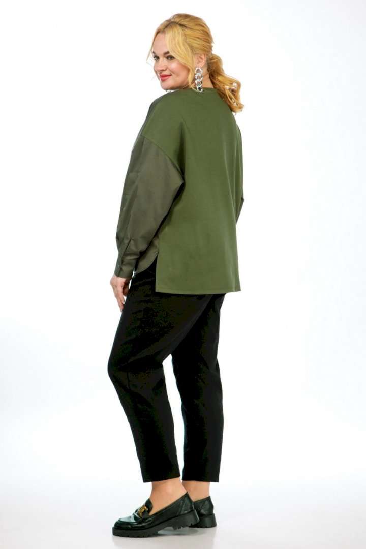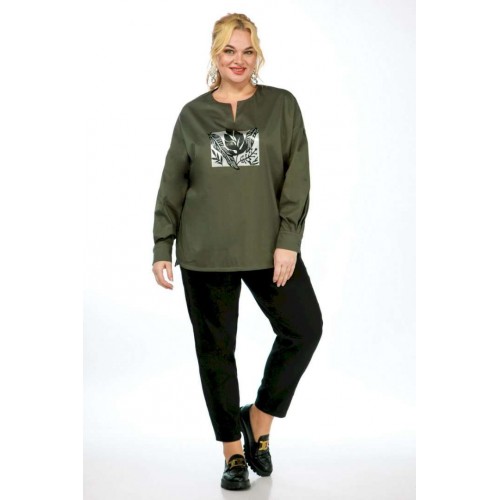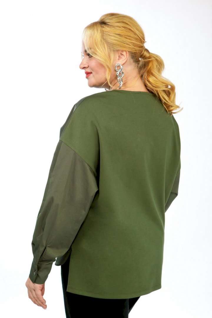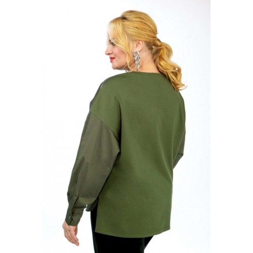 Джемпер женский, свободного силуэта изготовлен путем комбинирования тканей 2-х видов, перед и рукава из хлопка, спинка из трикотажного полотна. Горловина круглой формы с фигурным вырезом. Перед и спинка цельнокроеные. Рукав длинный, спущенный, по верхнему и нижнему срезу рукава складки. Рукав на манжете с застежкой на петлю и пуговицу. Джемпер дополнен печатью. Обращаем Ваше внимание, что цвет на экране может отличаться от реального. Длина джемпера по спинке – 71 см, рукава – 47 см. р.52 – ПОГ 63 см, ПОБ 62 см, р.54 – ПОГ 65 см, ПОБ 64 см, р.56 – ПОГ 67 см, ПОБ 66 см.