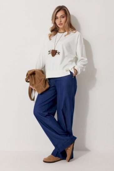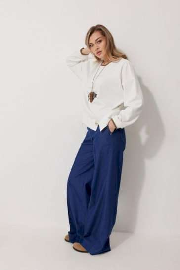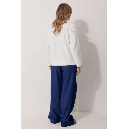 Джемпер женский прямого силуэта со спущенной линией плеча. Горловина округлой формы. Рукав втачной одношовный, полной длины. Горловина и низ рукава обработаны притачным отделочным трикотажным «довязом». Низ блузки джемпера обработан притачной фигурной баской с декором. Длина изделия по спинке 64 см, длина рукава 77 см.