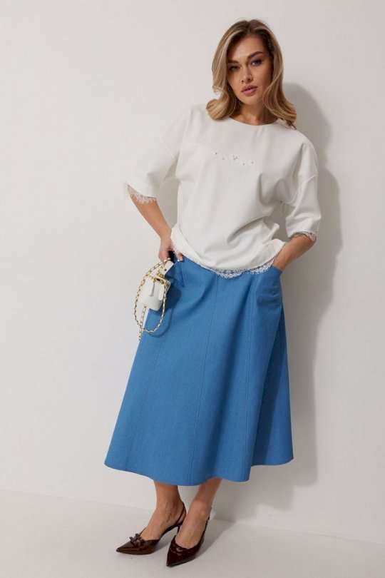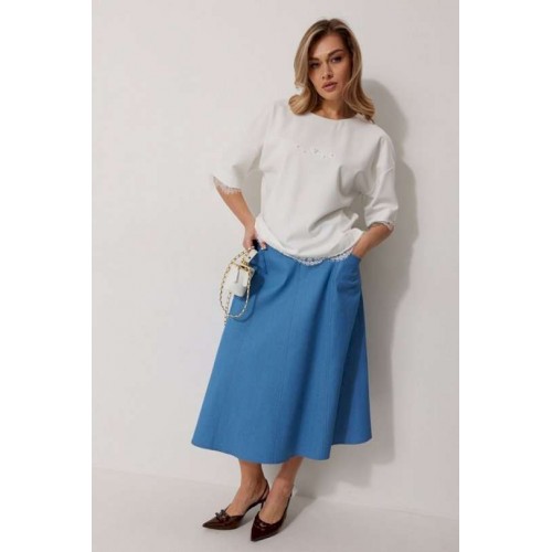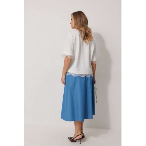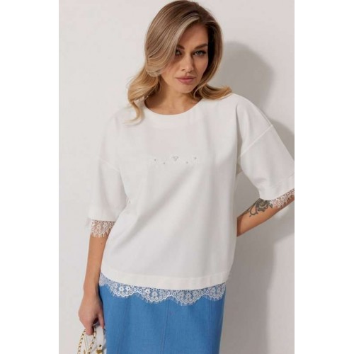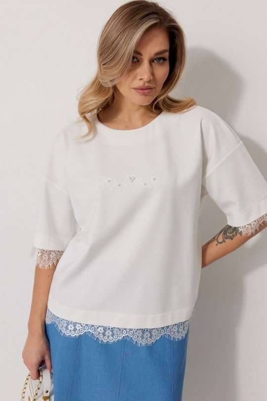 Джемпер женский прямого силуэта со спущенной линией плеча. По переду авторская печать декорированная бусинами. Горловина округлой формы, обработана обтачкой. Рукав втачной одношовный, 3/4 длины. Низ изделия и низ рукава обработаны притачным ажурным кружевом. Длина изделия по спинке 60 см, длина рукава 45 см.