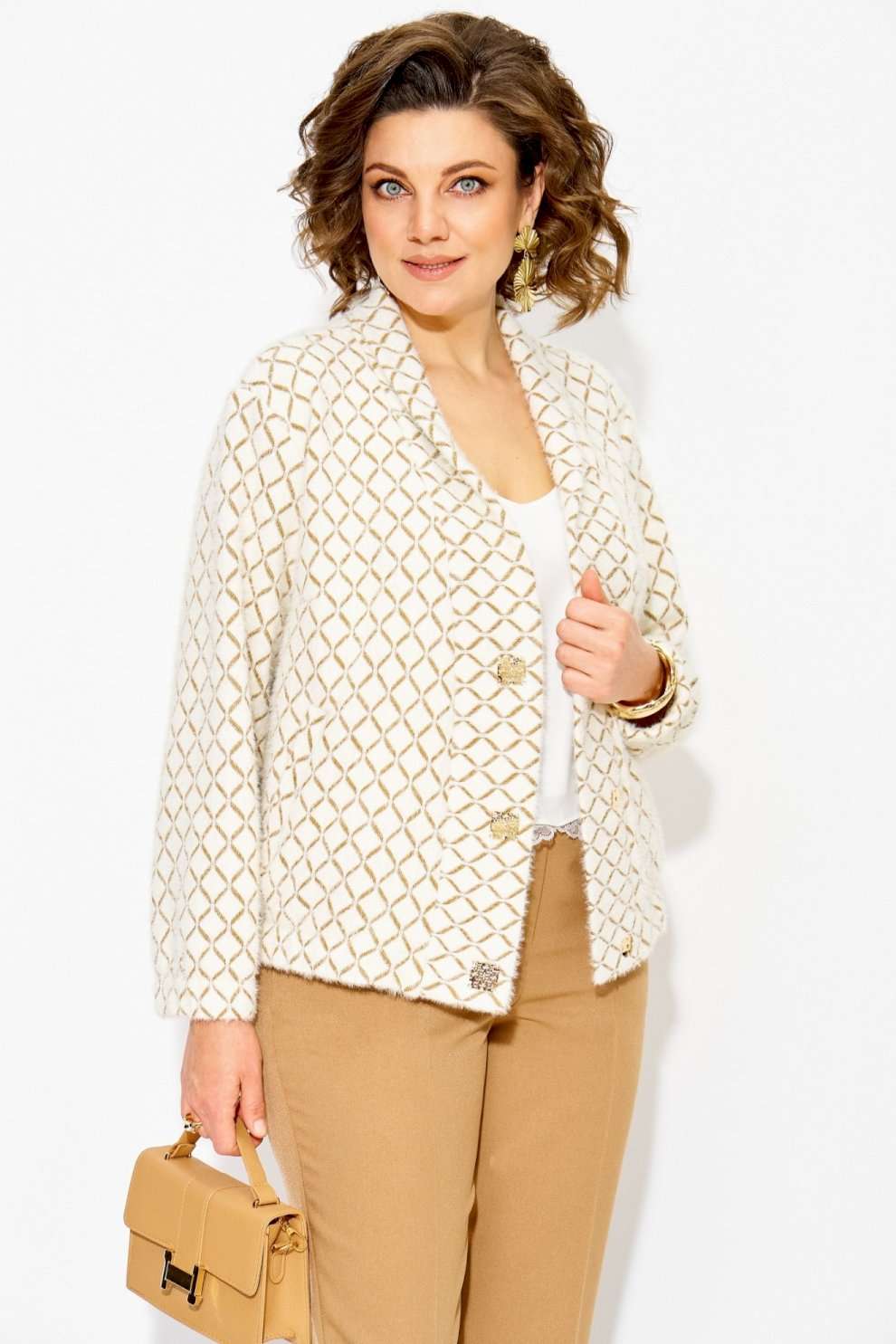 Трикотажный кардиган с эффектным принтом – отличный выбор для повседневной одежды в офис и для особого случая. Модель выполнена из мягкого материала, который приятно ощущается на теле. Укороченный фасон, присборен по низу на резинку, придает пикантность образу. Воротник отложной по типу шали. По полочке расположены прорезные карманы. Металлические пришивные кнопки служат не только функциональным элементом застежки, но и подчеркивают аккуратность изделия. Короткий кардиган оверсайз в стиле old money разработан с учетом особенностей: он хорошо сидит по фигуре, не стесняет движений. Отлично сочетается с базовыми брюками из коллекции от бренда «Лилиана». Длина по спинке – 58-60 см. Рукав – 62 см.