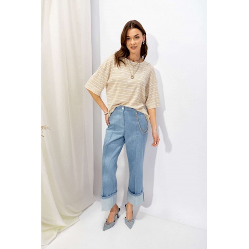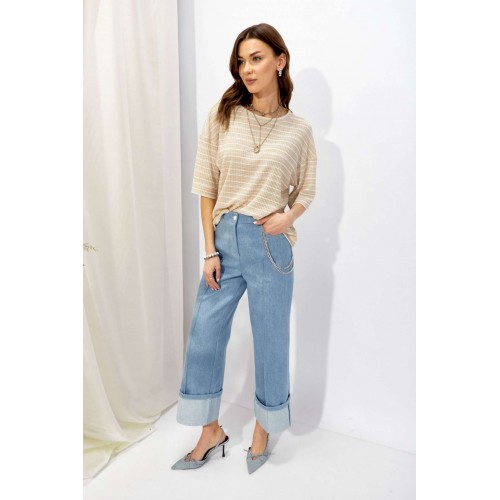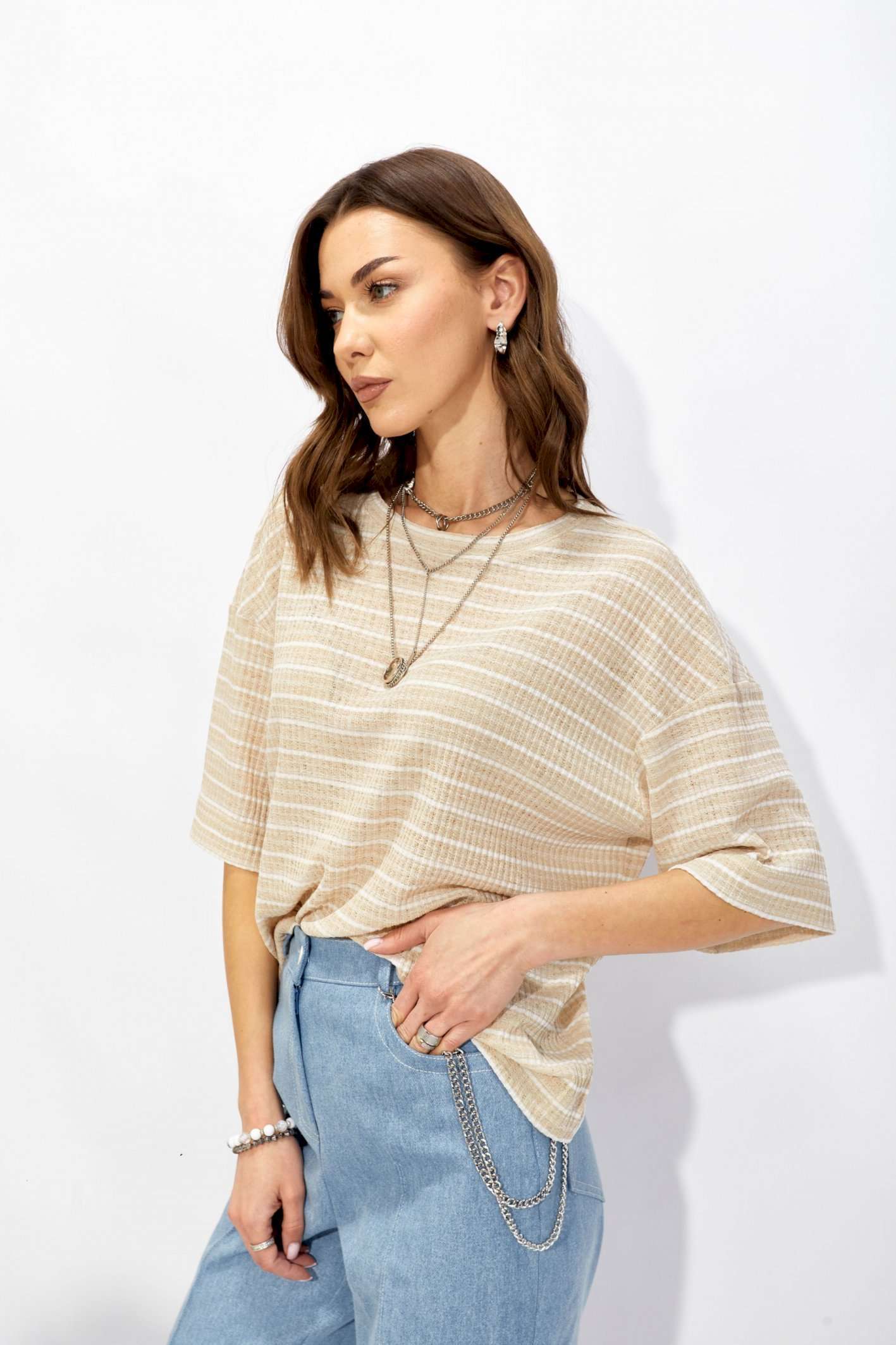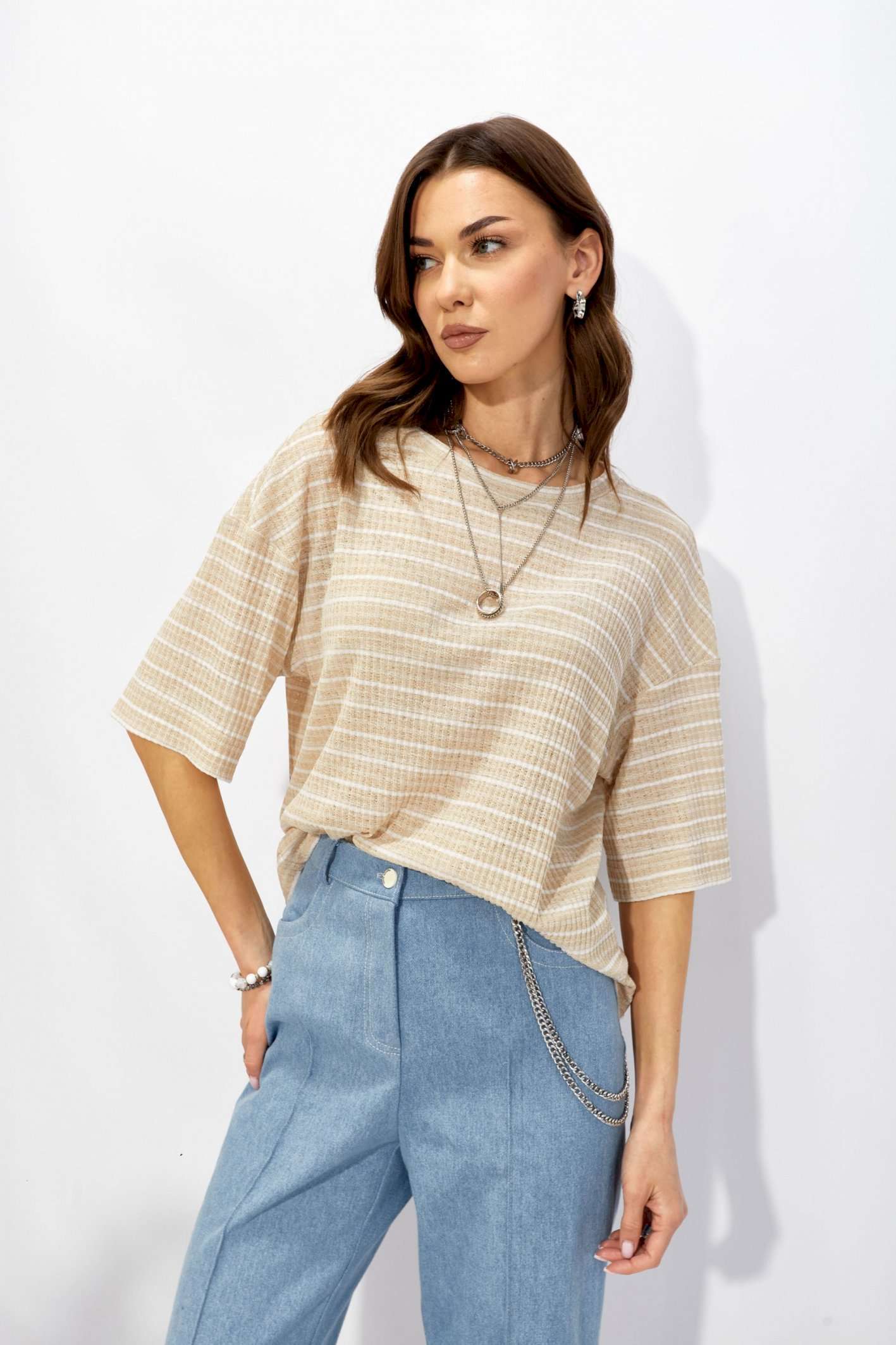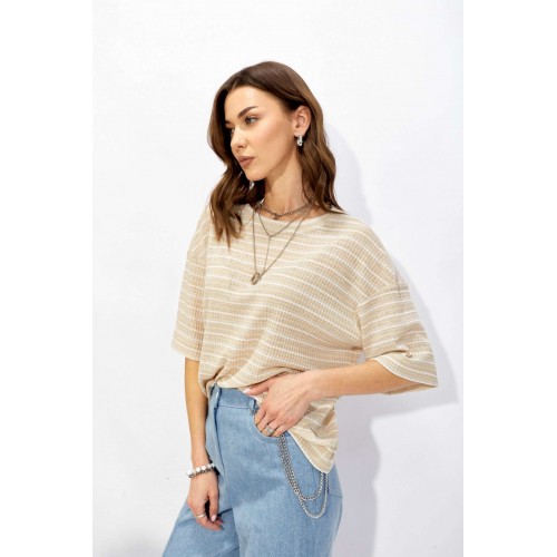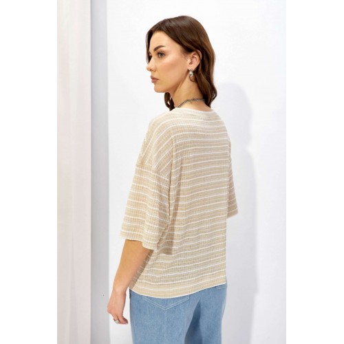 Джемпер прямого силуэта из трикотажного полотна в полоску. Горловина округлая. Рукав со спущенной линией плеча длиной до локтя. Длина джемпера (44-48р – 57см)( 50-54р -61см)(56-60р – 65см) Длина рукава от горловины (44-48р - 43см)( 50-54р - 44,5см)(56-60р – 46см)