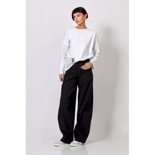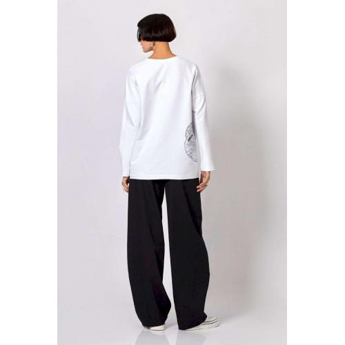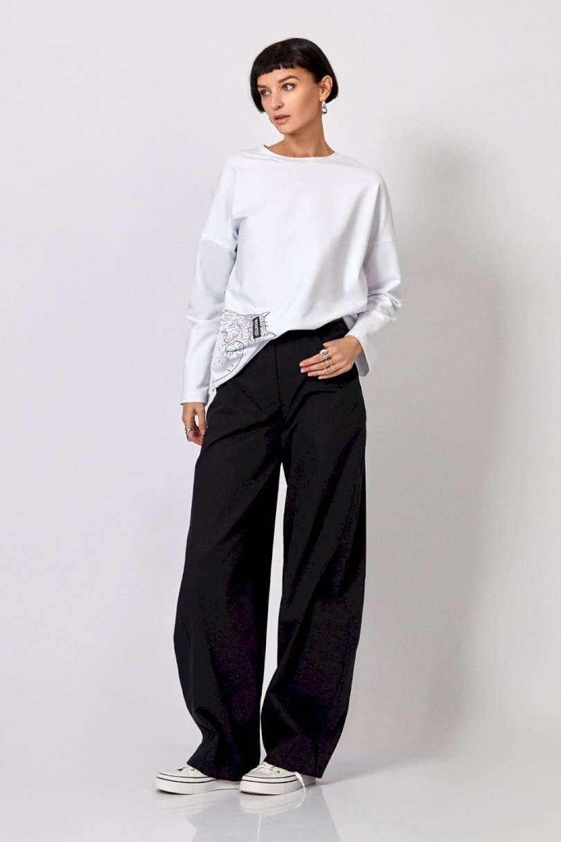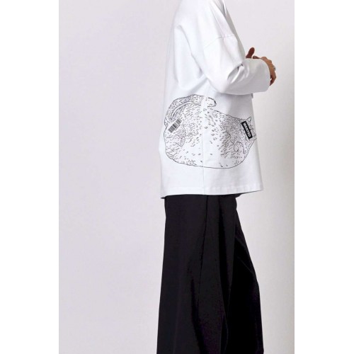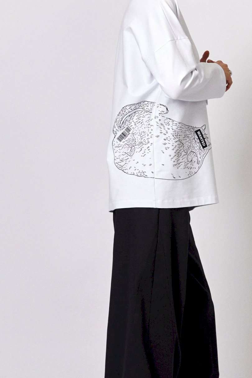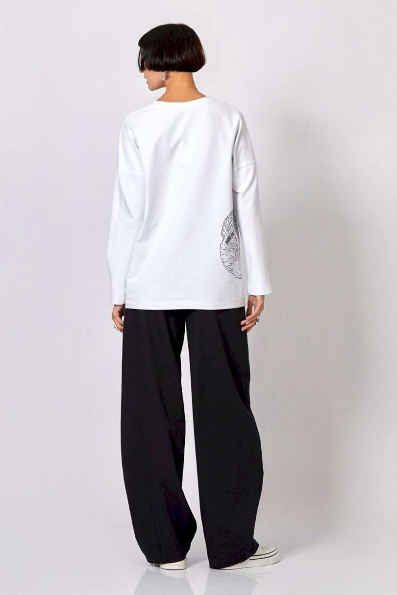 Лонгслив: - ткань: футер двухнитка - силуэт прямой - спущенная линия плеча - по горловине планка из основного материала, швы закрыты киперной лентой - спереди и на спинке печать