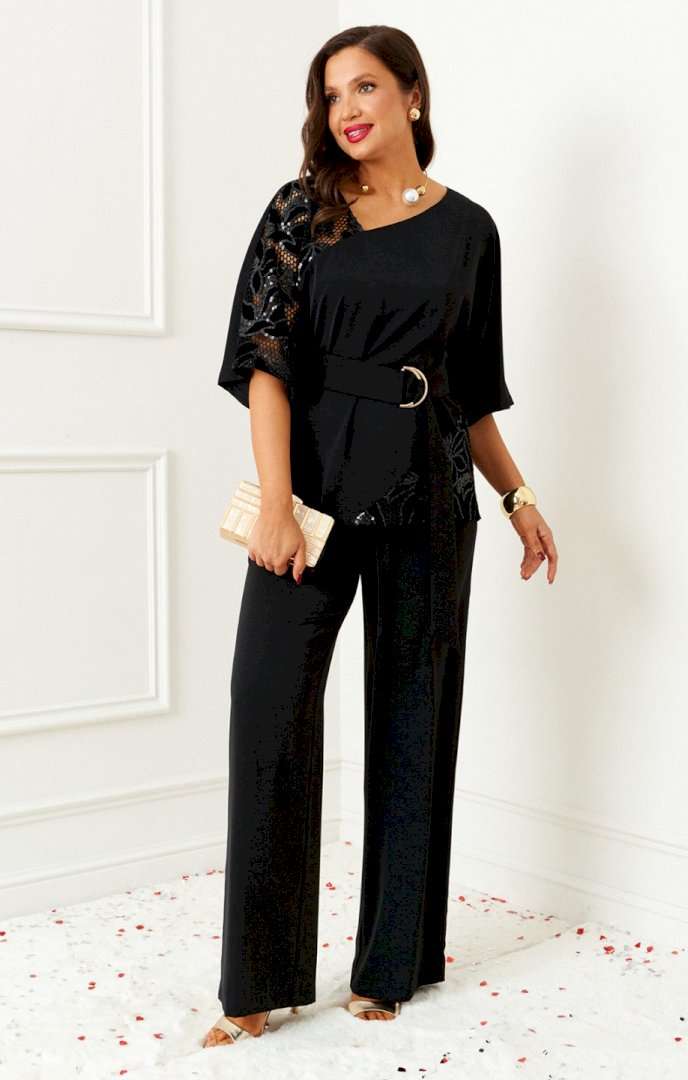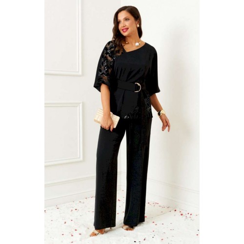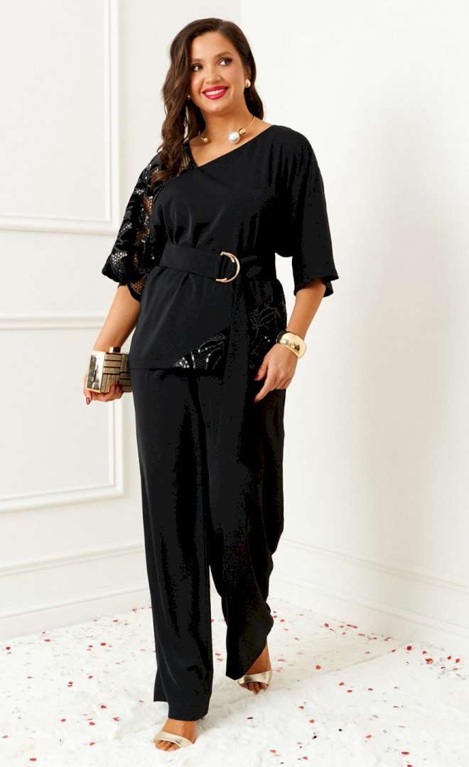 Готовимся к главной ночи года! Брючный костюм из мягкого крепа идеально подходит для торжественных выходов и не только! Предметы костюма можно смело комбинировать по отдельности с другими вещами Вашего гардероба и наслаждаться неповторимостью образа! Изысканный костюм состоит из 2-ух предметов: блузки и брюк. Выполнен из эластичного полотна в сочетании с кружевом. Основная ткань нежная, гладко-бархатистой фактуры, приятная на ощупь, она легко драпируется и очень выгодно и дорого подчёркивает образ; отделочная ткань придает праздничный шарм. Блузка свободного силуэта, с удлиненной линией плеча, длиной до середины бедра. Передняя часть с асимметрично расположенным отделочным кружевным полотном, вверху переходящим в рукав. Спинка разрезная по середине. Рукав цельнокроеный средней ширины, длиной около локтя. Горловина спереди фигурной асимметричной формы. Брюки прямого силуэта классической посадки, длинные. Высота сиденья стандартная. На притачном поясе, в который для удобного прилегания по талии вставлена резинка. К модели прилагается пояс с декоративной металлической пряжкой. Длина блузки (по середине спинки) ~ 68 см Длина рукава (+плечо) ~ 44,5 см. Длина брюк (с поясом) ~ 109 см.