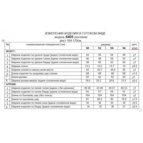 Удобство брючного костюма – неоспоримый факт, проверенный жизнью. Костюм женский 2-ух предметный: жакет и брюки в деловом стиле. Выполнен из костюмной ткани в сочетании с атласным полотном нежной и блестящей фактуры. Жакет классический полуприлегающего силуэта длиной ниже бедер. На подкладке. Передняя часть с вертикальными рельефами от проймы. На левой части переда выполнена верхняя листочка из ткани компаньона. На правой части переда скошена линия борта, из-под которой выглядывает отделочный элемент. Спинка с центральным швом и с вертикальными рельефами от проймы. Рукав втачной двухшовный длинный. Воротник пиджачного типа с лацканами. Застежка центральная однобортная на петлю и декоративную пуговицу. Жакет дополнен съемным отделочным элементом в виде воротника с лацканом на правой стороне из ткани компаньона. Брюки прямого силуэта классической посадки, длинные, с двумя верхними боковыми карманами. Высота сиденья стандартная. Застежка центральная на молнию и на петлю и пуговицу на поясе. В задней части пояса для удобного прилегания по талии вставлена резинка. Длина жакета (по среднему шву спинки) – 68 см. Длина рукава жакета – 62 см. Длина брюк (по боковому шву с поясом) –108 см.