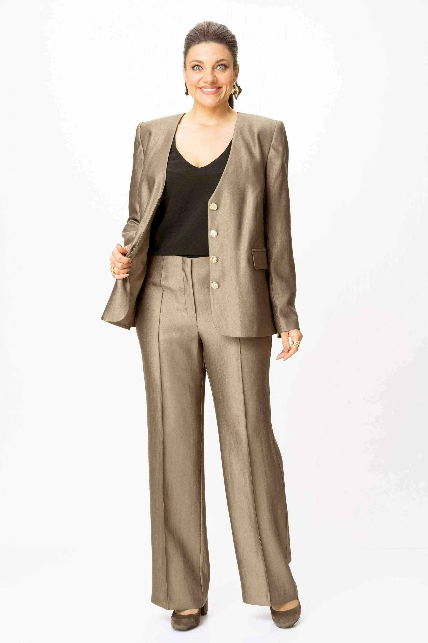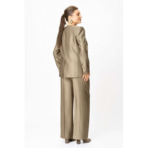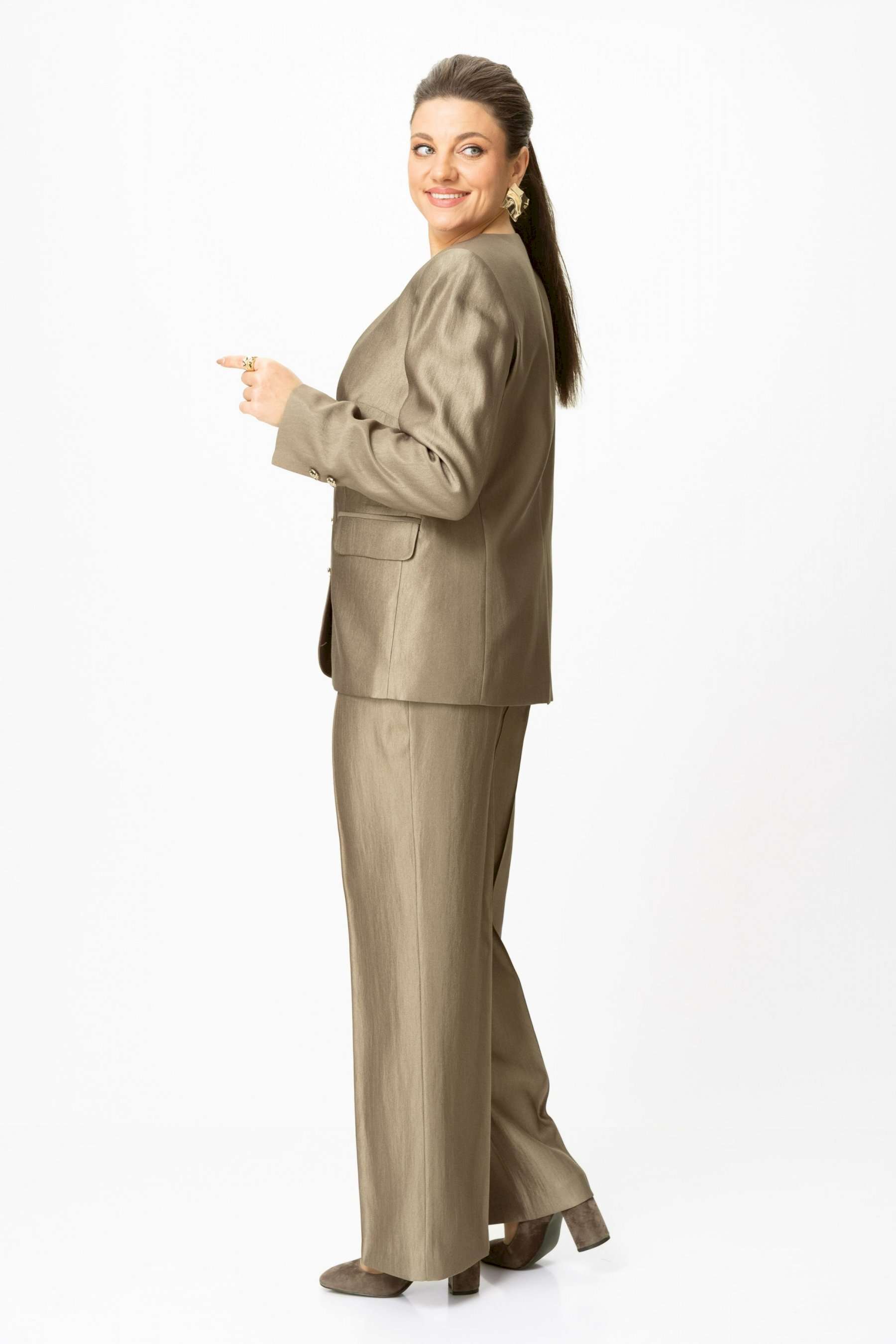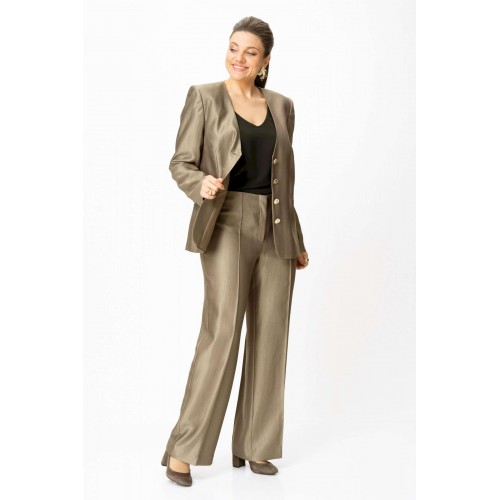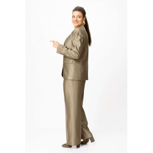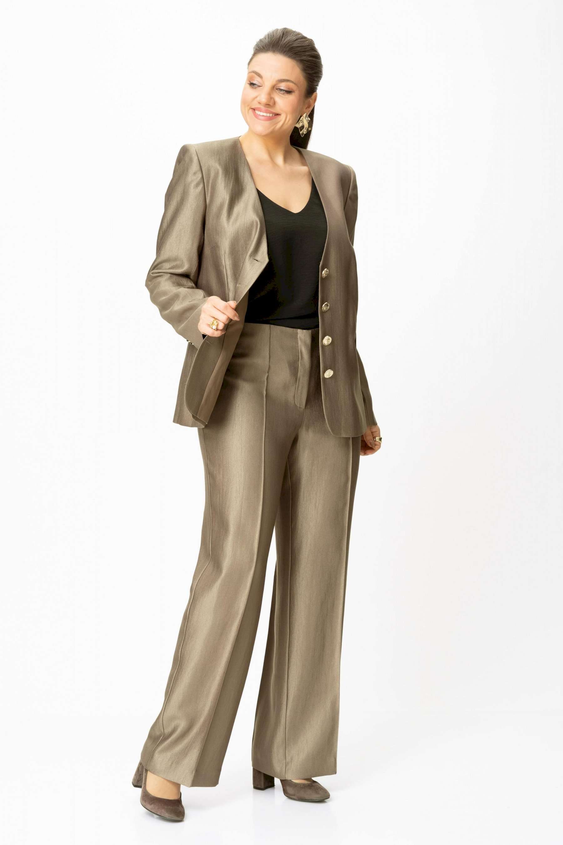 Стильный женский костюм, выполнен в классическом стиле из ткани с небольшим блеском. Костюм состоит из жакета и брюк. Жакет полуприлегающего силуэта, по переду прорезные карманы с клапаном. Горловина «V» образная, застежка центральная на петли-пуговицы. По спинке в центральном шве отлетная шлица по низу. Рукава втачные, по низу отлетная шлица с декором из пуговиц. Жакет на подкладке. Брюки прямые от бедра, с застроченными стрелками по переду и спинке. Застежка по линии банта на молнию и крючок. Верх брюк на обтачке. Длина жакета – 69 см. Длина рукава – 63 см. Длина брюк по боковому срезу – 109 см. Длина брюк по шаговому шву – 82 см.