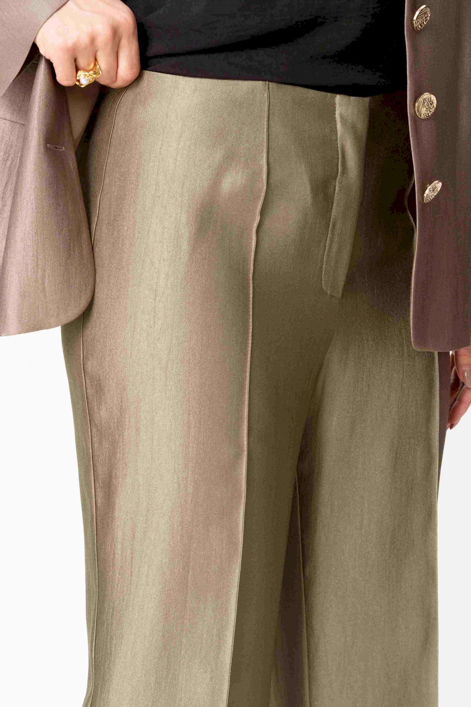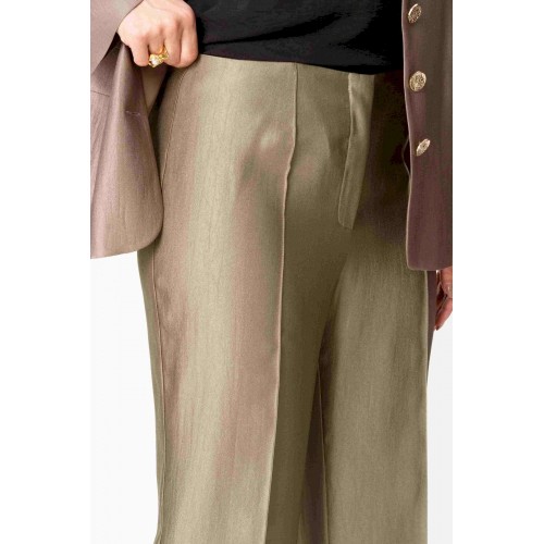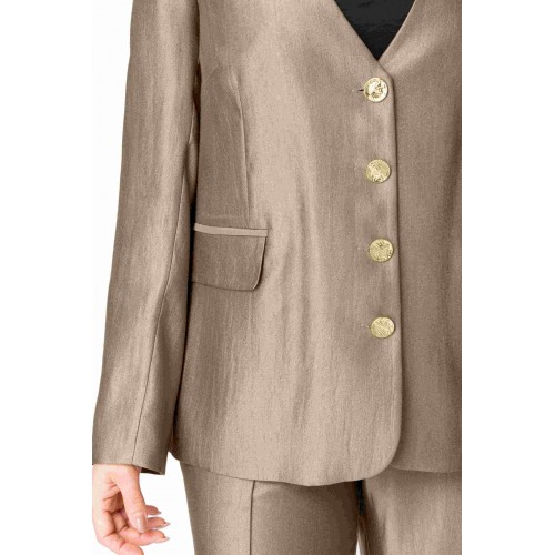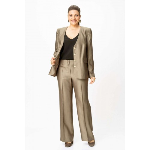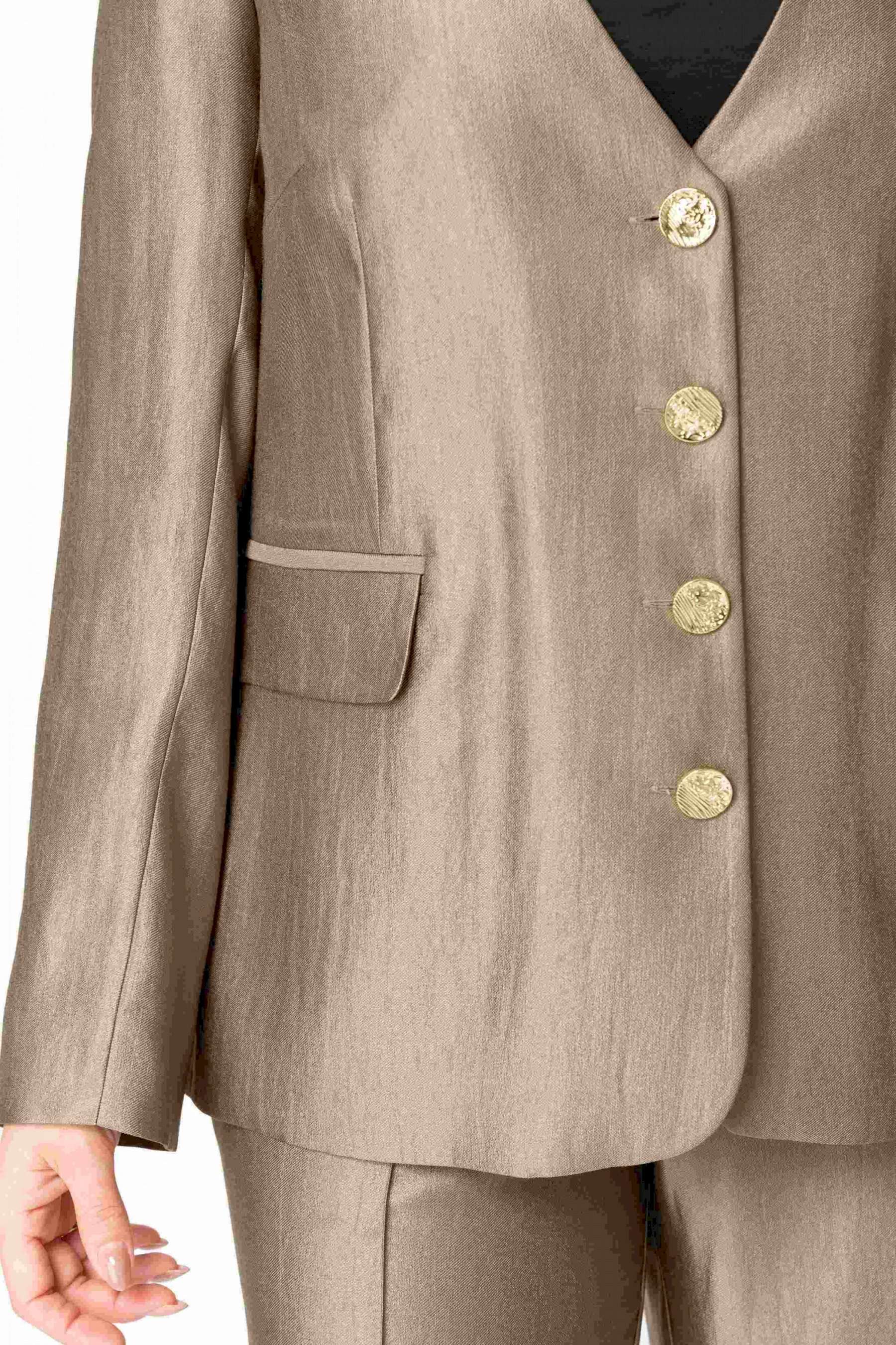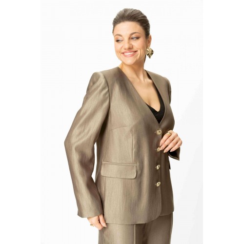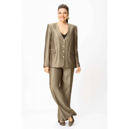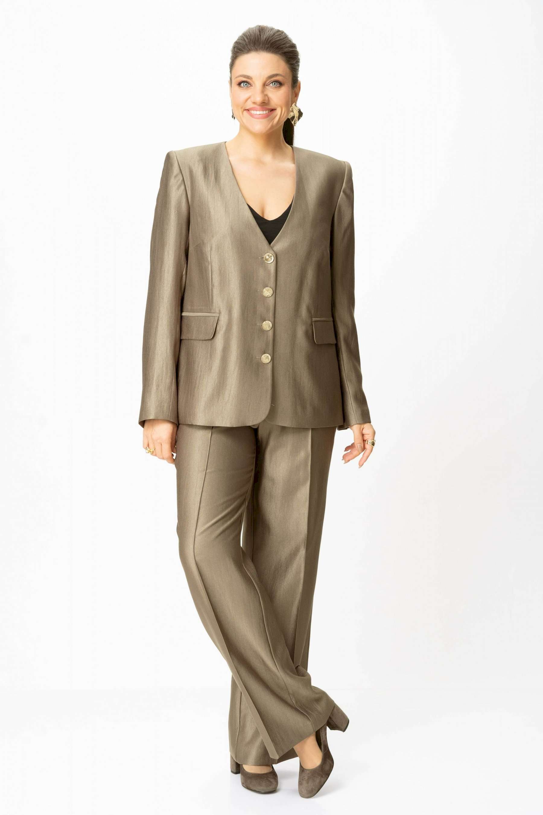 Стильный женский костюм, выполнен в классическом стиле из ткани с небольшим блеском. Костюм состоит из жакета и брюк. Жакет полуприлегающего силуэта, по переду прорезные карманы с клапаном. Горловина «V» образная, застежка центральная на петли-пуговицы. По спинке в центральном шве отлетная шлица по низу. Рукава втачные, по низу отлетная шлица с декором из пуговиц. Жакет на подкладке. Брюки прямые от бедра, с застроченными стрелками по переду и спинке. Застежка по линии банта на молнию и крючок. Верх брюк на обтачке. Длина жакета – 69 см. Длина рукава – 63 см. Длина брюк по боковому срезу – 109 см. Длина брюк по шаговому шву – 82 см.