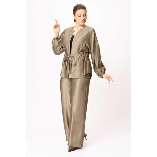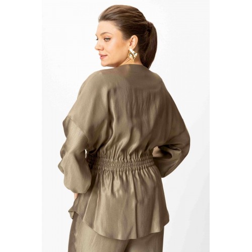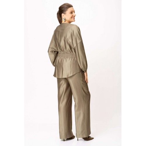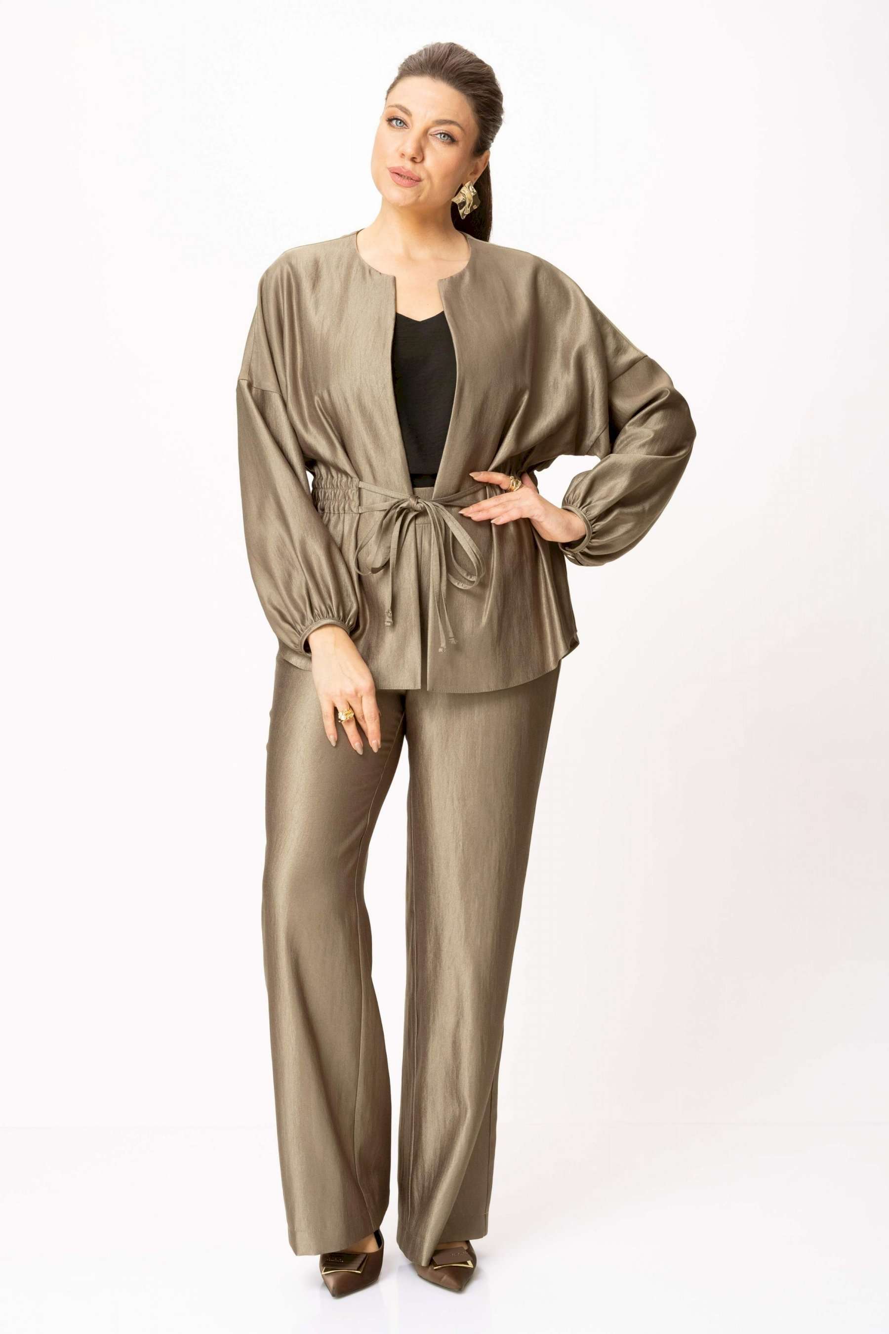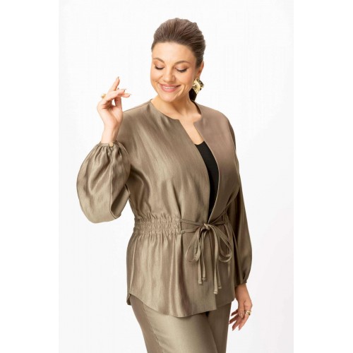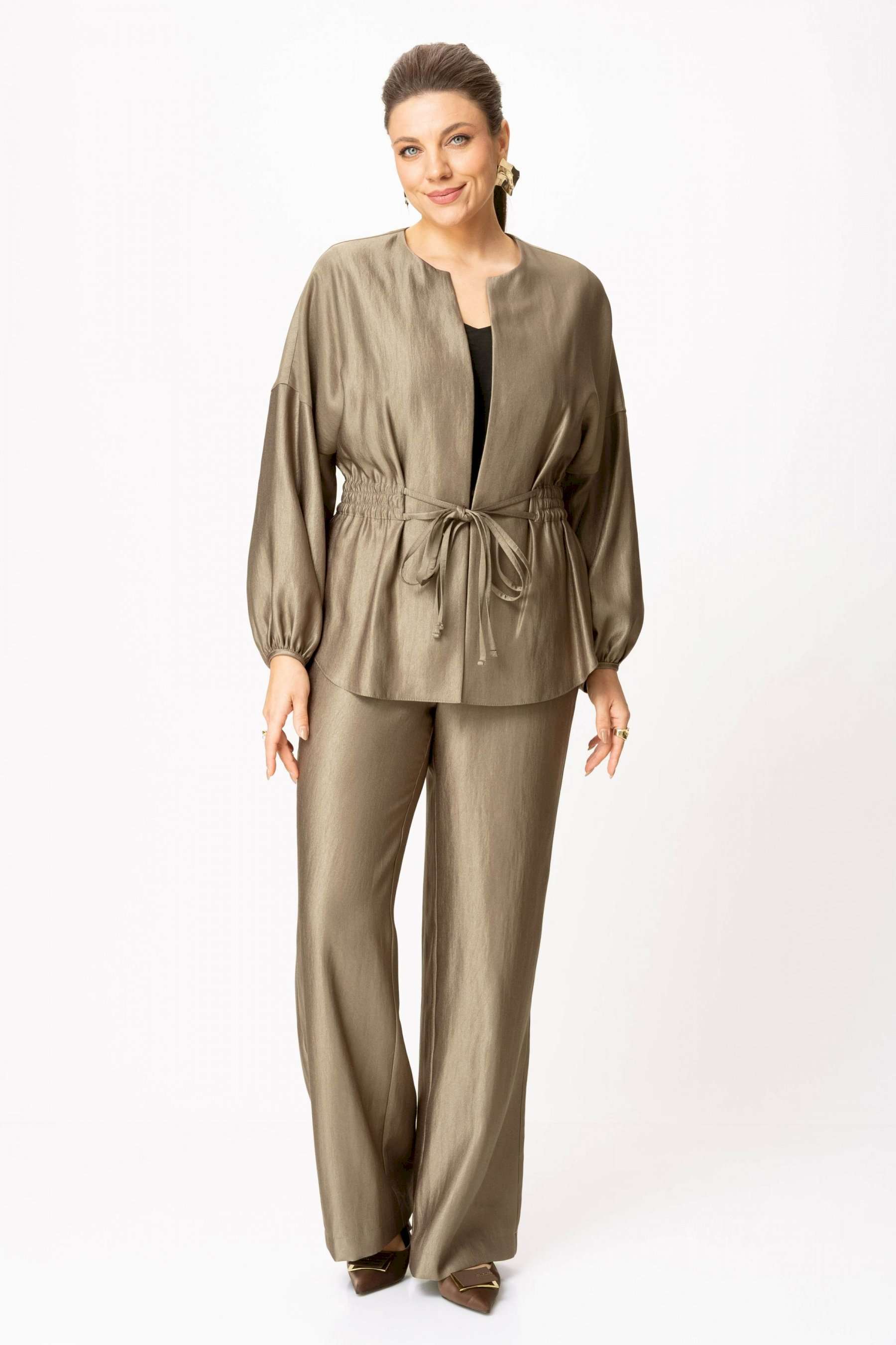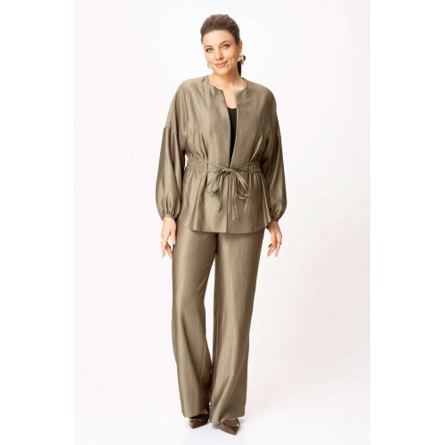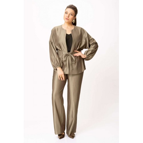 Стильный женский костюм выполнен из ткани с небольшим блеском. Костюм состоит из жакета и брюк. Жакет свободного силуэта со спущенной линией плеча, горловина круглая. Жакет без застежки, фиксируется на уровне талии завязками. Рукава 3/4, со сборкой по низу. Жакет без подкладки. Брюки свободного силуэта, верх брюк на поясе с резинкой. Длина жакета – 74 см. Длина рукава – 38,5 см. Длина брюк по боковому срезу – 112 см.