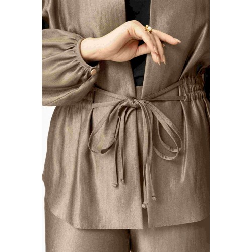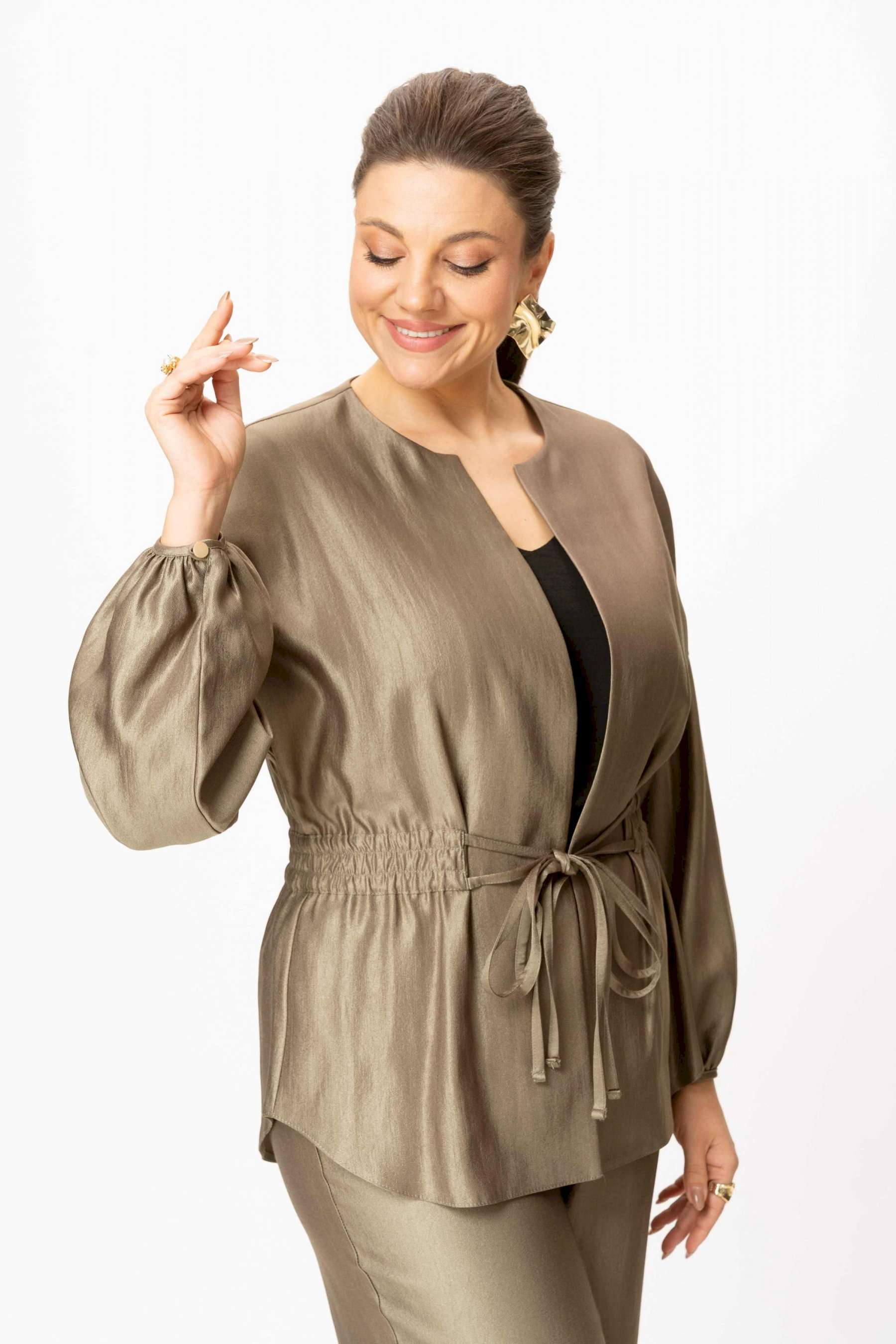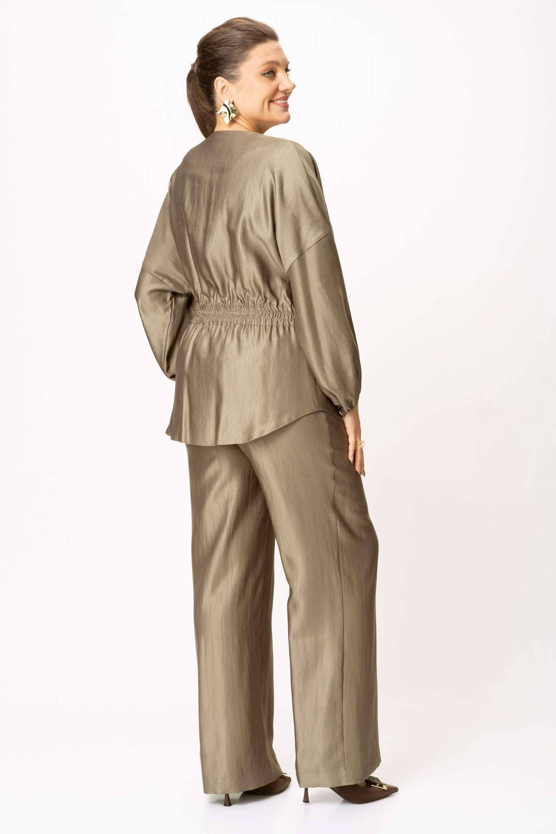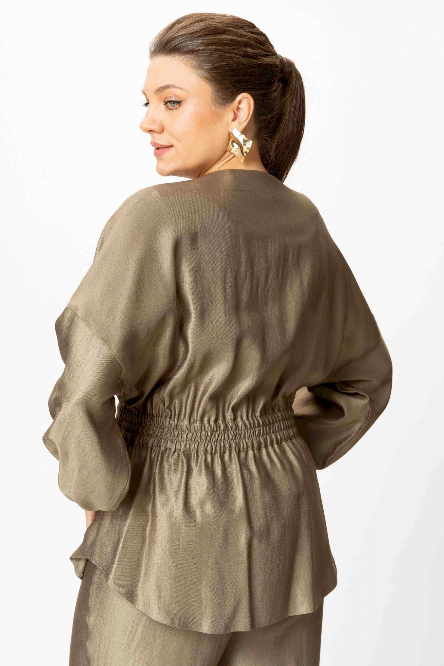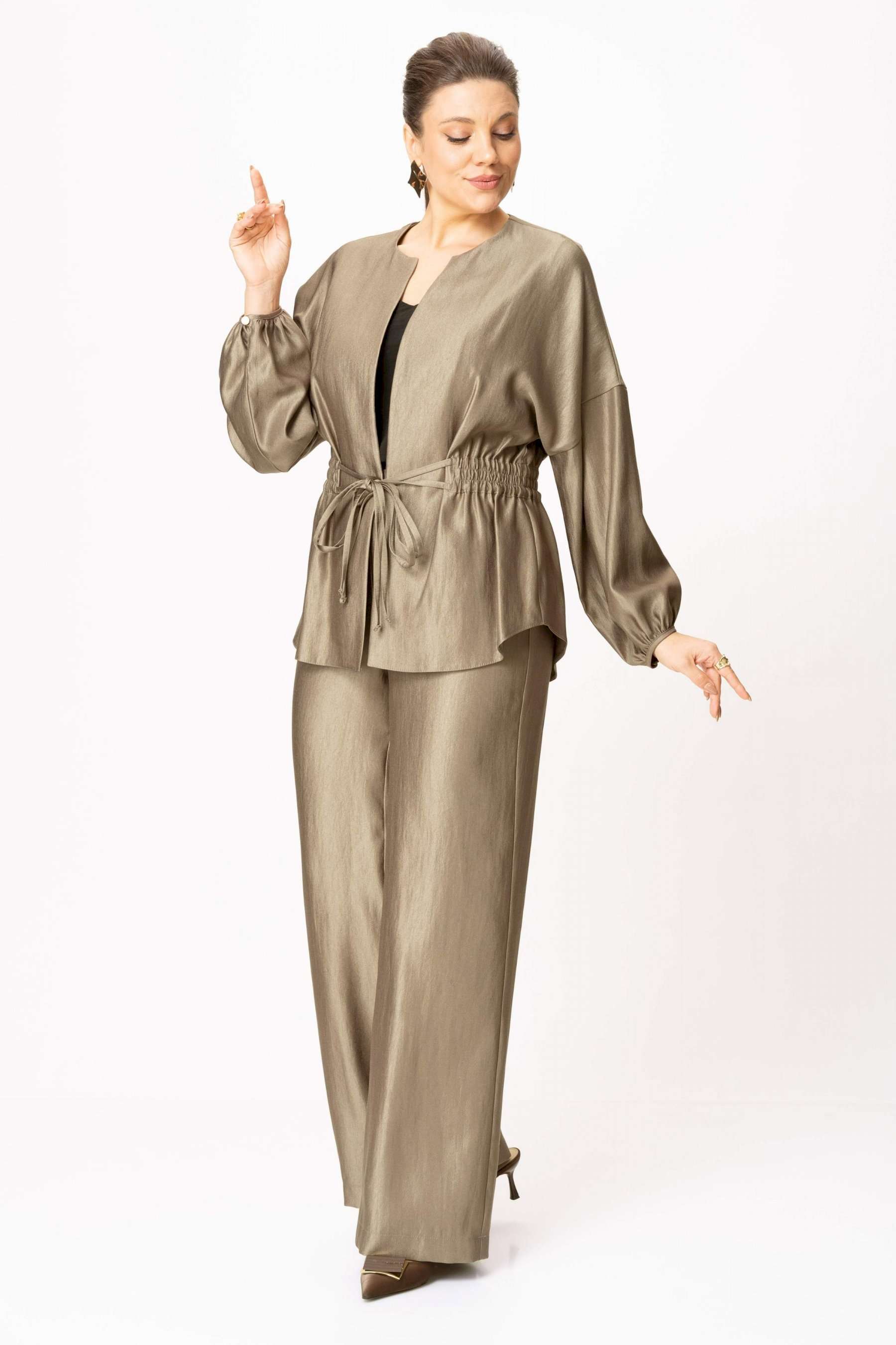 Стильный женский костюм выполнен из ткани с небольшим блеском. Костюм состоит из жакета и брюк. Жакет свободного силуэта со спущенной линией плеча, горловина круглая. Жакет без застежки, фиксируется на уровне талии завязками. Рукава 3/4, со сборкой по низу. Жакет без подкладки. Брюки свободного силуэта, верх брюк на поясе с резинкой. Длина жакета – 74 см. Длина рукава – 38,5 см. Длина брюк по боковому срезу – 112 см.