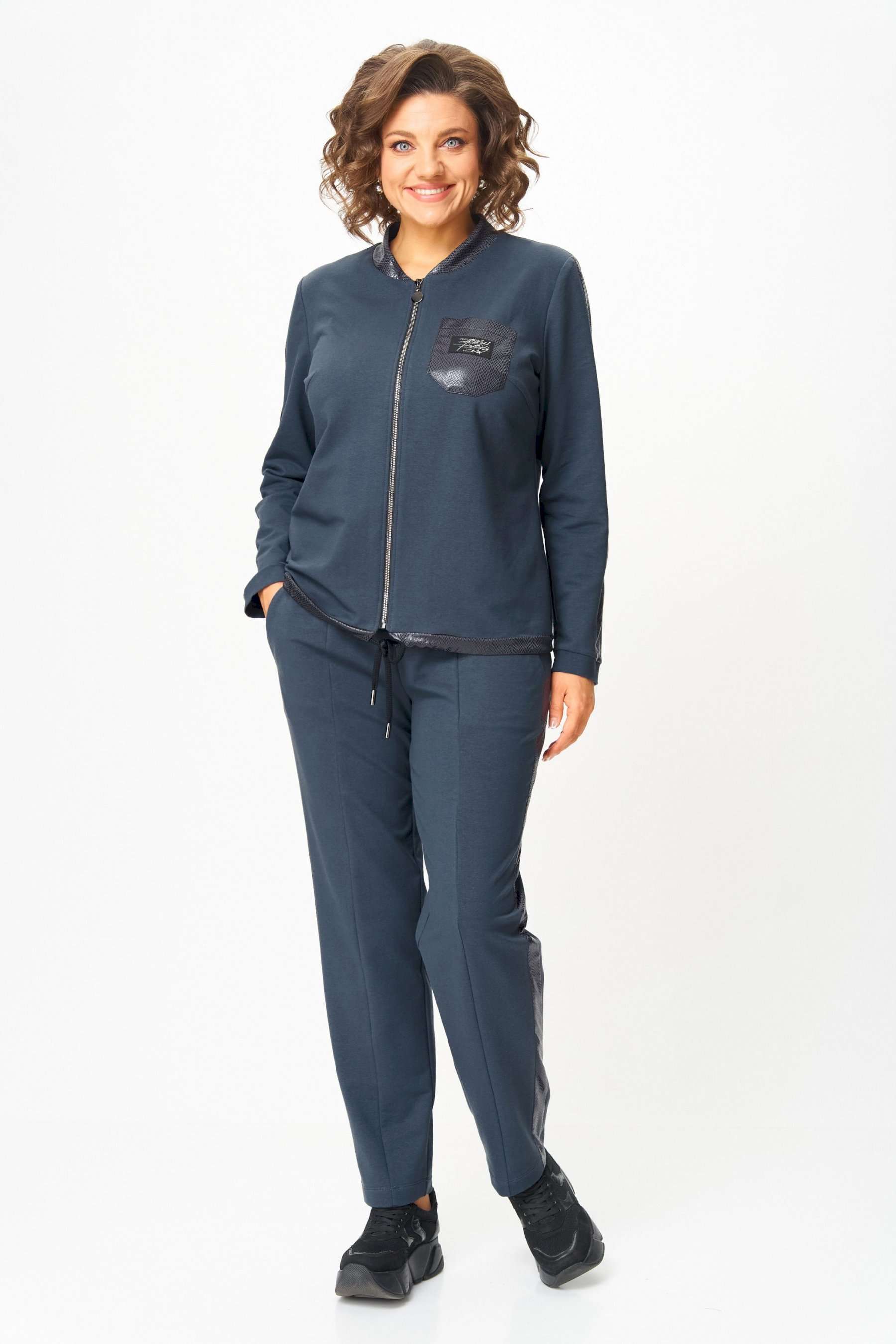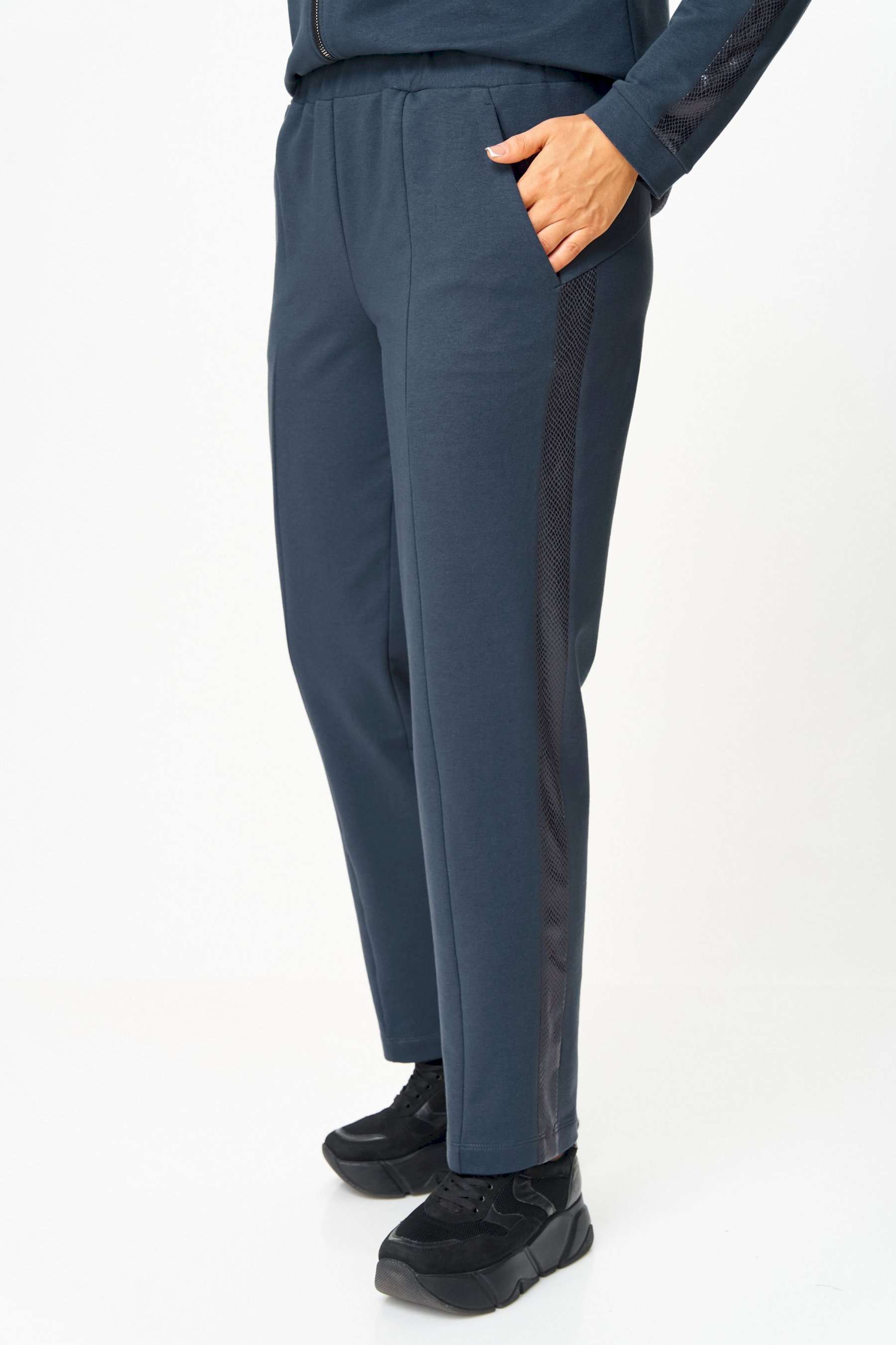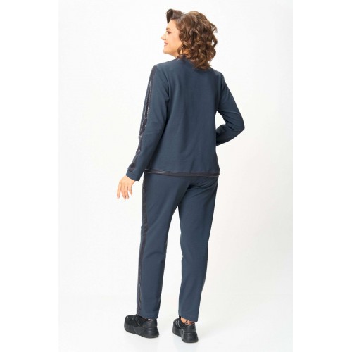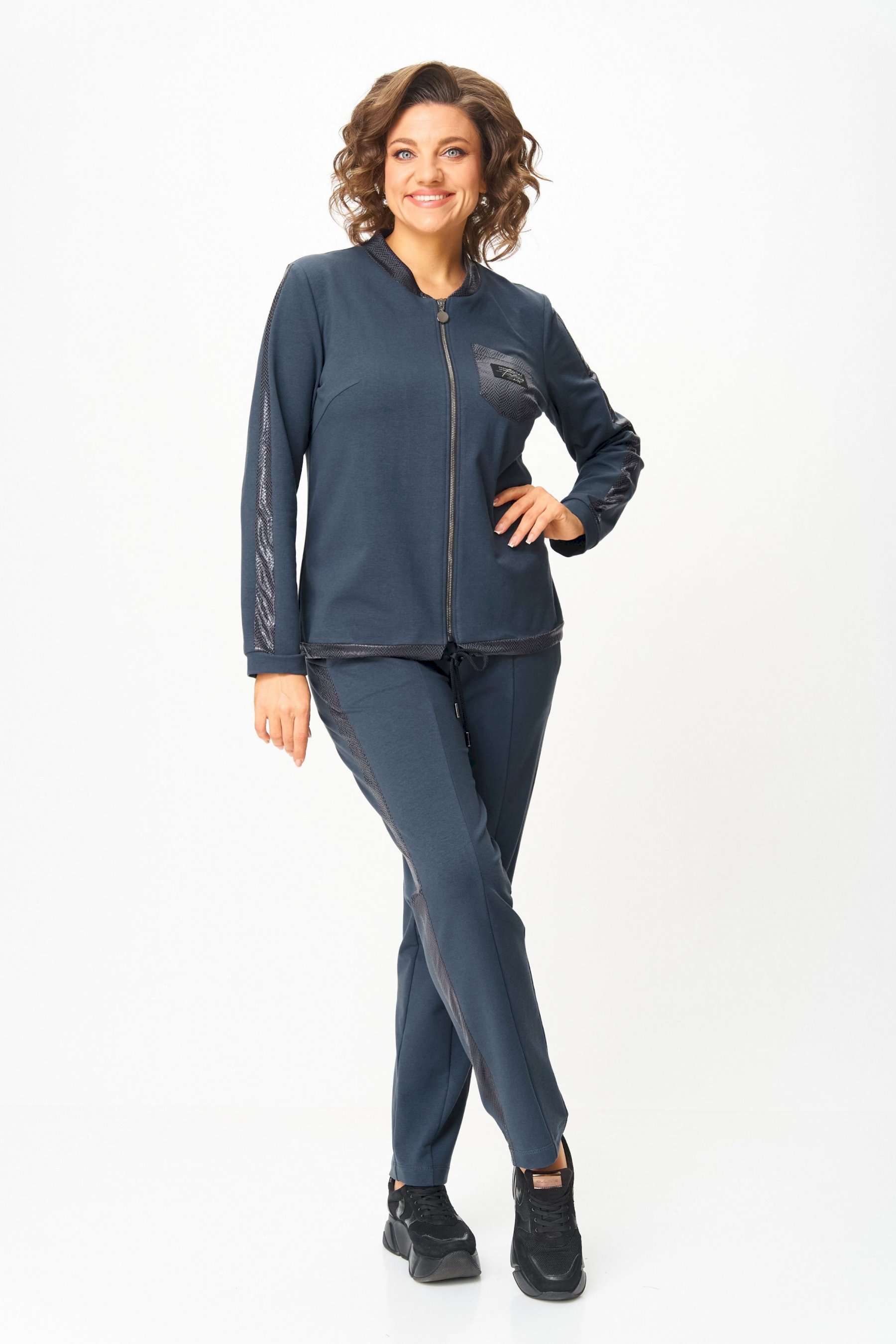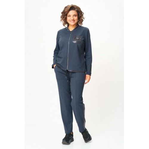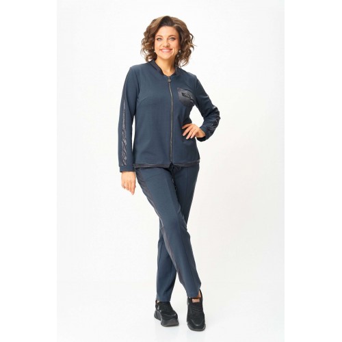 Элементы декора могут меняться. Стильный женский костюм, состоит из блузона и брюк. Костюм выполнен в спортивном стиле. Блузон полуприлегающего силуэта с центральной застежкой на тесьму молнию, с левой стороны на уровне груди фигурный накладной карман с пришивной нашивкой. Горловина оформлена планкой из отделочной ткани. Рукава втачные с отделочным лампасом по центру, низ рукава на манжете из основной ткани. По низу блузона притачная планка с декоративным шнуром. Брюки, зауженные к низу, по верху на задних половинках отрезные кокетки, по боковым швам от кокетки до низа отделочные лампасы, на уровне бедер в швах функциональные карманы. Верх брюк оформлен отрезным поясом с резинкой. Длина блузона по спинке (54-58) – 68.5 см Длина блузона по спинке (60-64) – 70 см Длина рукава блузона - 61,5 см Длина брюк (54-58) - 103 см Длина брюк (60-64) - 105 см