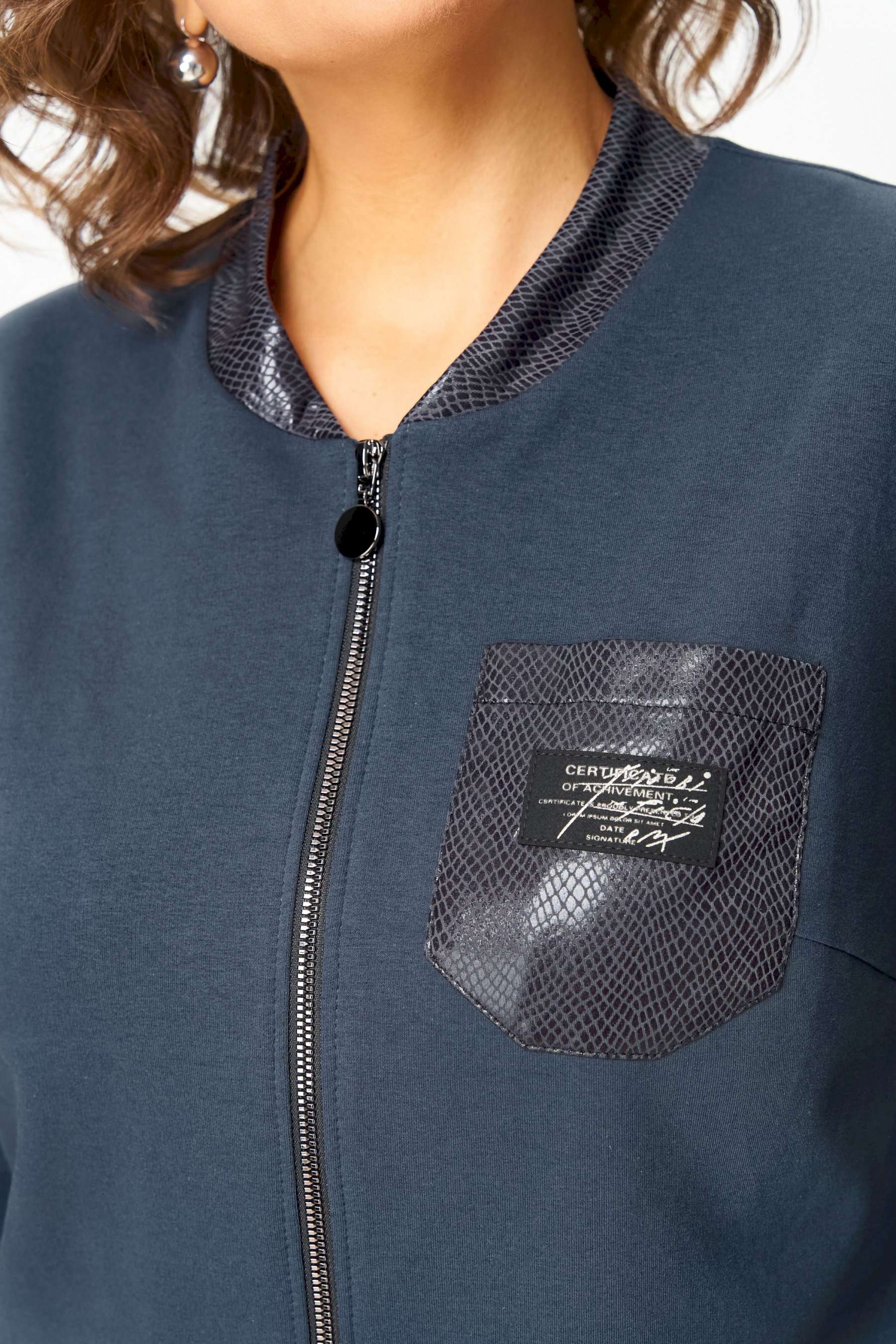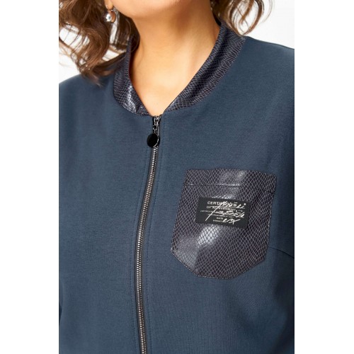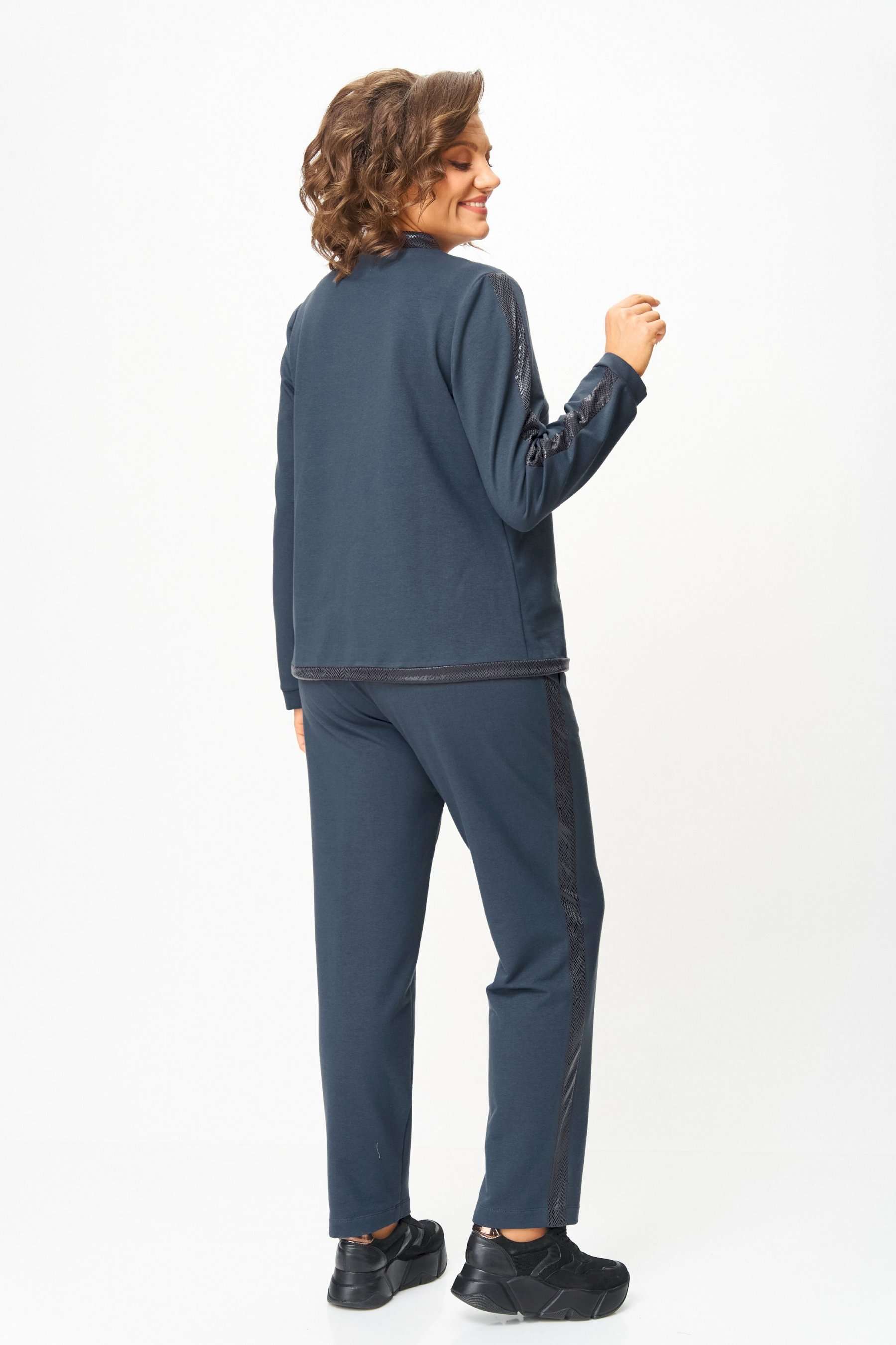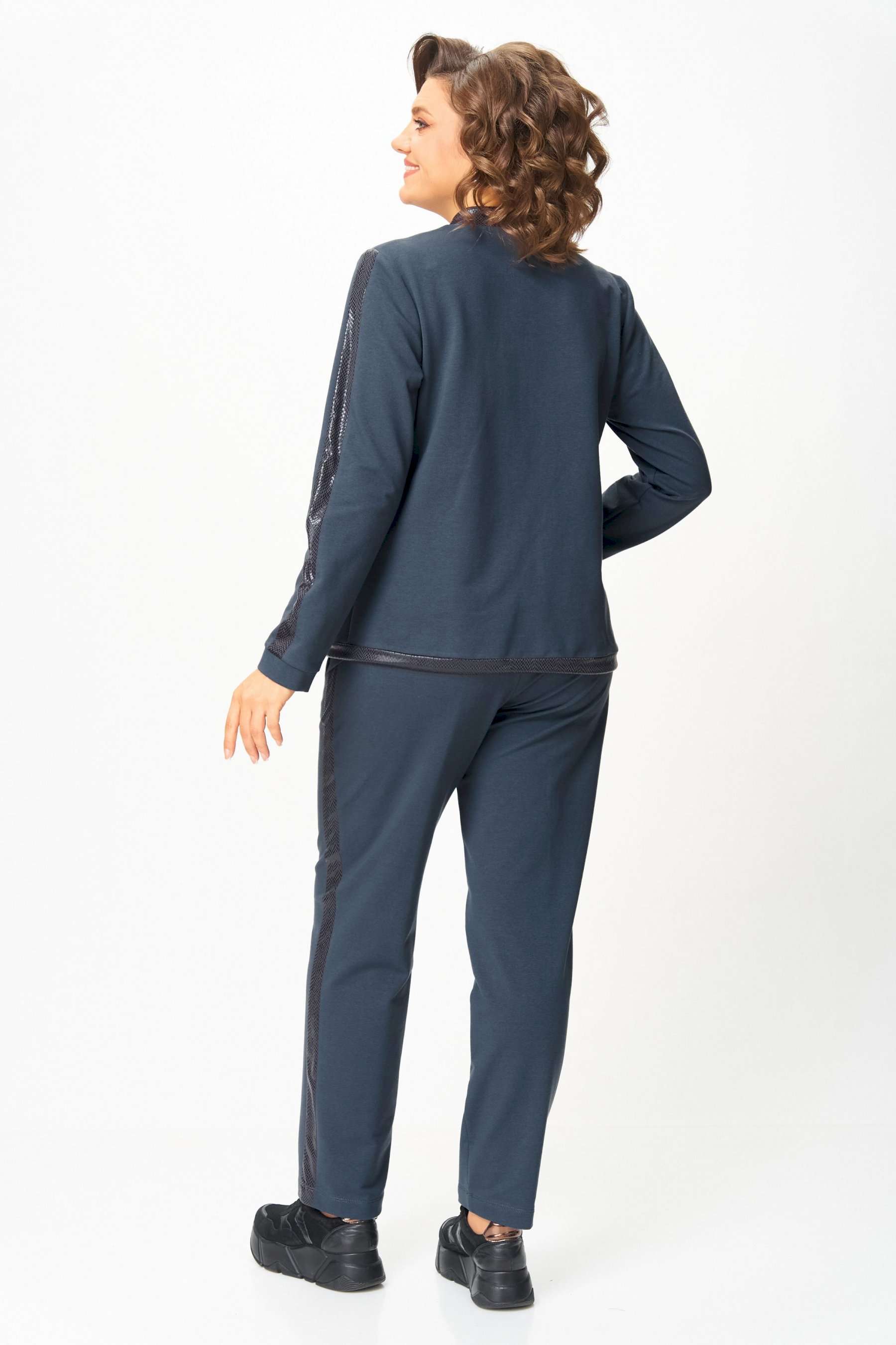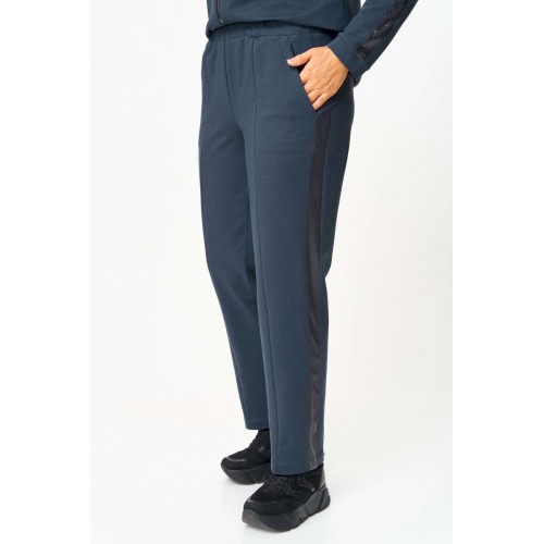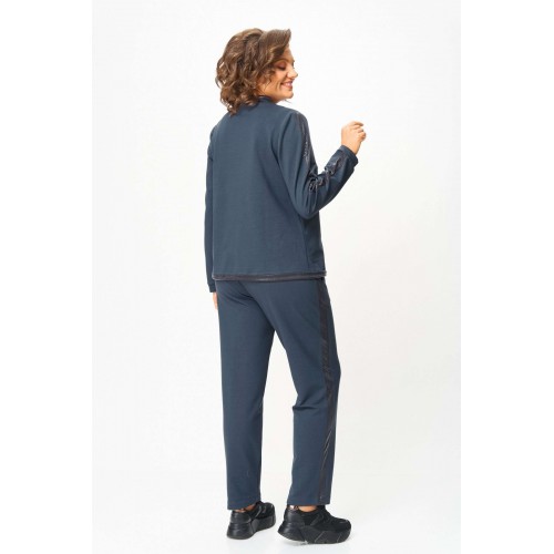 Элементы декора могут меняться. Стильный женский костюм, состоит из блузона и брюк. Костюм выполнен в спортивном стиле. Блузон полуприлегающего силуэта с центральной застежкой на тесьму молнию, с левой стороны на уровне груди фигурный накладной карман с пришивной нашивкой. Горловина оформлена планкой из отделочной ткани. Рукава втачные с отделочным лампасом по центру, низ рукава на манжете из основной ткани. По низу блузона притачная планка с декоративным шнуром. Брюки, зауженные к низу, по верху на задних половинках отрезные кокетки, по боковым швам от кокетки до низа отделочные лампасы, на уровне бедер в швах функциональные карманы. Верх брюк оформлен отрезным поясом с резинкой. Длина блузона по спинке (54-58) – 68.5 см Длина блузона по спинке (60-64) – 70 см Длина рукава блузона - 61,5 см Длина брюк (54-58) - 103 см Длина брюк (60-64) - 105 см