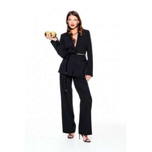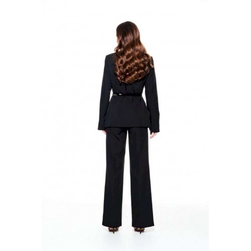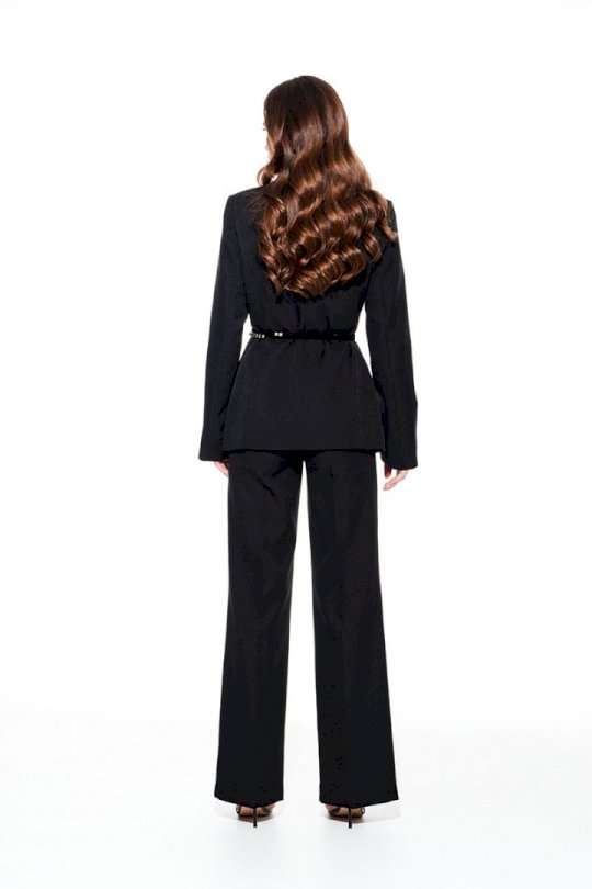 Комплект из костюмно-плательной ткани, 2-предметный, состоящий из жакета и брюк. Жакет умеренного объема, приталенного силуэта, однобортный, с центральной застежкой на петли и пуговицы, с фигурным вырезом горловины, на подкладке. Детали переда с талиевыми вытачками и прорезными карманами с двумя обтачками. Рукав втачной, двухшовный, длинный, с разрезом. В комплекте декоративный пояс из бархата на трикотажной основе с бусинами. Брюки умеренного объема, прямого силуэта. На передних и задних половинках заутюжены стрелки. На передних половинках выполнены боковые карманы с отрезным бочком. Задние половинки с талиевыми вытачками. Застежка – гульфик на молнии. Пояс притачной, с резинкой по спинке, застежкой на крючок и потайную пуговицу.