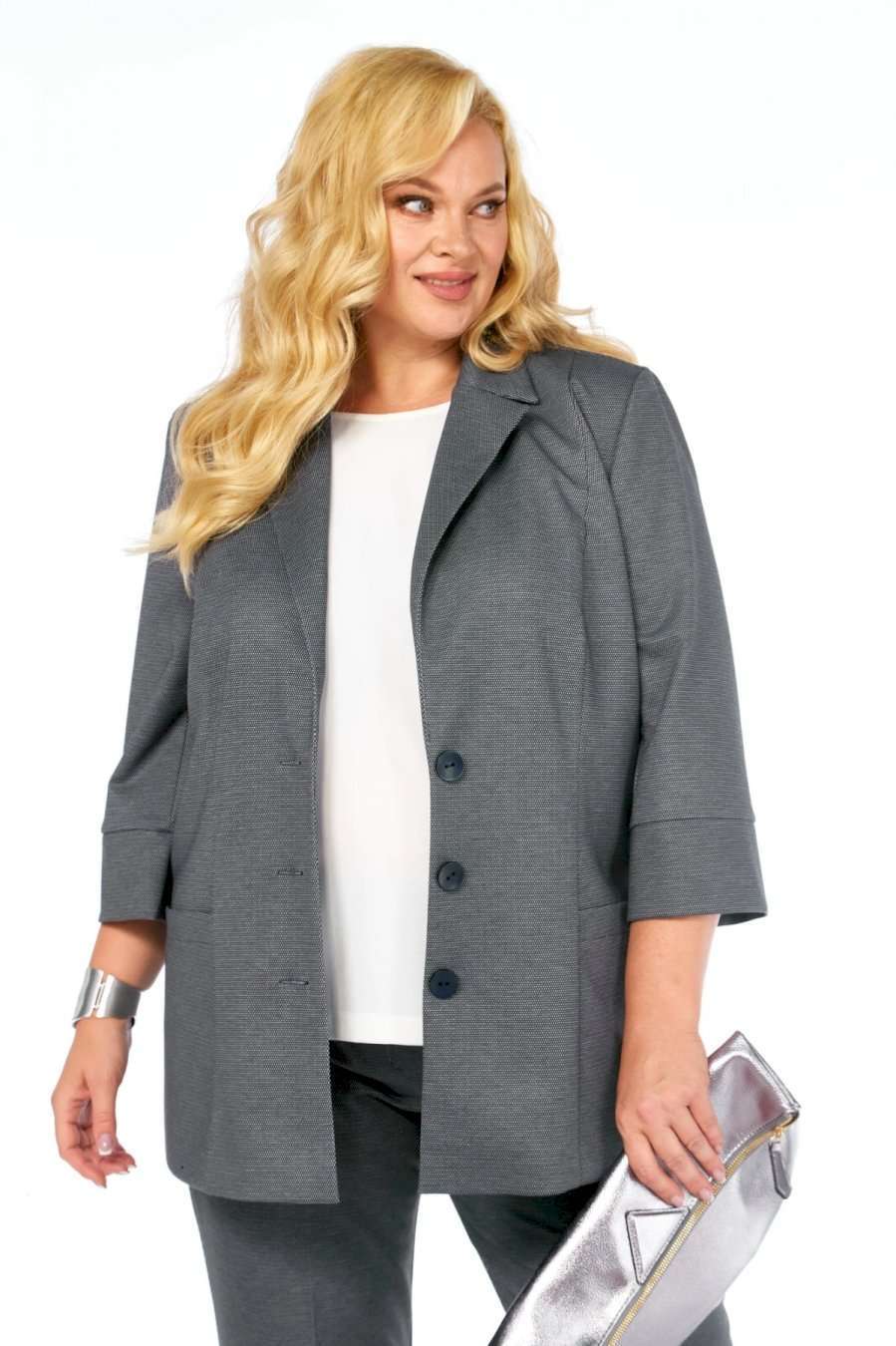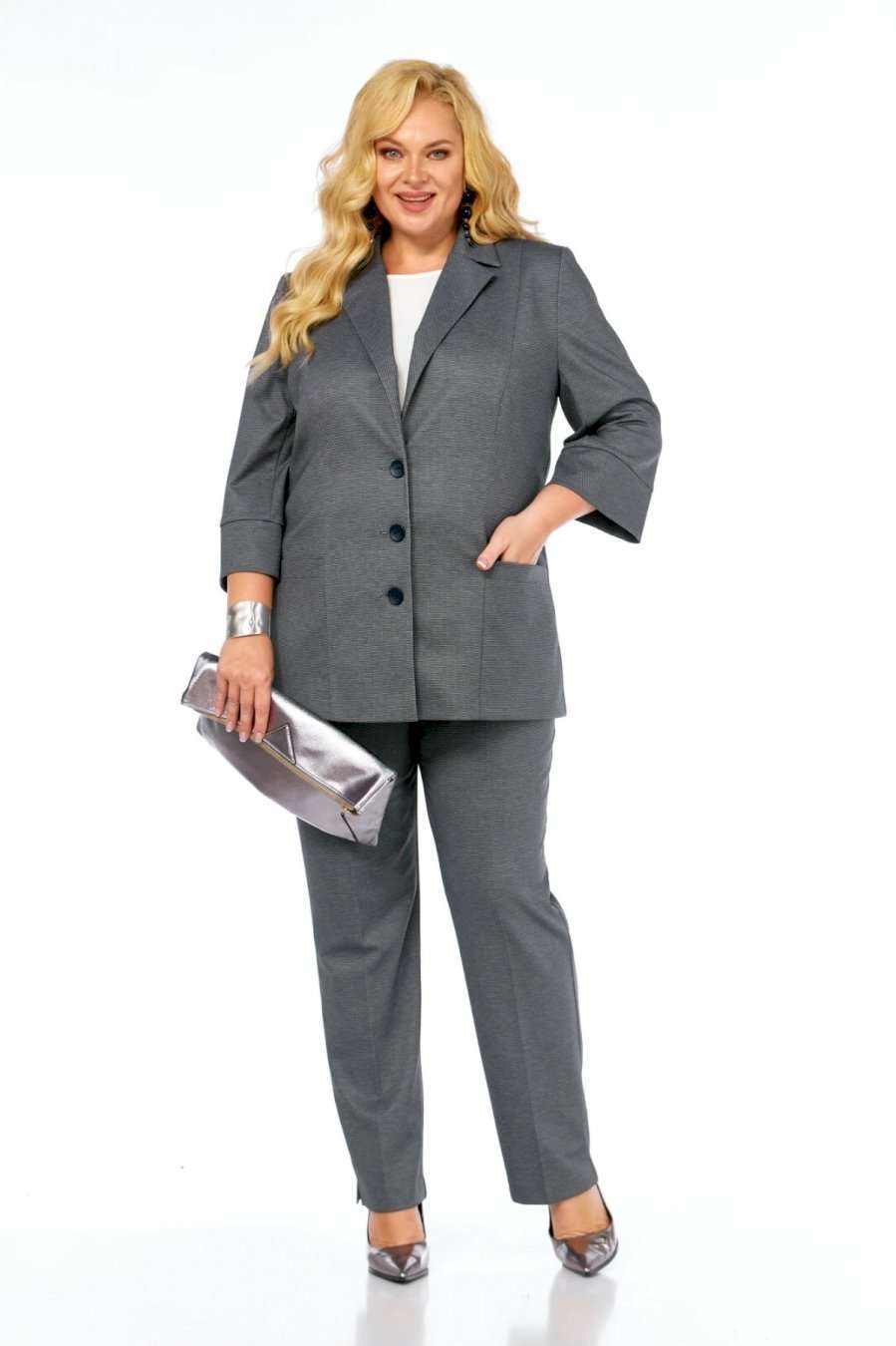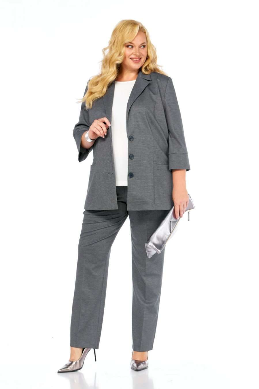 Комплект тройка, состоит из жакета, блузки и брюк, выполнен из трикотажной ткани. Жакет полуприлегающего силуэта с центральной бортовой застежкой на петли и пуговицы. Полочки обработаны подкладкой. Горловина V-образной формы. Полочка с накладными карманами. Рукав втачной, укороченный на притачной манжете. Блуза прямого силуэта с нагрудными вытачками, спущенной линией плеча. Низ ассиметричный в боковых швах имеются разрезы. Брюки классические с заутюженными стрелками, слегка зауженные к низу, оформлены притачным поясом, частично на резинке. Пояс притачной, частично на резинке, это обеспечивает комфортную посадку. Застежка спереди брюк на молнию и петлю-пуговицу.