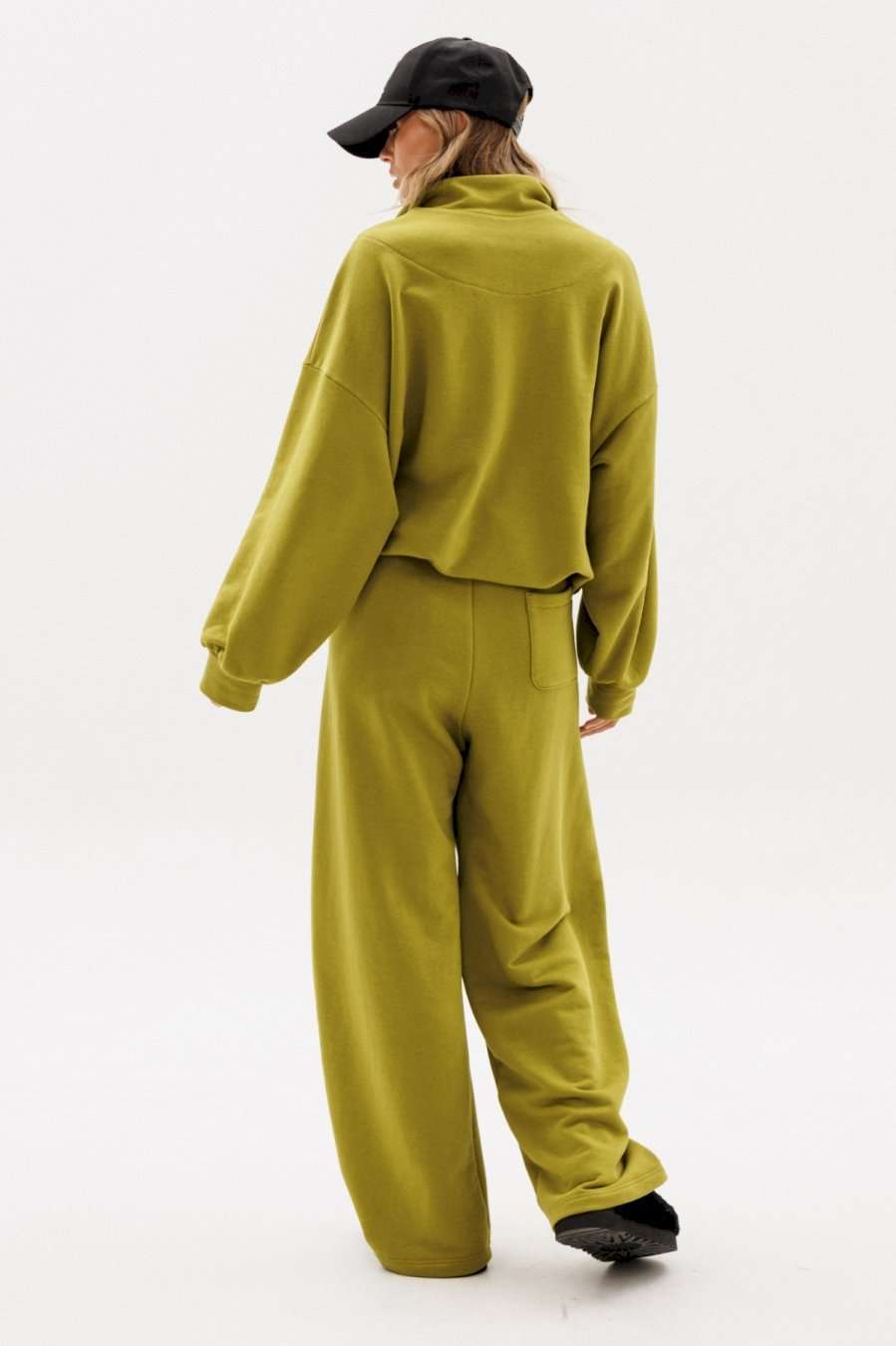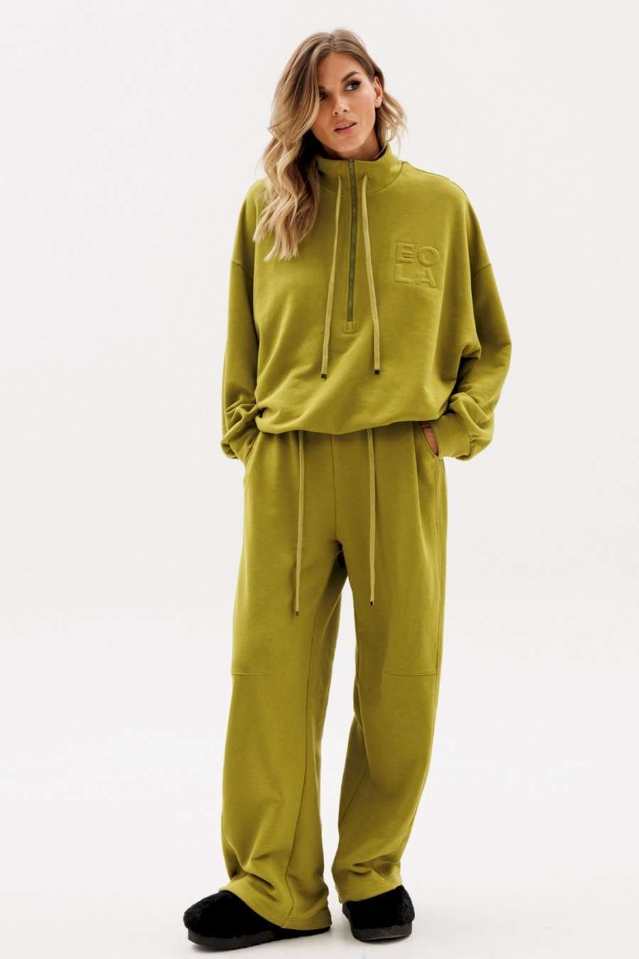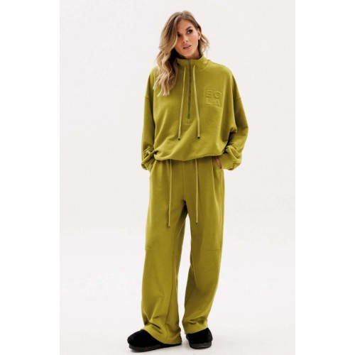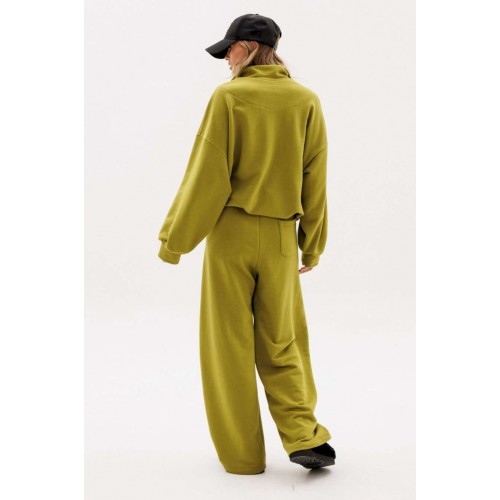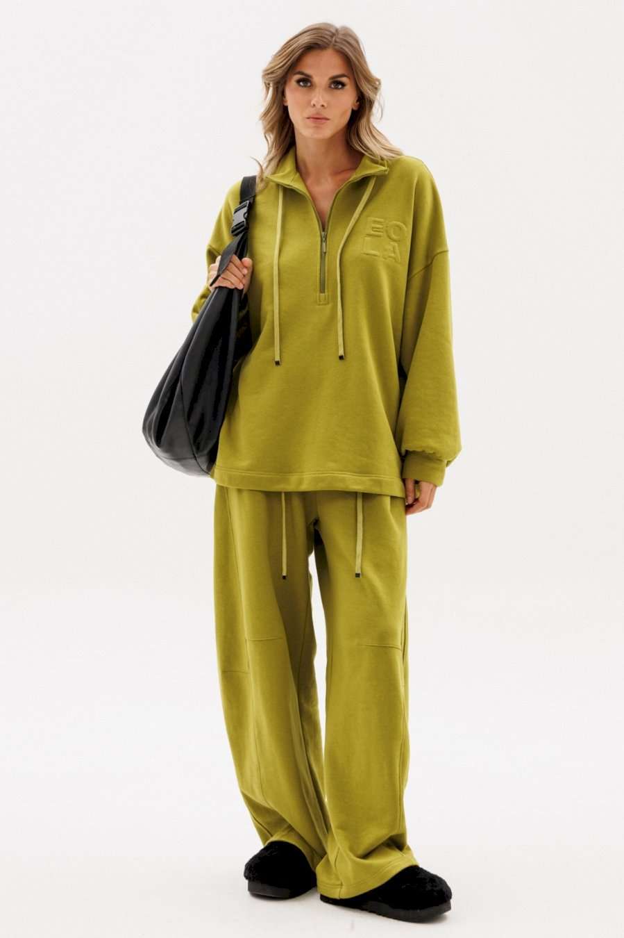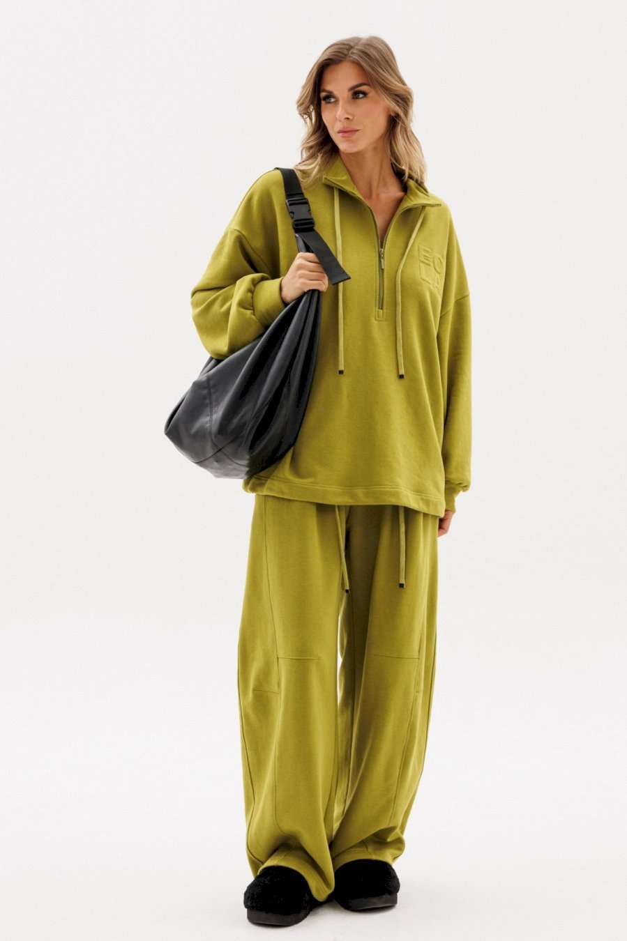 Комплект: джемпер+брюки. Комплект выполнен из трикотажного полотна. Джемпер прямого силуэта, покроя "oversize" длиной до линии бедер. Спереди застежка на молнию. Воротник-стойка. Плечевой шов удлинен. Рукав рубашечного покроя, одношовный, расширенный и присборенный к низу. Низ рукава на притачной манжете. Низ джемпера на эластичной тесьме с фиксаторами. Джемпер декорирован вышивкой по переду. Брюки прямого силуэта, длиной в пол, на притачном поясе с эластичной тесьмой. Спереди боковые карманы с фигурным входом, петли в поясе, в которые втянут шнур из основной ткани, коленные вытачки, складки. Сзади справа накладной карман. Длина джемпера: р. 44-48 - 68,5 см, р. 50-54 - 70 см. Длина рукава от горловины: р. 44-48 - 77,5 см, р. 50-54 - 78,5 см. Длина брюк: р. 44-48 - 107 см, р. 50-54 - 108,5 см. Гарантийный срок не установлен ГОСТ 31409 - 2009