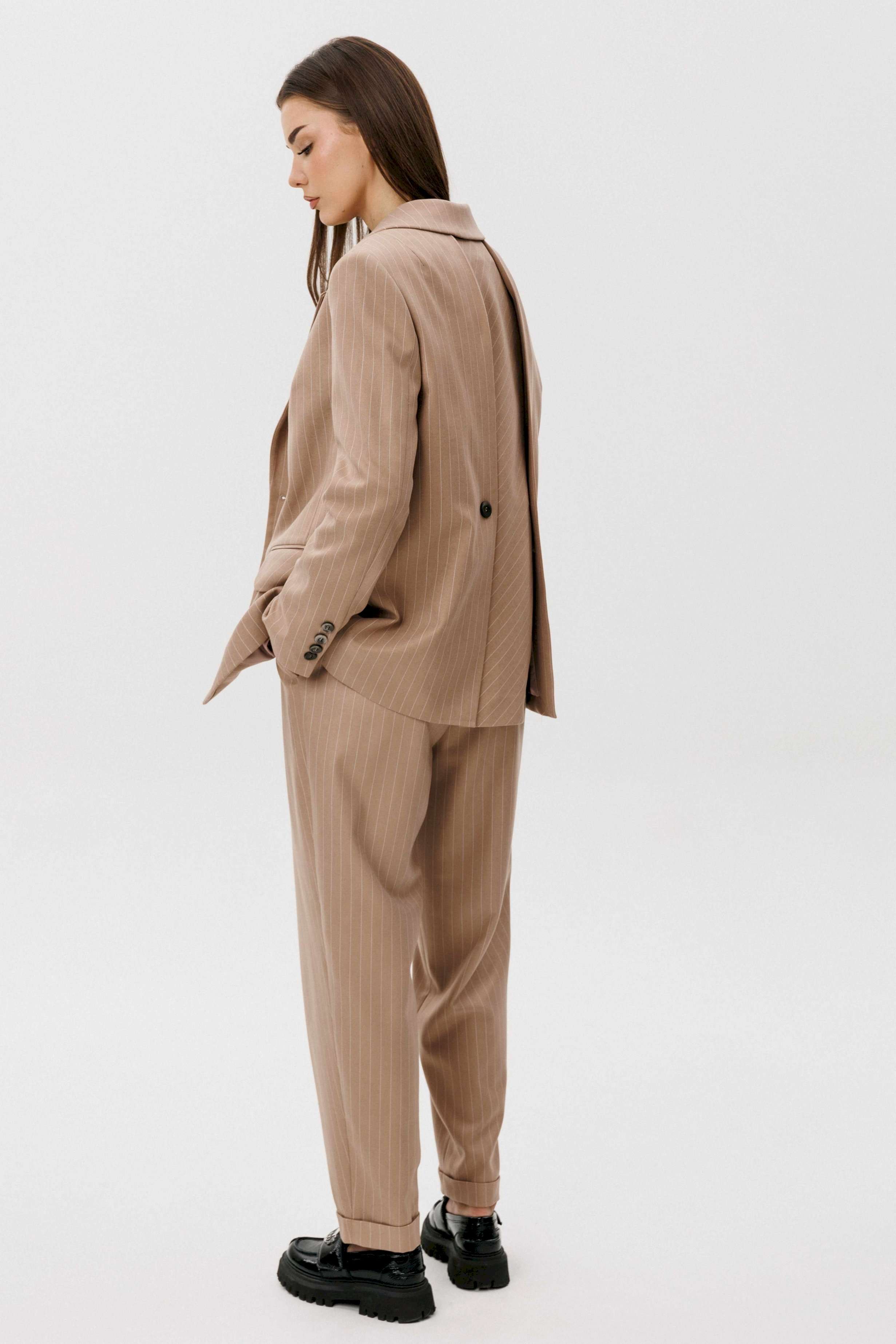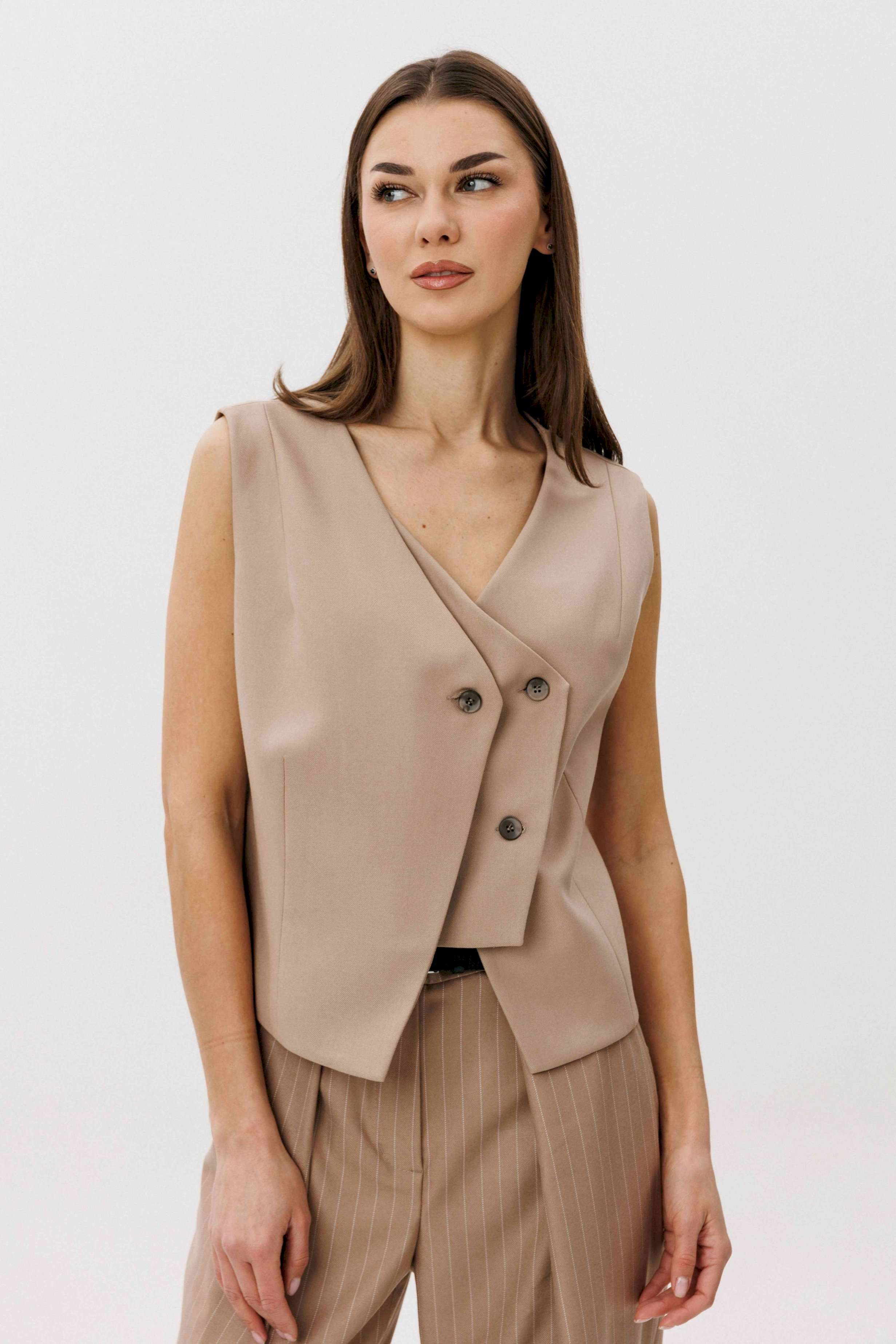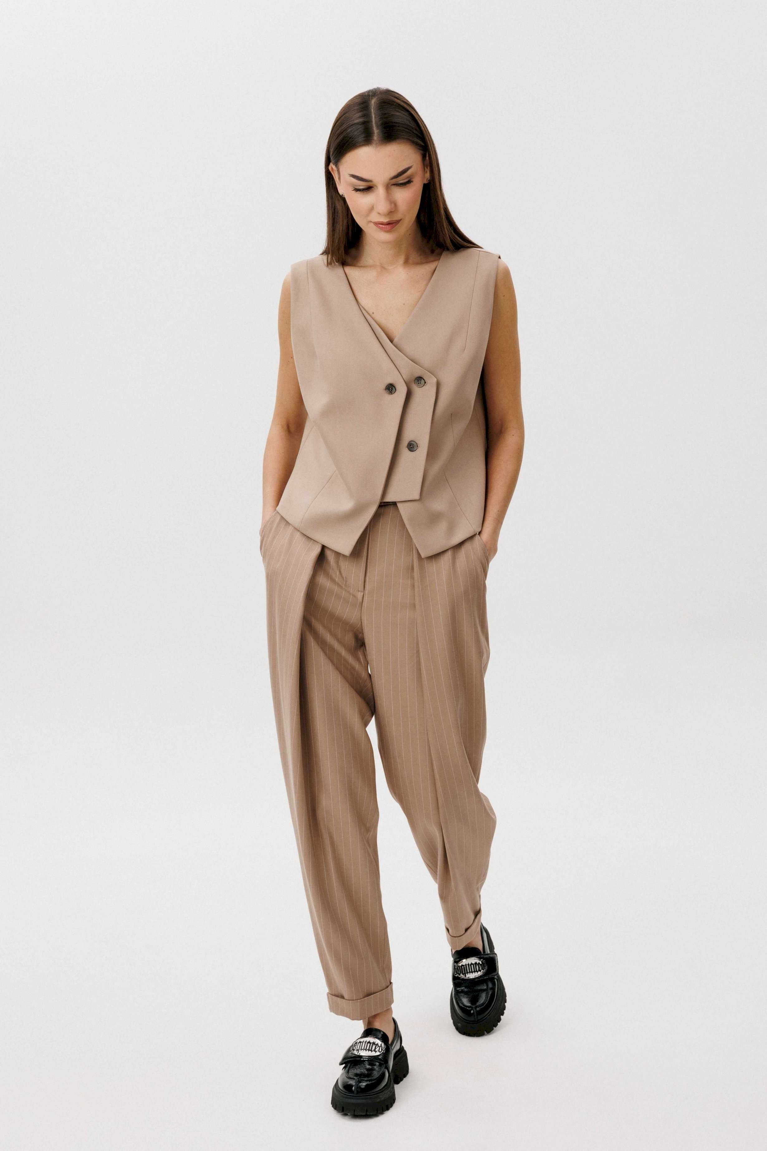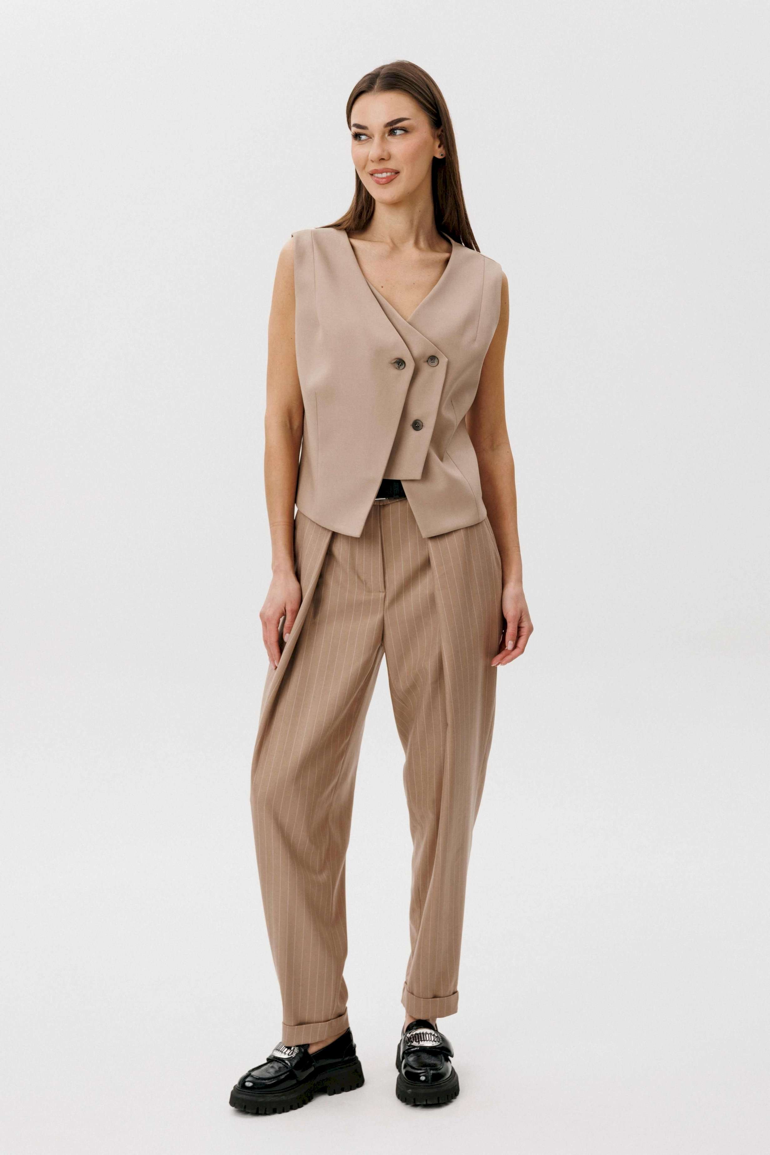 Прилежный officecore с накрахмаленными до хруста воротничками, начищенными до блеска \"\" оксфордами\"\" и портфелями, набитыми под завязку документами, официально отменяется. Офисный look образца 2025 выглядит так, словно его пропустили через шредер, а затем собрали заново. Невероятная тройка-как воплощение нового видения на классический костюм. Жакет свободного упрямленного силуэта, втачного покроя, со смещенной застежкой и классическим английским воротником. Полочка с нагрудной вытачкой от линии лацкана, меняющей направление полоски в верхней части, прорезным карманом с рамкой и клапаном. Спинкка с плечевой вытачкой и двумя необычными шлицами, идущими от горловины спинки, фиксирующимися пуговицами в области талии. Центральная часть спинки в диагональном направлении. Рукав двухшовный с отлетной шлицей и пуговицами. Жилет полуприлегающий, со сложным фигурным бортом, отрезным бочком, нагрудной вытачкой и средним швом и рельефом по спинке. Брюки современного кроя, свободные вверху и зауженные к низу на притачном поясе со шлевками, эластичном в области спинки. Передние половинки брюк с наклонным боковым карманом и большой односторонней складкой, визуально преобразующей прямую полоску в наклонную от центра передних половинок к боковому шву. Задние половинки брюк с талиевыми вытачками. По низу брюк-цельнокроеный манжет. Длина жакета около 67 см. Длина рукава около 62 см. Длина жилета около 54 см. Длина брюк около 100 см.