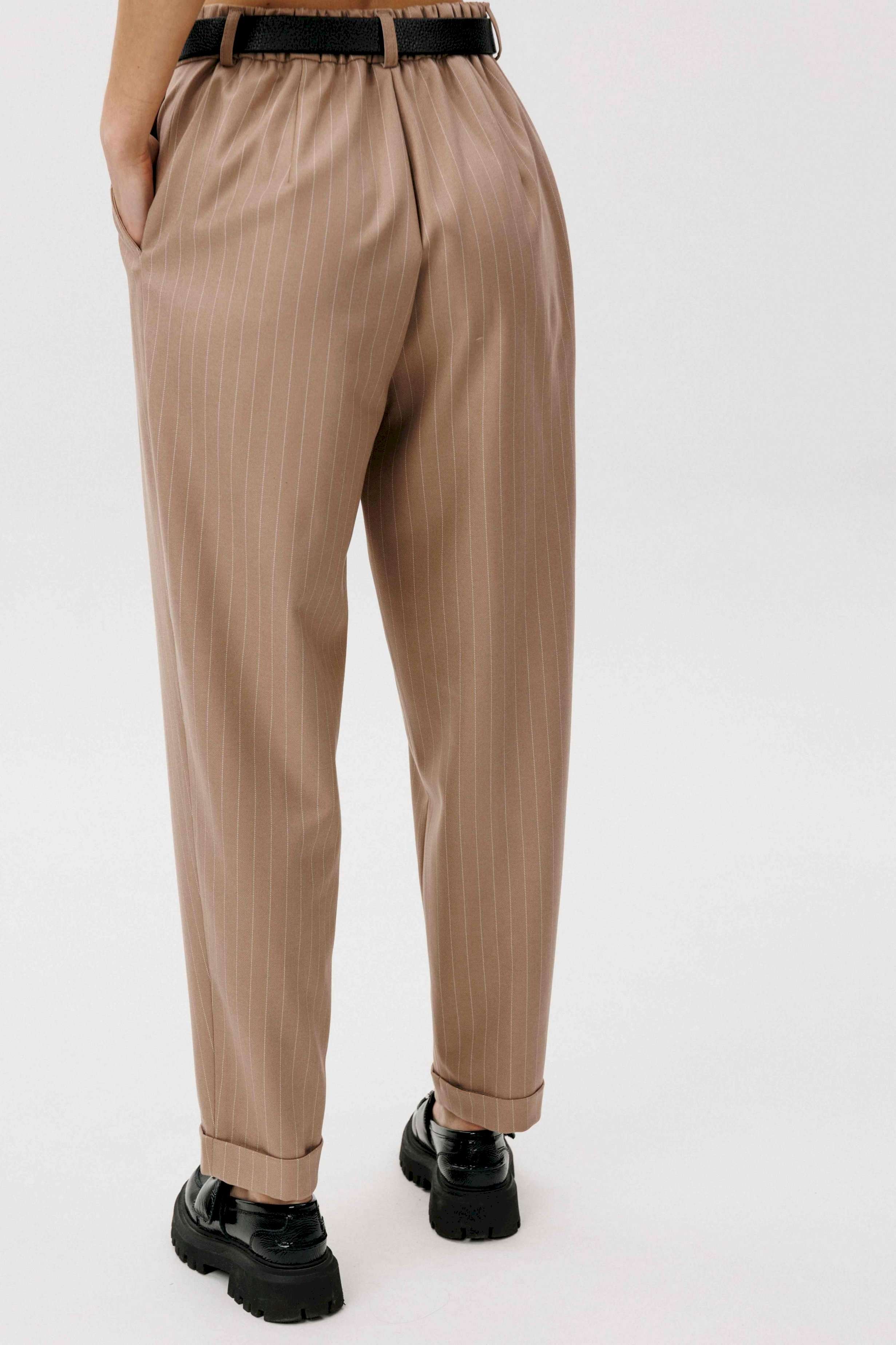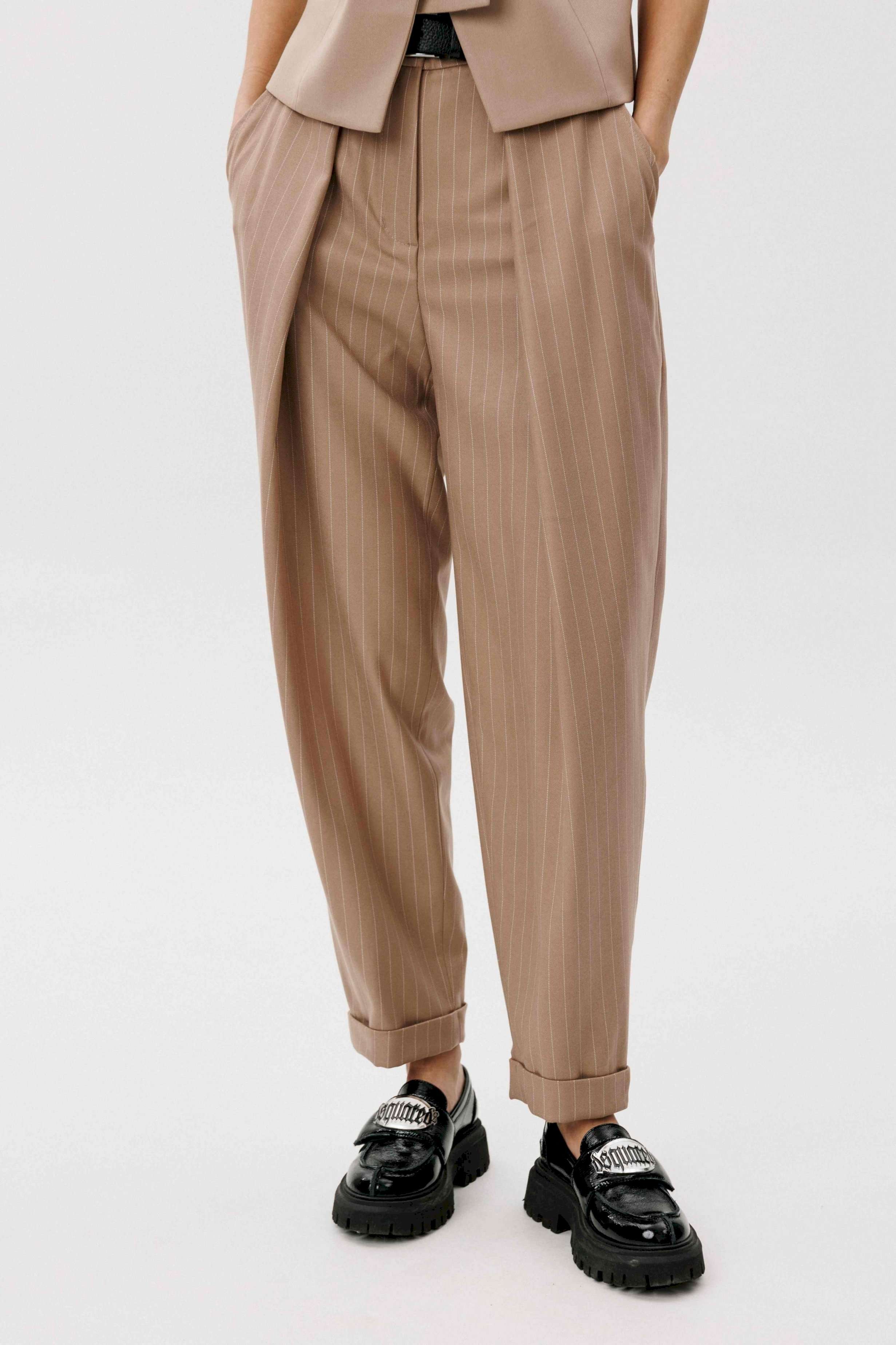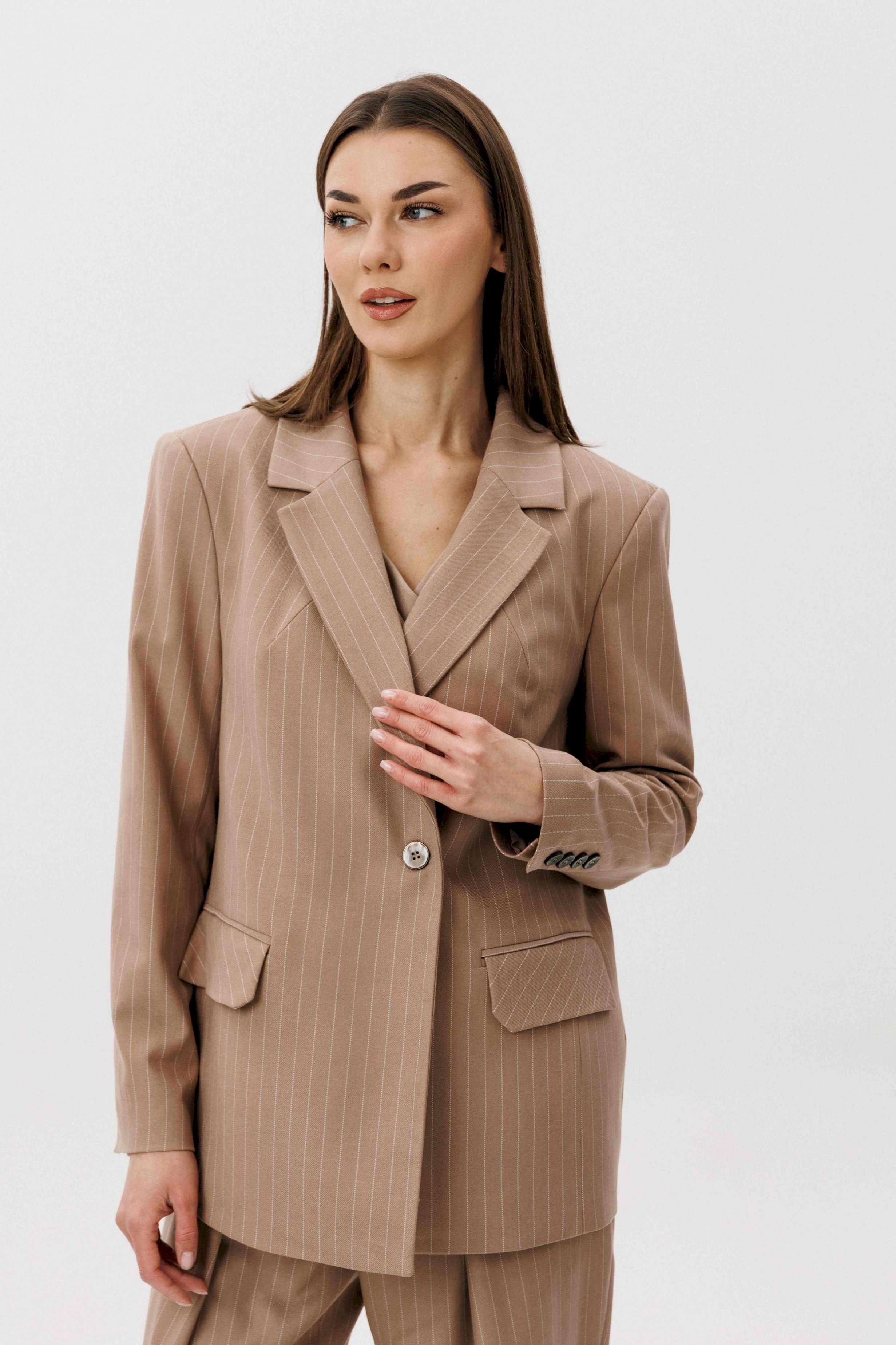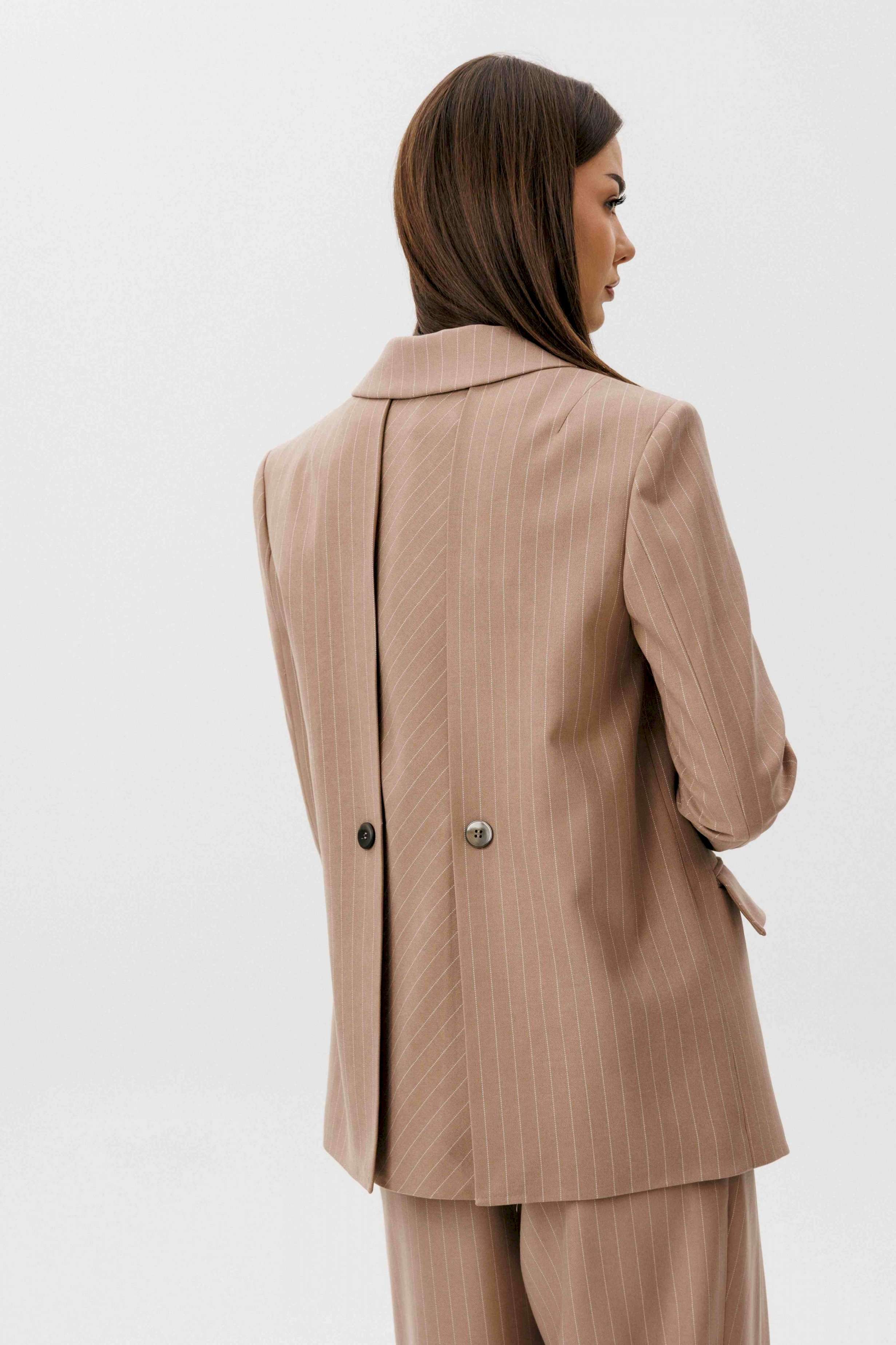 Прилежный officecore с накрахмаленными до хруста воротничками, начищенными до блеска \"\" оксфордами\"\" и портфелями, набитыми под завязку документами, официально отменяется. Офисный look образца 2025 выглядит так, словно его пропустили через шредер, а затем собрали заново. Невероятная тройка-как воплощение нового видения на классический костюм. Жакет свободного упрямленного силуэта, втачного покроя, со смещенной застежкой и классическим английским воротником. Полочка с нагрудной вытачкой от линии лацкана, меняющей направление полоски в верхней части, прорезным карманом с рамкой и клапаном. Спинкка с плечевой вытачкой и двумя необычными шлицами, идущими от горловины спинки, фиксирующимися пуговицами в области талии. Центральная часть спинки в диагональном направлении. Рукав двухшовный с отлетной шлицей и пуговицами. Жилет полуприлегающий, со сложным фигурным бортом, отрезным бочком, нагрудной вытачкой и средним швом и рельефом по спинке. Брюки современного кроя, свободные вверху и зауженные к низу на притачном поясе со шлевками, эластичном в области спинки. Передние половинки брюк с наклонным боковым карманом и большой односторонней складкой, визуально преобразующей прямую полоску в наклонную от центра передних половинок к боковому шву. Задние половинки брюк с талиевыми вытачками. По низу брюк-цельнокроеный манжет. Длина жакета около 67 см. Длина рукава около 62 см. Длина жилета около 54 см. Длина брюк около 100 см.