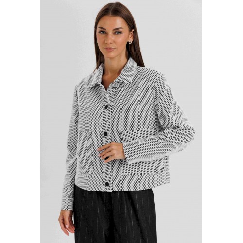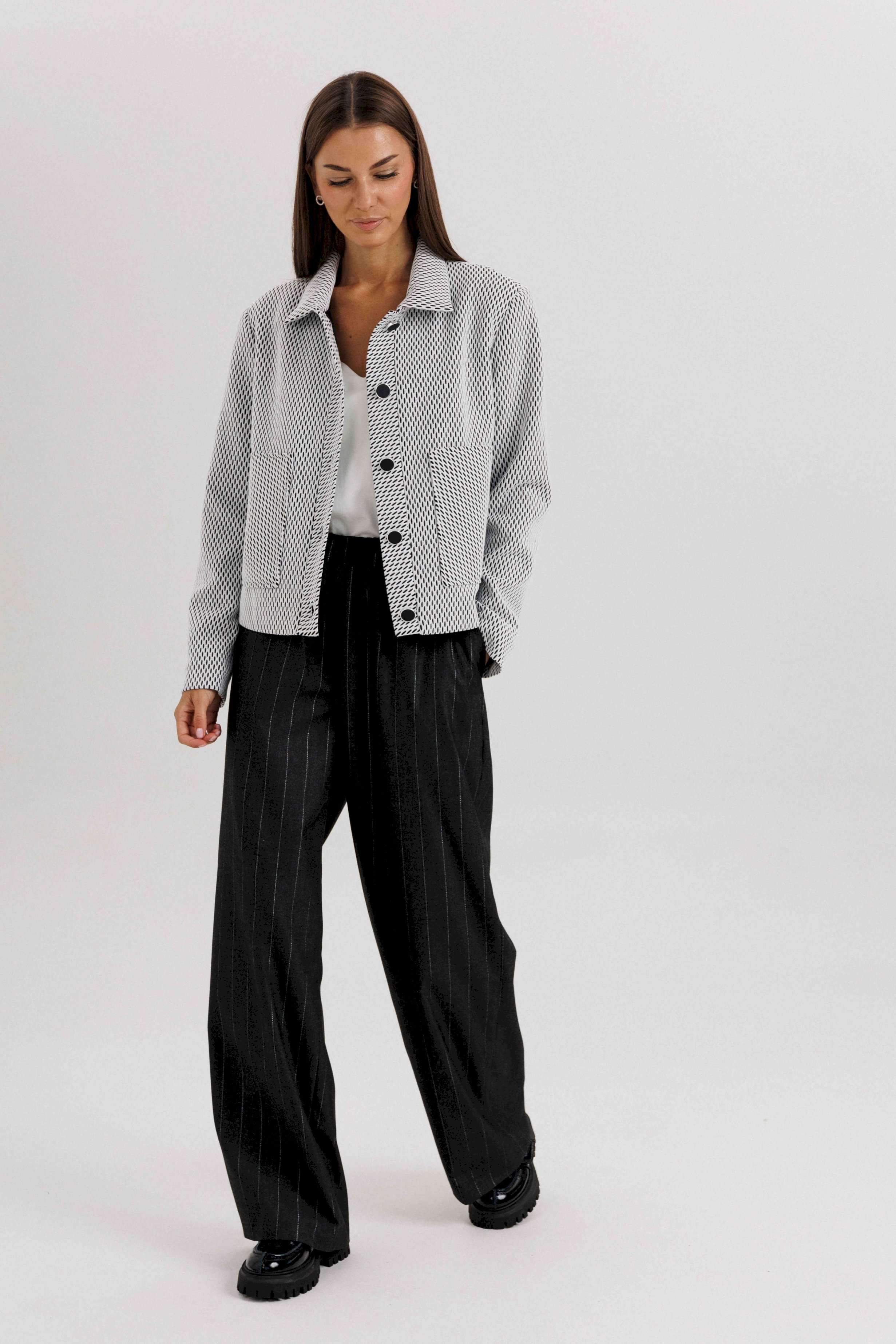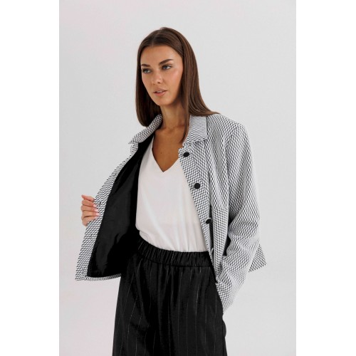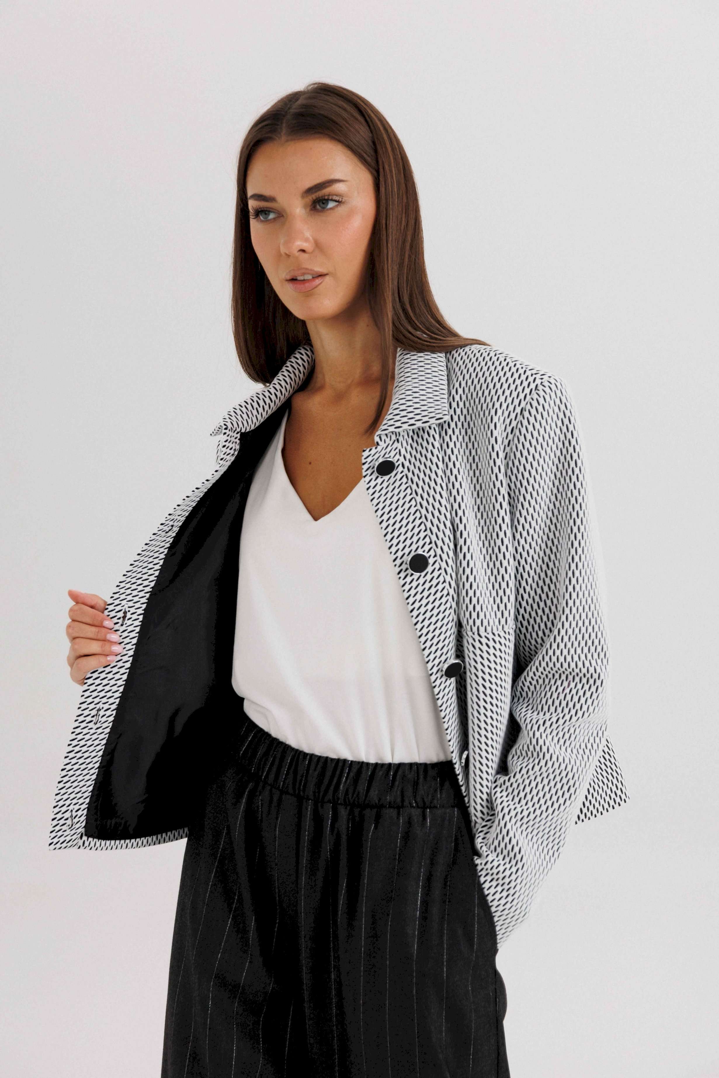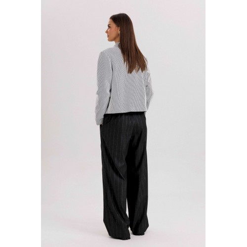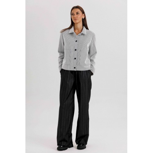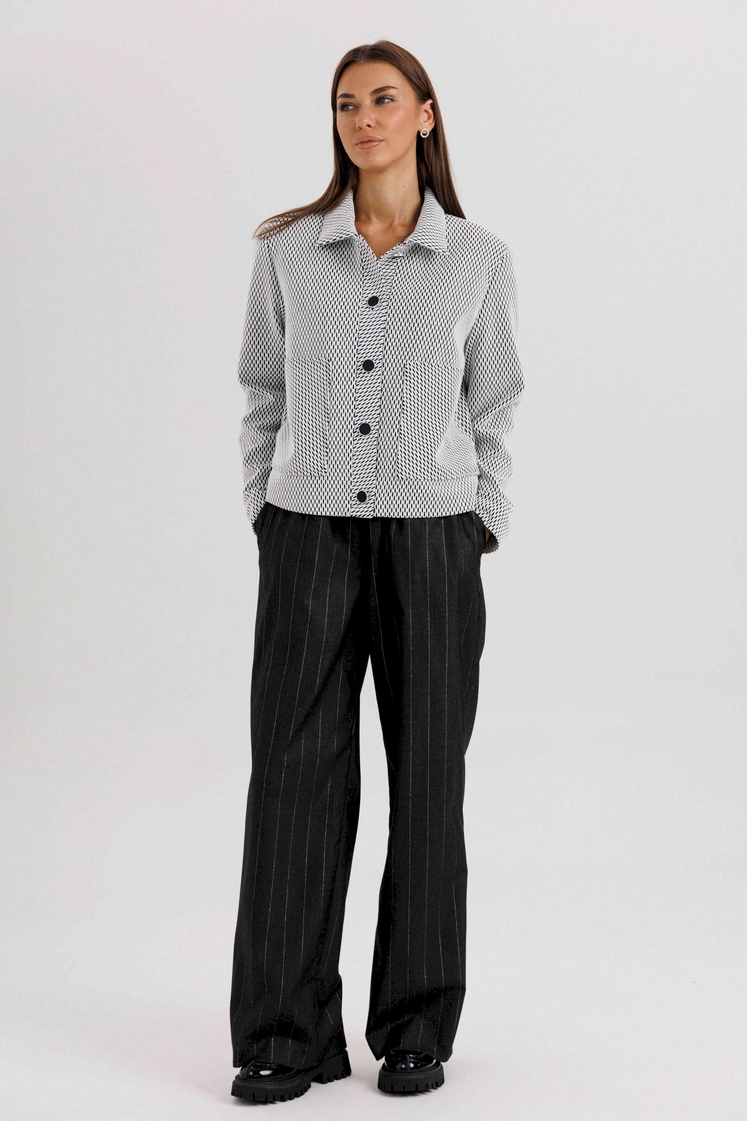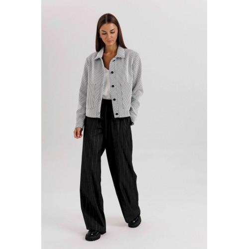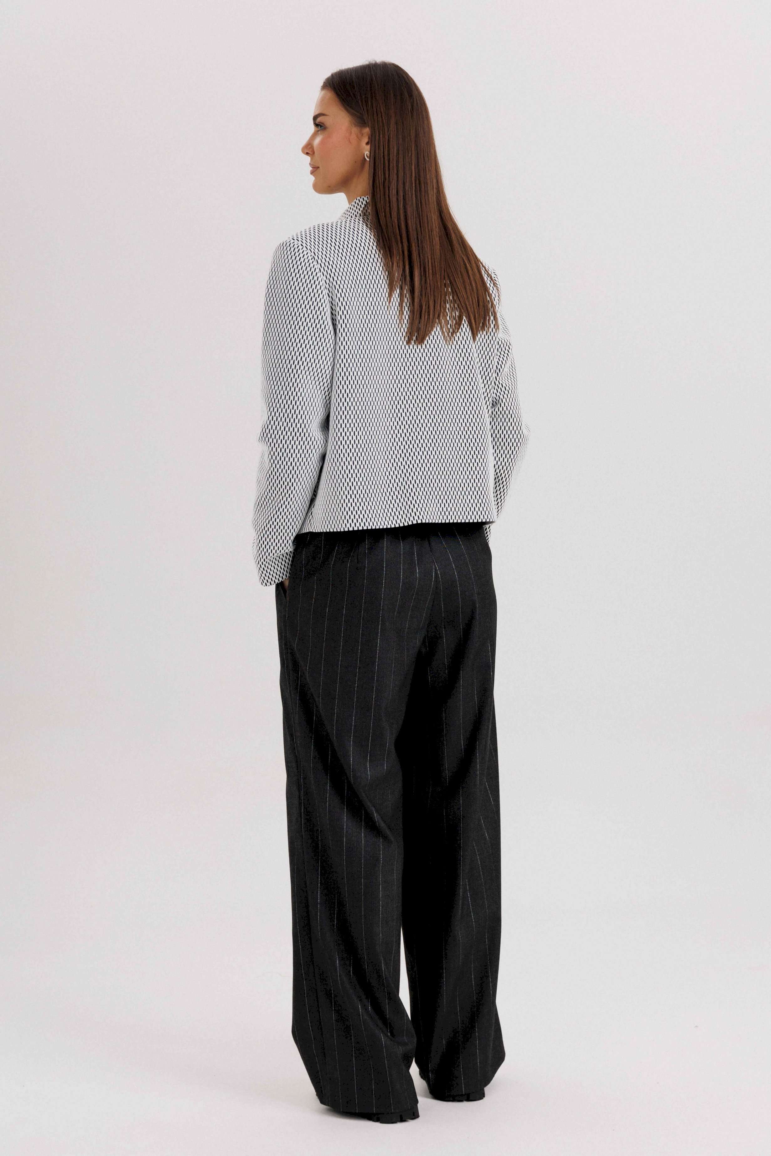Современный женский костюм в стиле smart casual сочетает элегантность классики и комфорт повседневного образа. Комплект состоит из жакета прямого кроя с крупными пуговицами и брюк в тонкую вертикальную полоску. Контраст текстур придаёт образу динамичность и стиль. Жакет укороченной длины выполнен из лёгкой ткани с графическим узором, имеет отложной воротник и аккуратную застёжку на пуговицы. Брюки прямого силуэта со стрелками и комфортной посадкой по талии визуально вытягивают силуэт и добавляют стройности. Костюм универсален — идеально подходит для офиса, деловых встреч и городских выходов. Его можно сочетать с лоферами, туфлями на каблуке или кроссовками для более расслабленного стиля. Особенности модели: Комплект: жакет + брюки Стильный контрастный дизайн Прямой силуэт и длина брюк миди Классическая полоска — тренд сезона 2025 Удобная посадка и лаконичный крой.