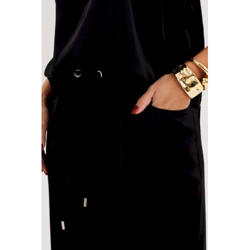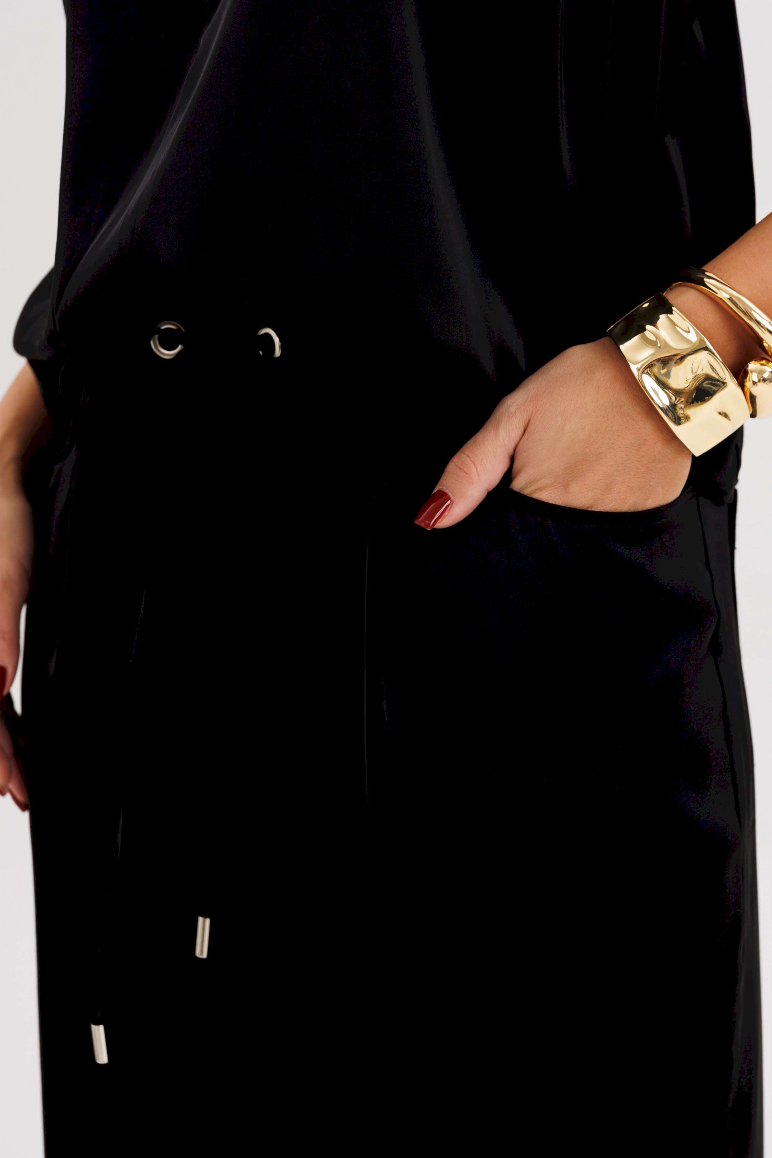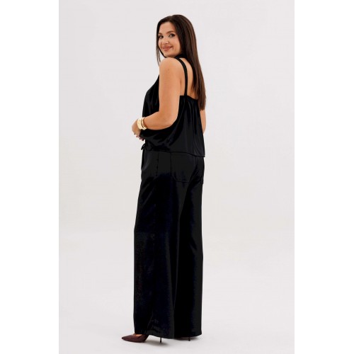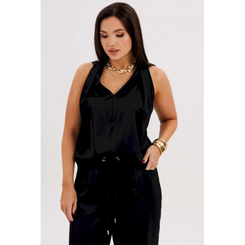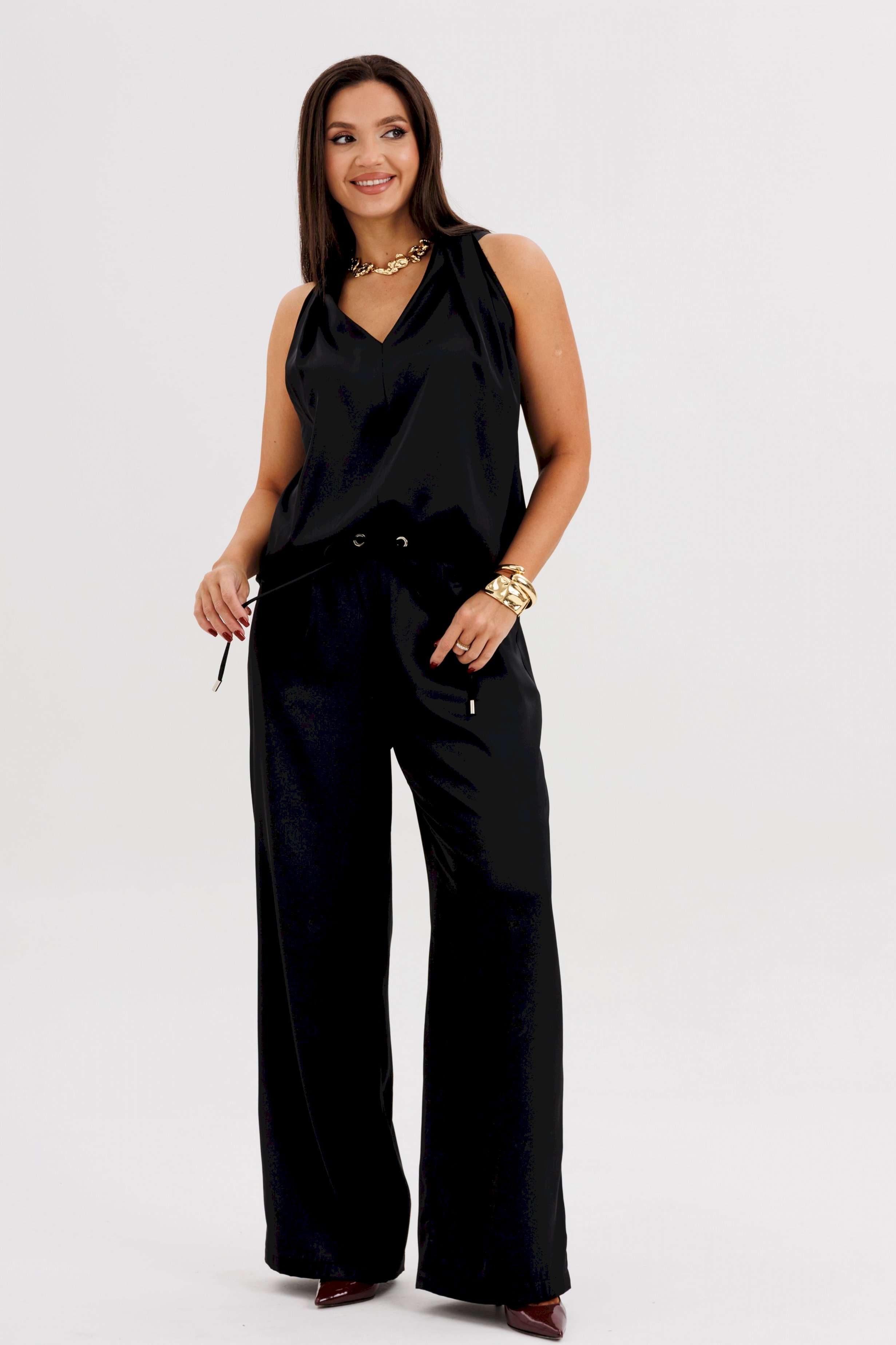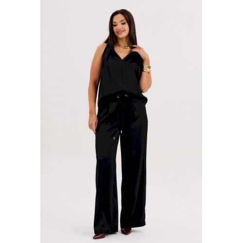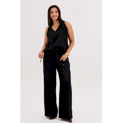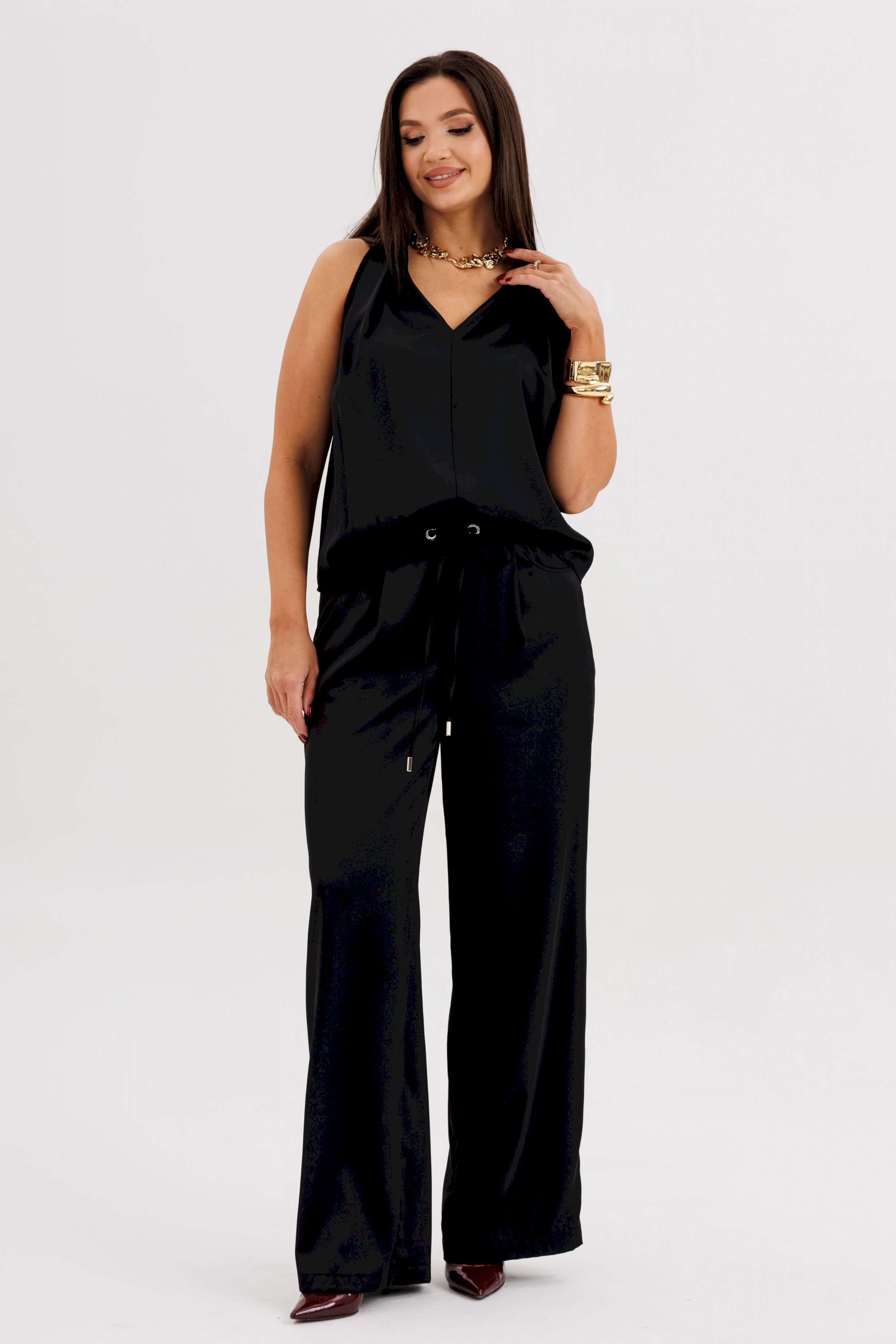 Элегантная брючная двойка, в которой комфорт гармонично сочетается с чувством стиля. Эффектный топ с V-образным вырезом и воротником-холтер мягко драпируется от линии плеч, создавая женственный силуэт и лёгкий акцент на зону декольте. Брюки свободного покроя на эластичном поясе со шнуром-завязкой и металлическими люверсами придают образу расслабленную изысканность и ощущение непринуждённого шика. Такой комплект — универсальное решение для современных женщин, которые ценят стиль, удобство и элегантность в каждом движении. Он будет уместен и в офисе с жакетом, и на вечернем выходе с яркими аксессуарами.