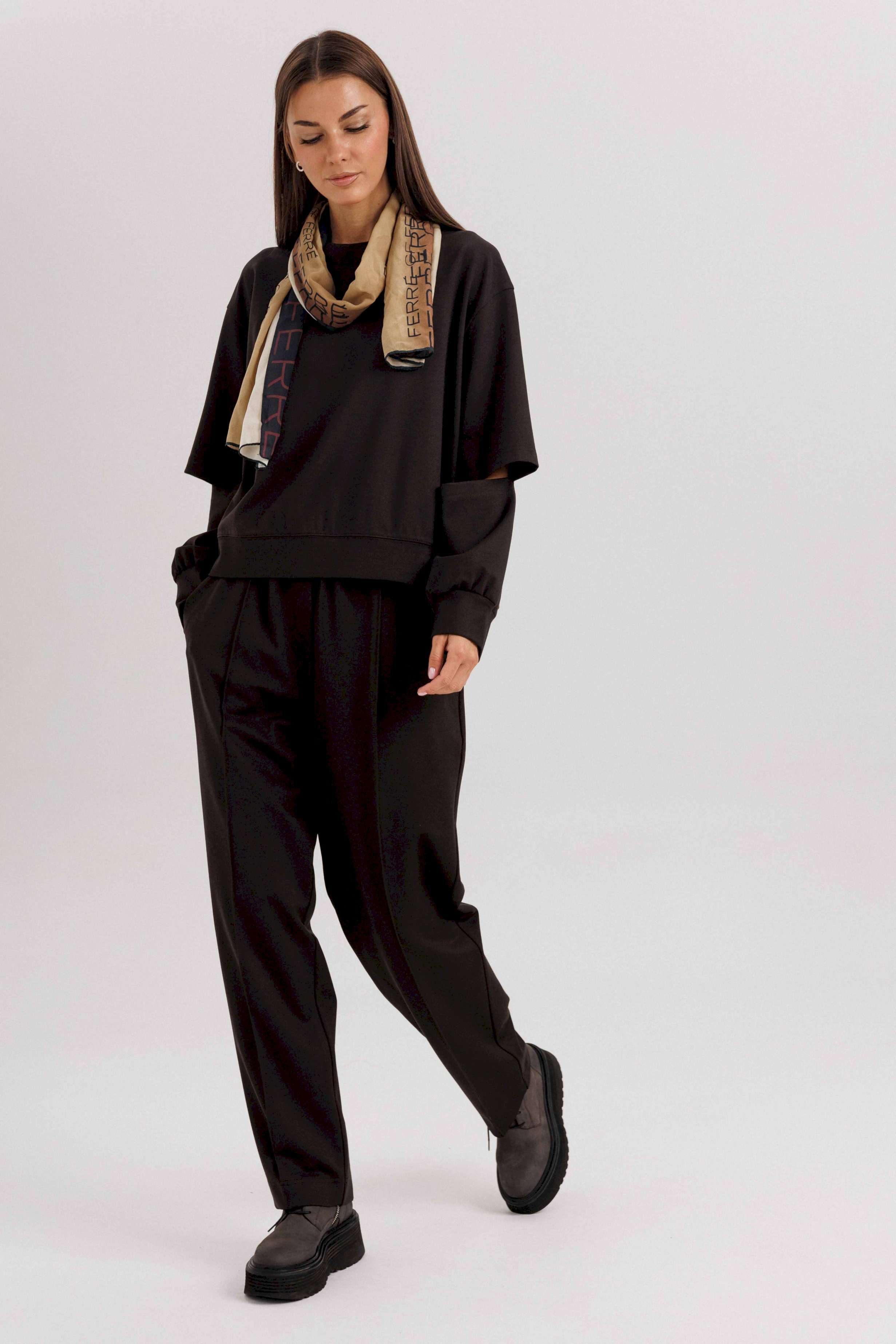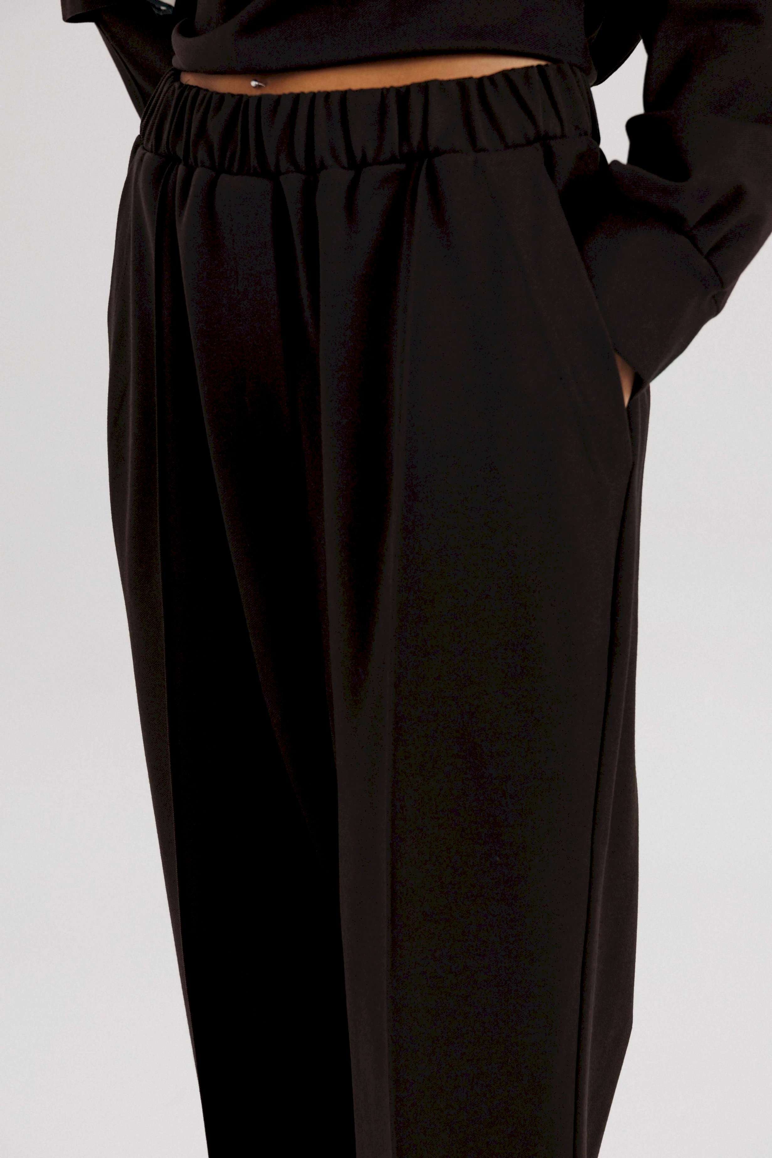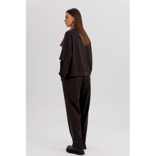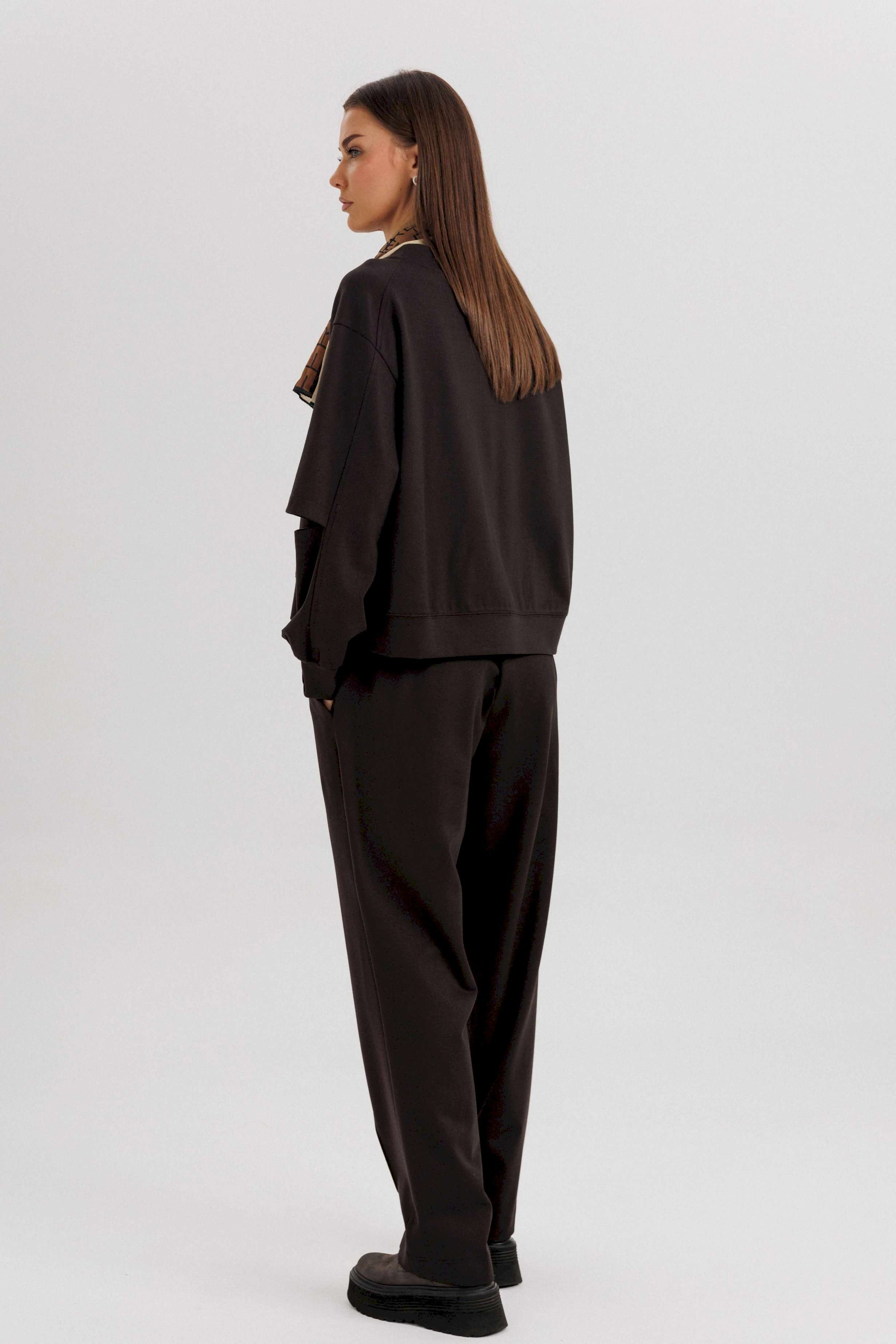 Комплект невероятно комфортный, в самом трендовом цвете сезона. Свободный оверсайз свитшот с заниженной линией плеча, рукавом расширенным в области оката. По низу изделия и рукавов - притачной эластичный манжет. Рукав из 4-х частей с эффектным разрезом в области локтя. Брюки в расслабленном стиле, на эластичном поясе с наклонными боковыми карманами и кантом-защипом по передним половинкам брюк. Длина джемпера 62 см. Длина рукава 50 см. Длина брюк около 102 см.