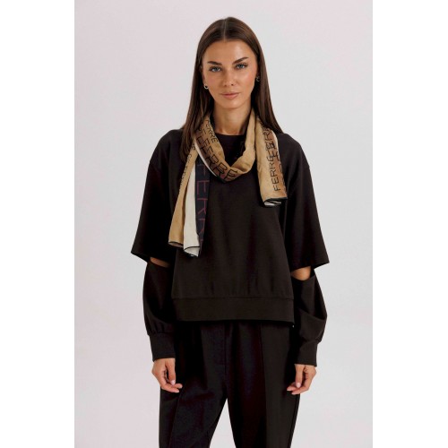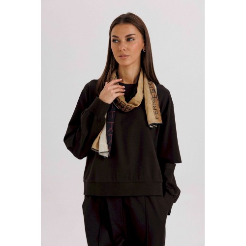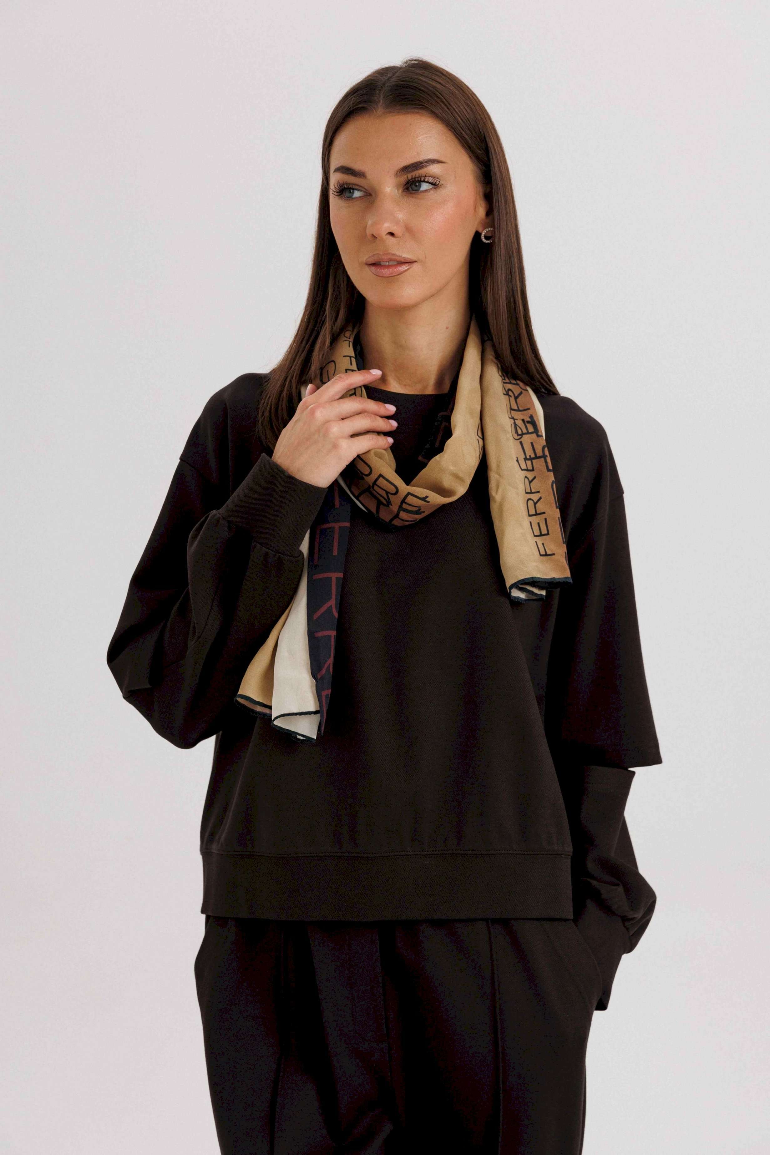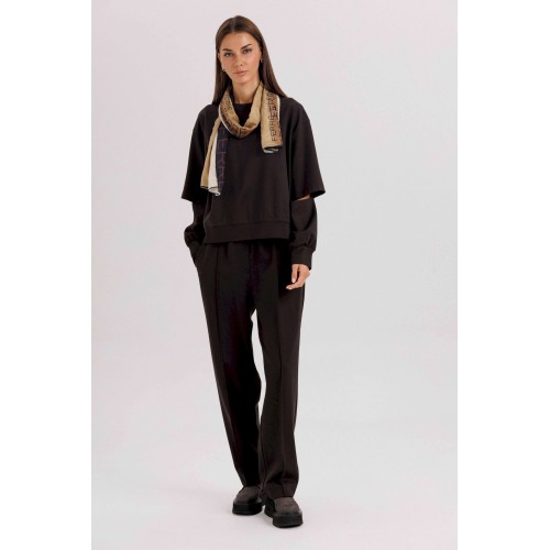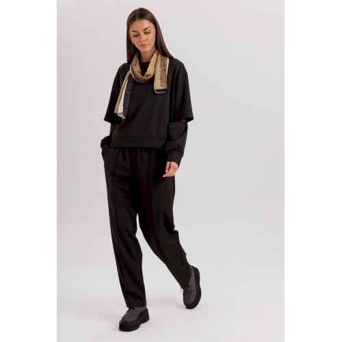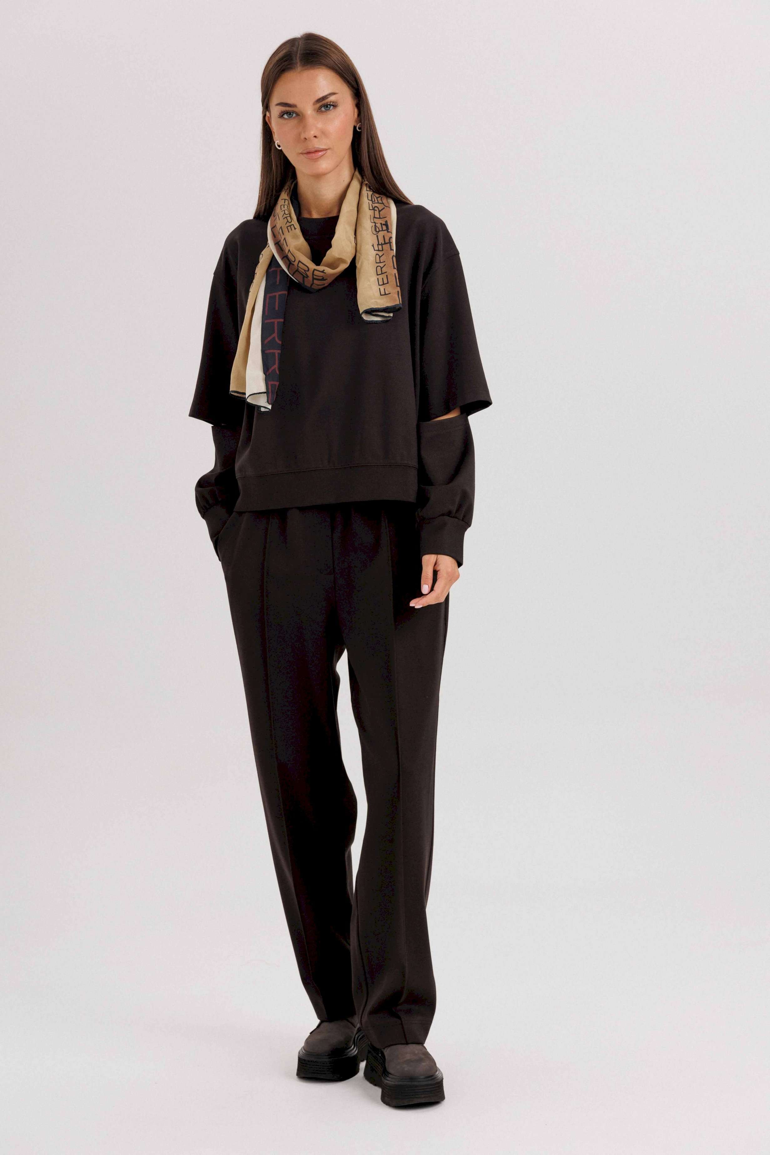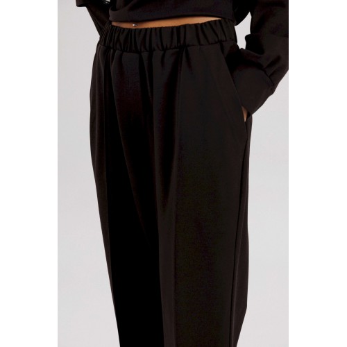 Комплект невероятно комфортный, в самом трендовом цвете сезона. Свободный оверсайз свитшот с заниженной линией плеча, рукавом расширенным в области оката. По низу изделия и рукавов - притачной эластичный манжет. Рукав из 4-х частей с эффектным разрезом в области локтя. Брюки в расслабленном стиле, на эластичном поясе с наклонными боковыми карманами и кантом-защипом по передним половинкам брюк. Длина джемпера 62 см. Длина рукава 50 см. Длина брюк около 102 см.