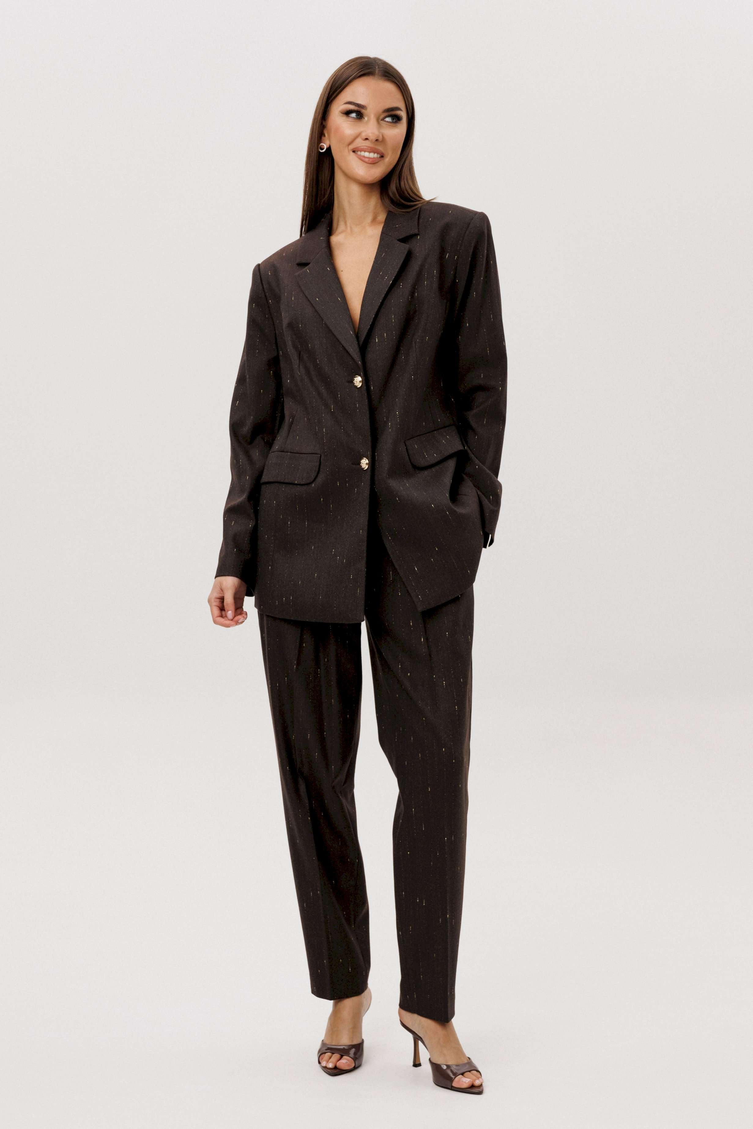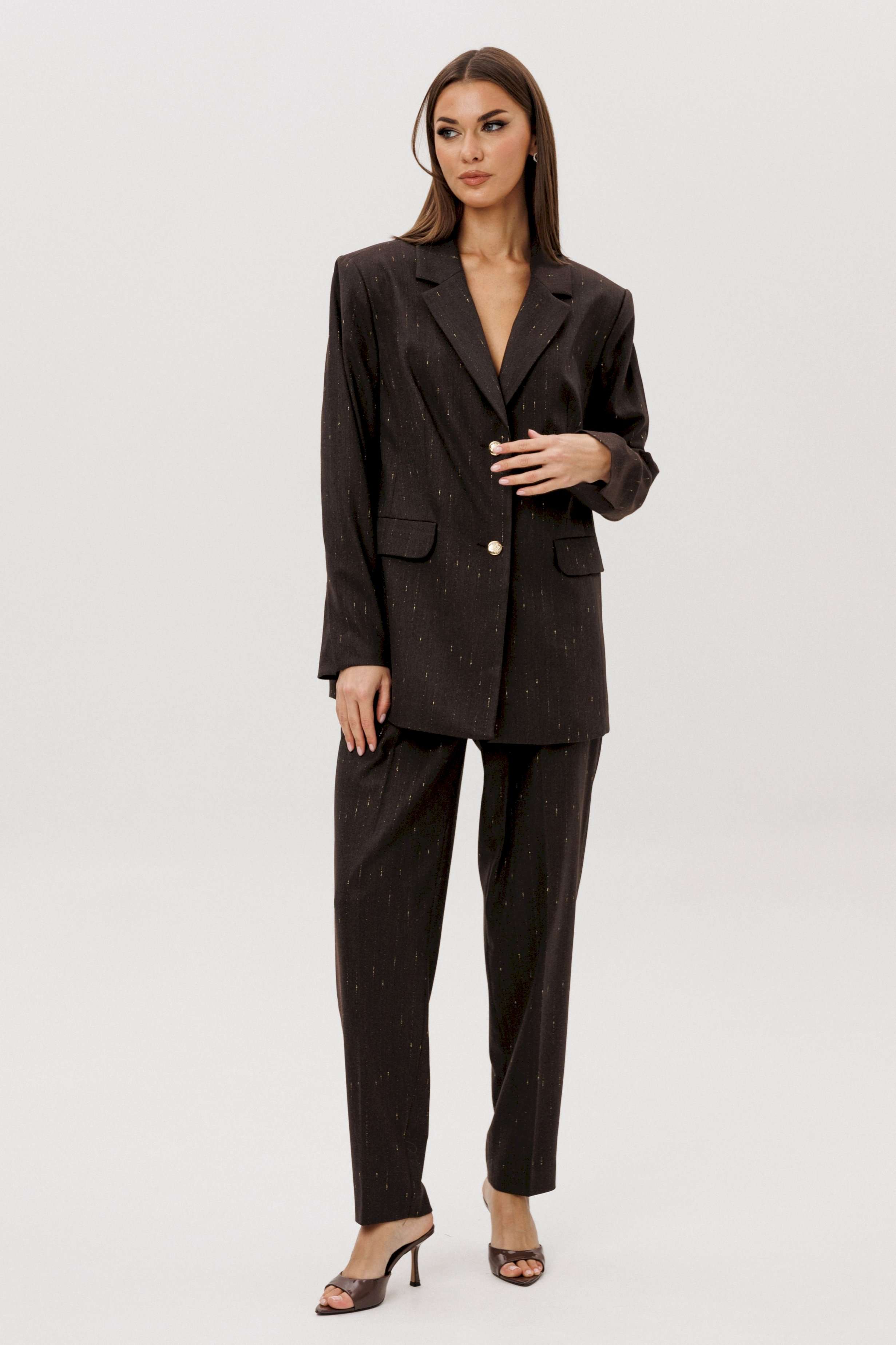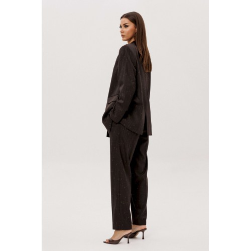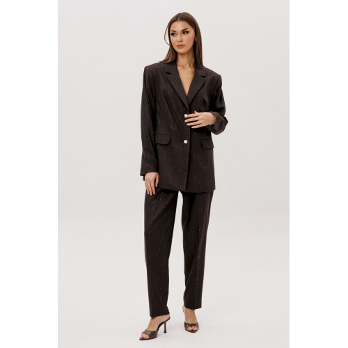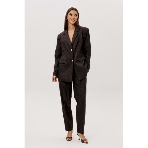Комплект из невероятного, мерцающего полотна Жакет свободного расширенного силуэта, втачного покроя с центральной застёжкой и классическим английским воротником. Полочка с отрезным бочком, нагрудной вытачкой и прорезным карманом с клапаном. Спинка с центральным швом, шлицей и отрезным бочком. Рукав двухшовный с отлетной шлицей. Брюки классического покроя с высокой посадкой на притачном поясе со шлёвками, зауженные. Застежка брючная на потайной крючок и молнию. Передние половинки брюк с мягкими складками-защипами и наклонными боковыми карманами. Задние половинки брюк с вытачками и прорезными карманами с листочками. Длина брюк около 100 см.
