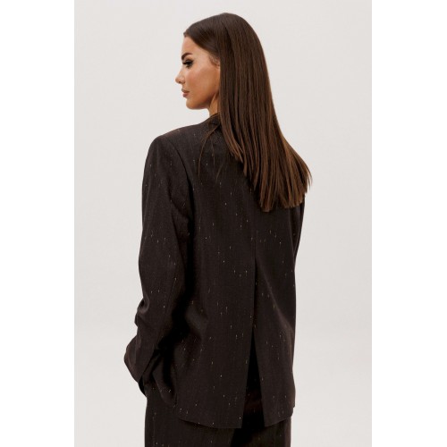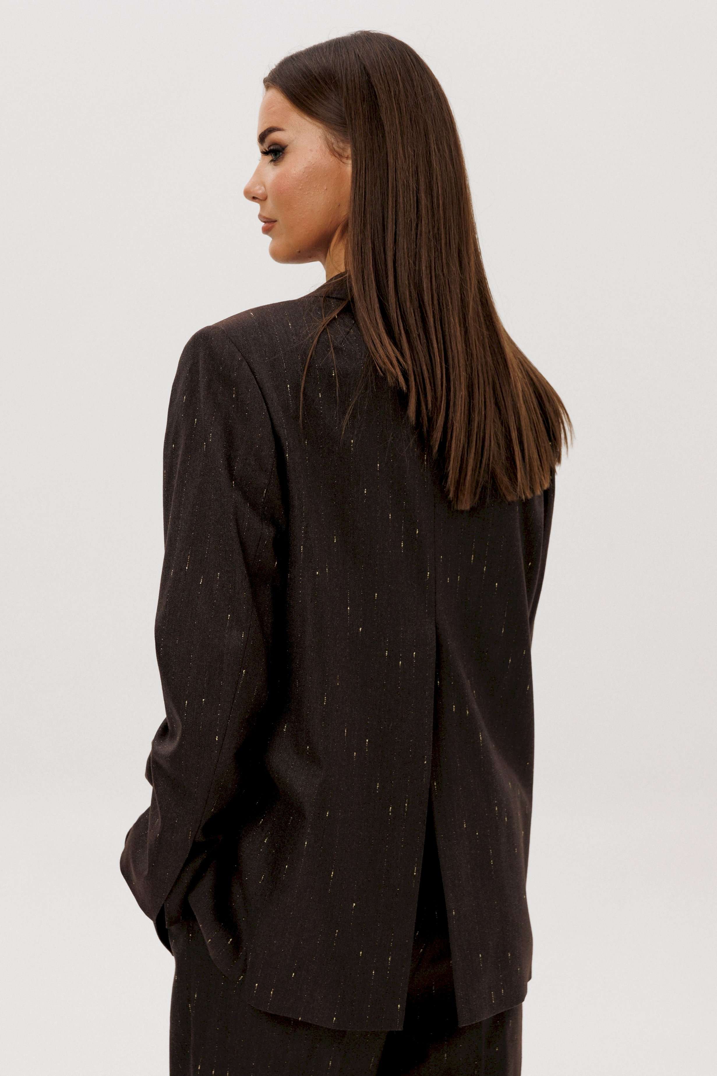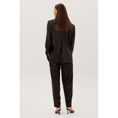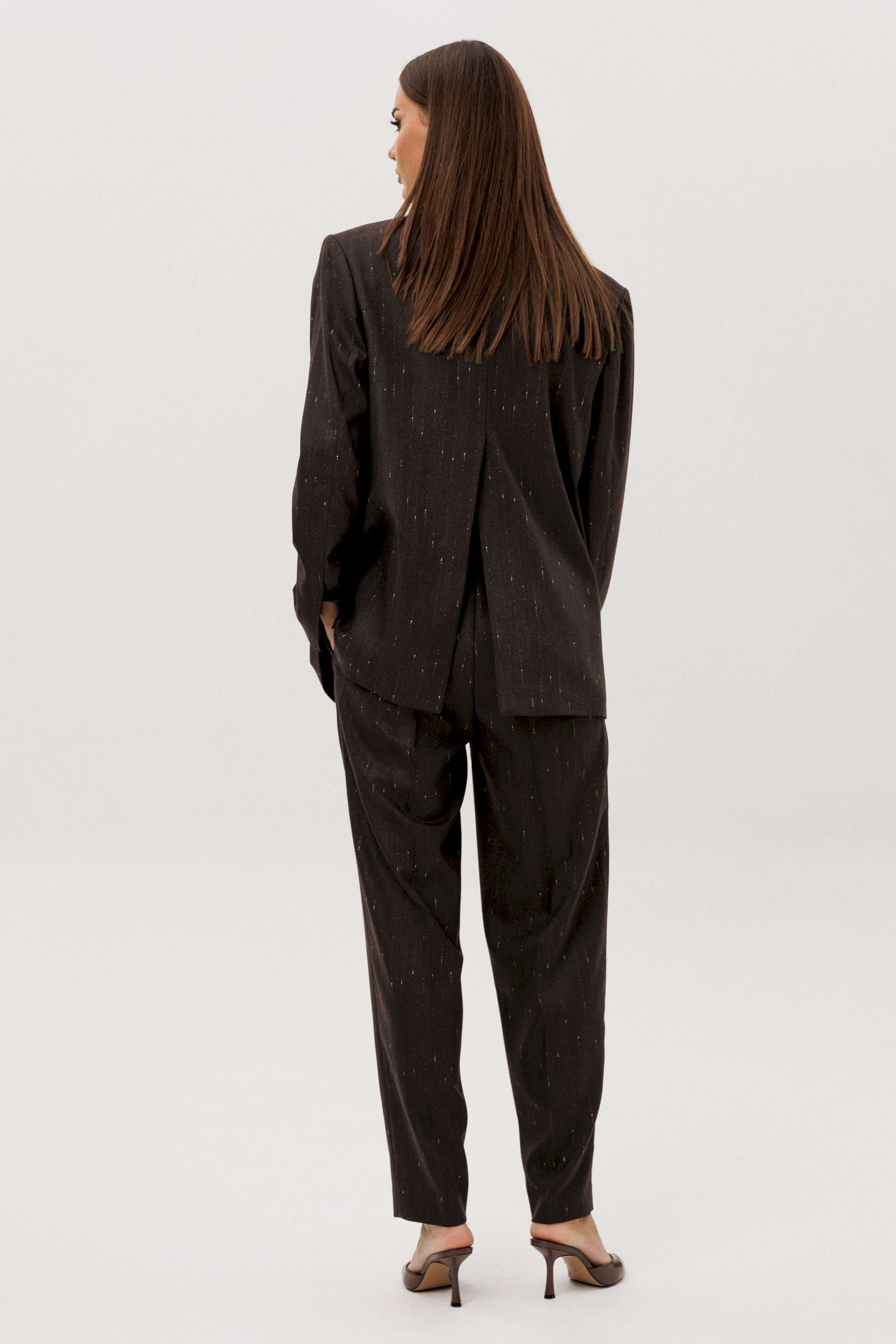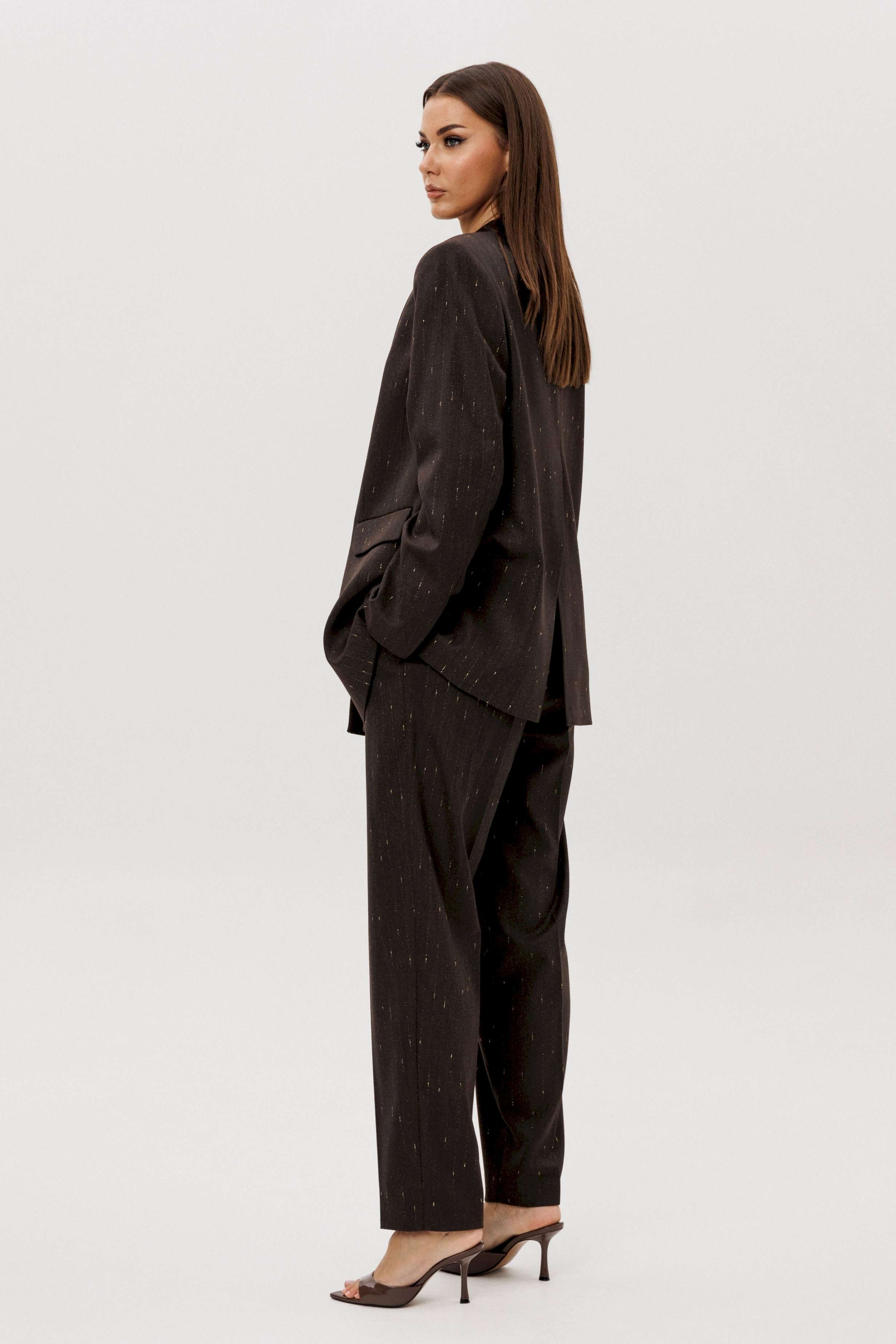 Комплект из невероятного, мерцающего полотна Жакет свободного расширенного силуэта, втачного покроя с центральной застёжкой и классическим английским воротником. Полочка с отрезным бочком, нагрудной вытачкой и прорезным карманом с клапаном. Спинка с центральным швом, шлицей и отрезным бочком. Рукав двухшовный с отлетной шлицей. Брюки классического покроя с высокой посадкой на притачном поясе со шлёвками, зауженные. Застежка брючная на потайной крючок и молнию. Передние половинки брюк с мягкими складками-защипами и наклонными боковыми карманами. Задние половинки брюк с вытачками и прорезными карманами с листочками. Длина брюк около 100 см.