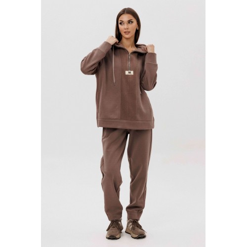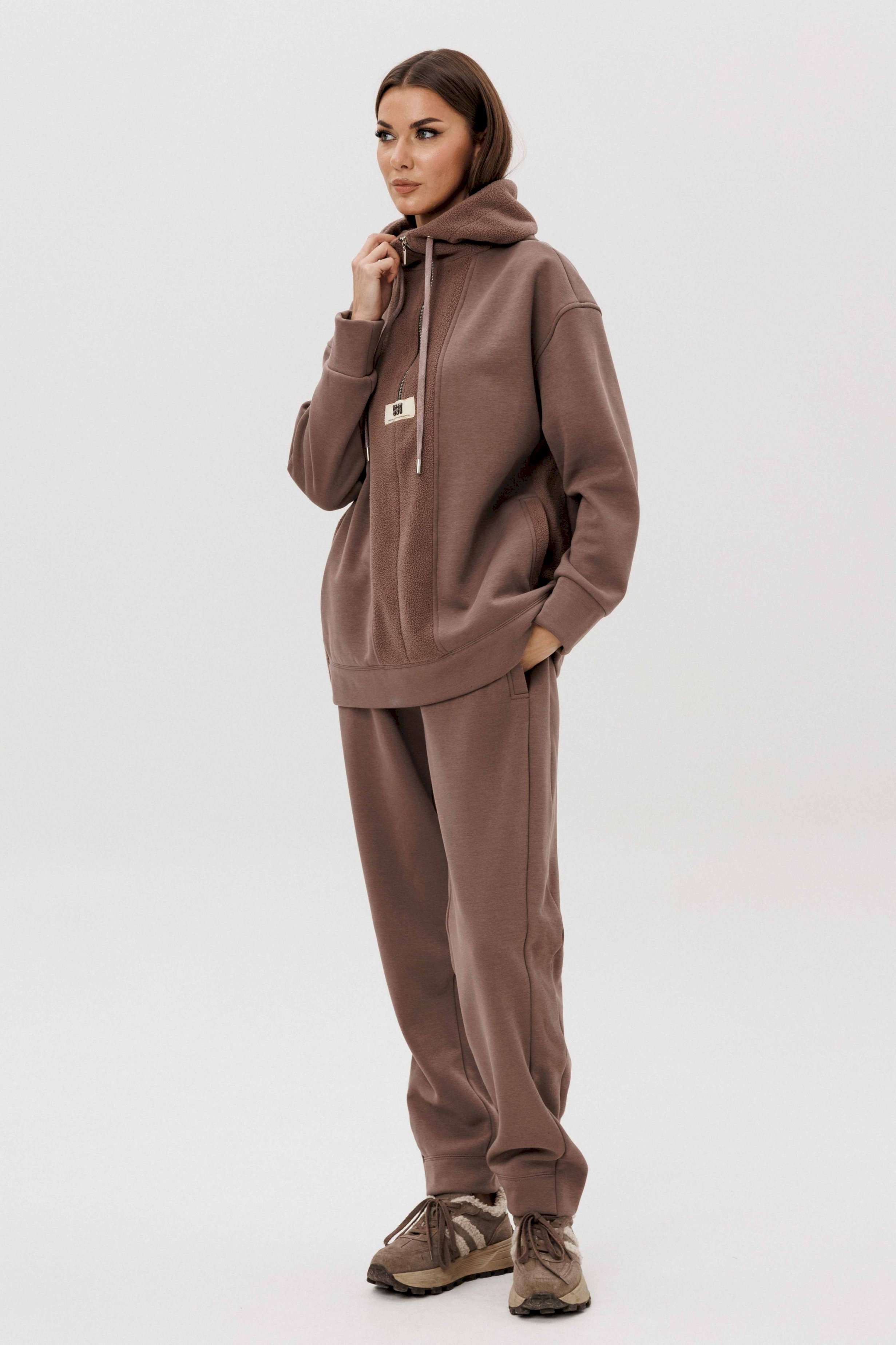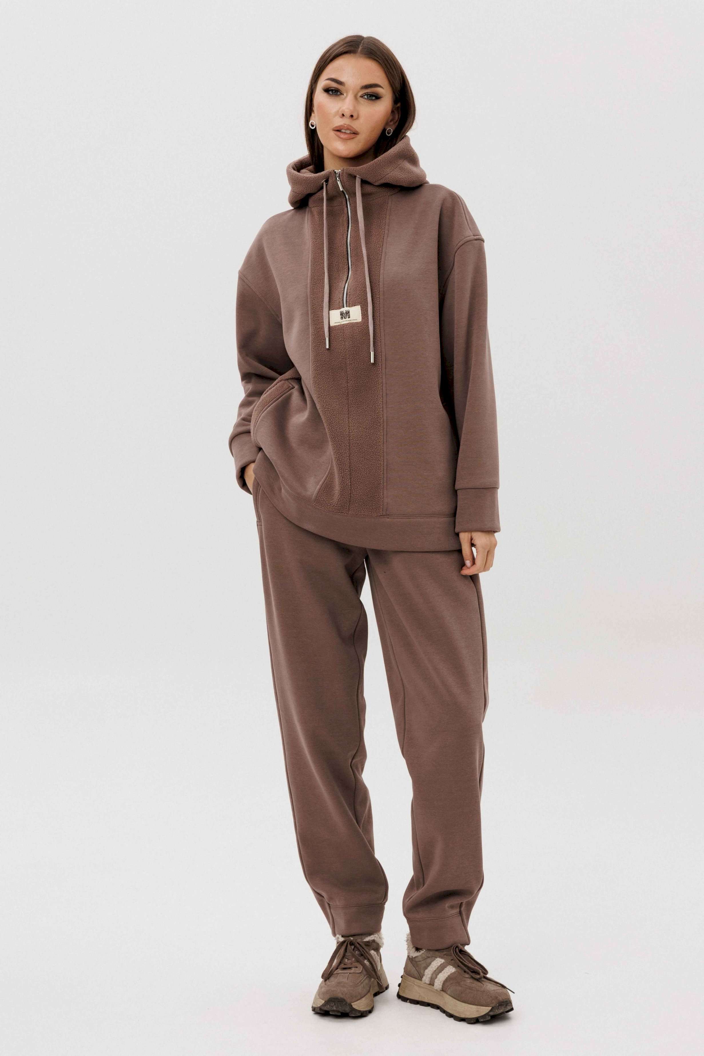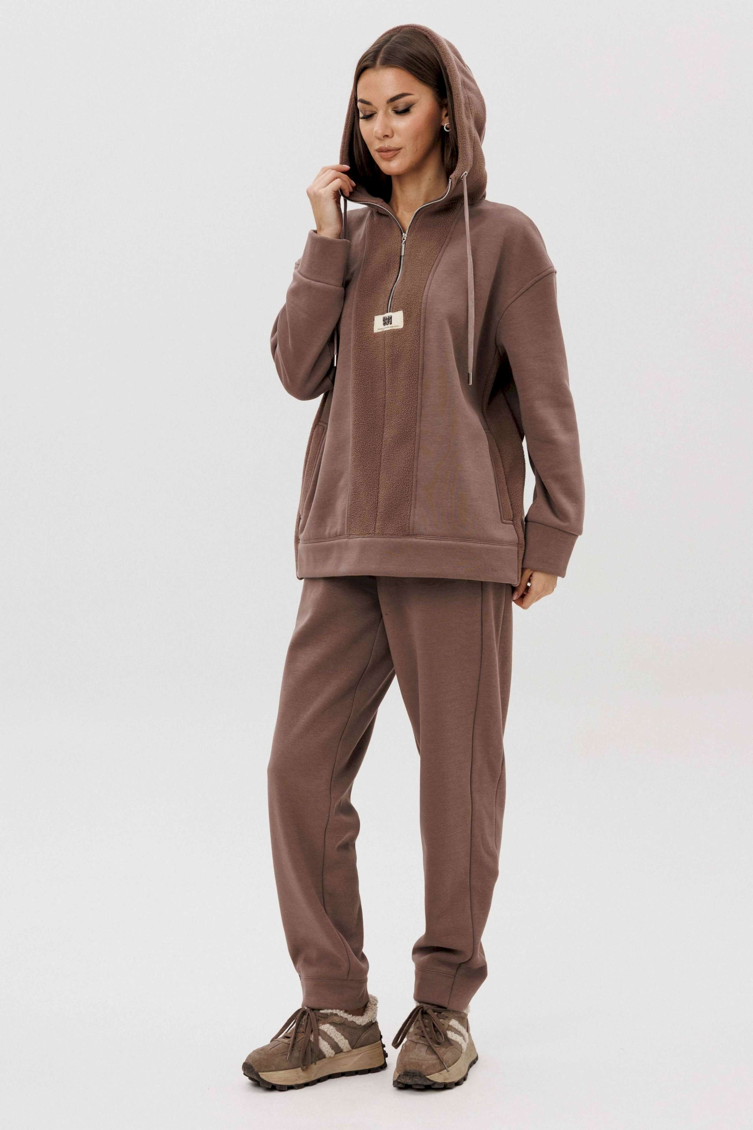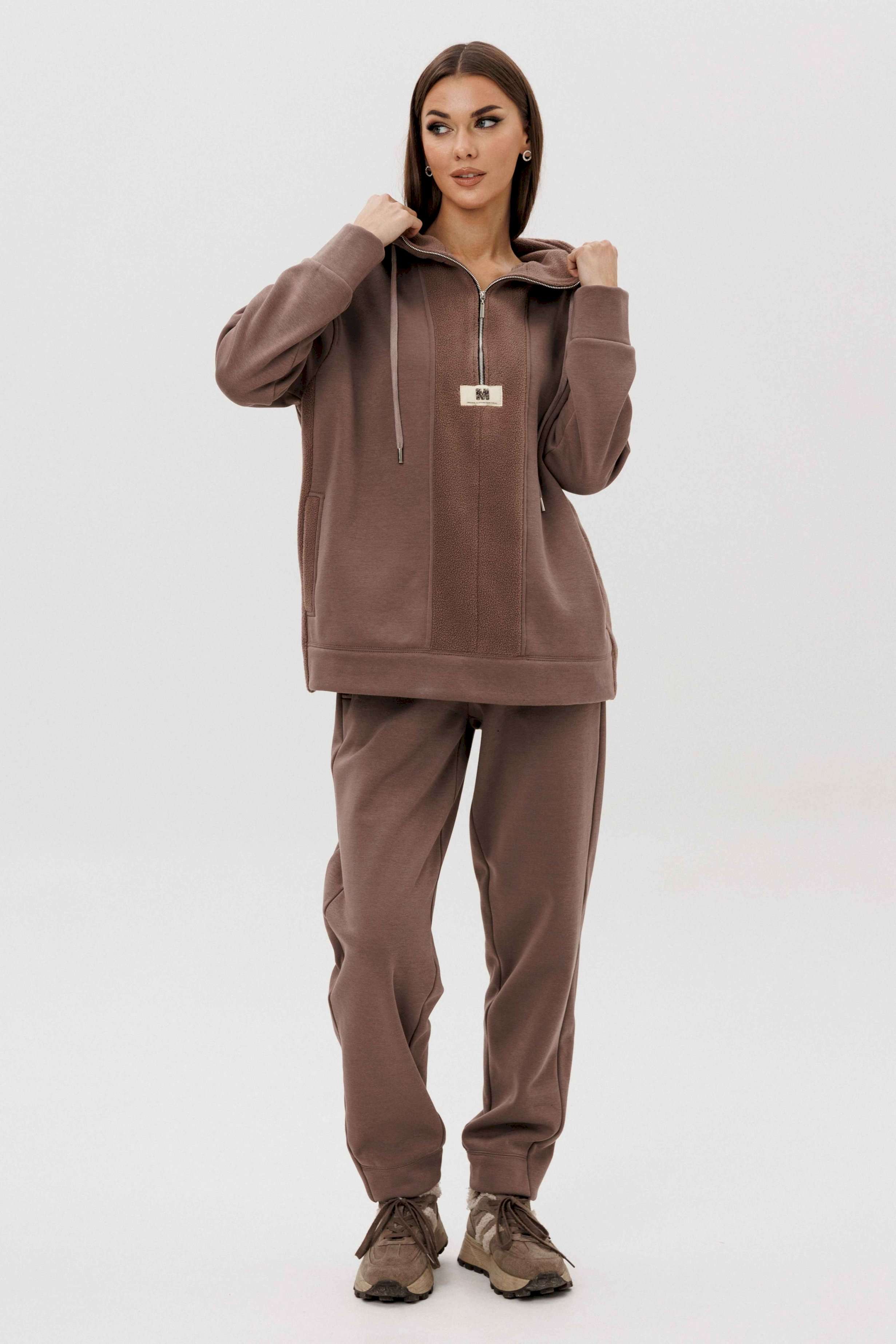 Уютный костюм из тёплого футера с мягким начёсом «барашек» — идеальный выбор для прохладного сезона. Толстовка свободного силуэта с объёмным капюшоном и функциональной молнией спереди создаёт стильный и комфортный образ. Акцентная отделка и фирменная нашивка добавляют современный штрих. Брюки прямого кроя с эластичным поясом и манжетами обеспечивают удобную посадку и свободу движений. Мягкий хлопковый футер с нежным ворсом внутри сохраняет тепло, приятно ощущается на коже и держит форму даже после стирки.
