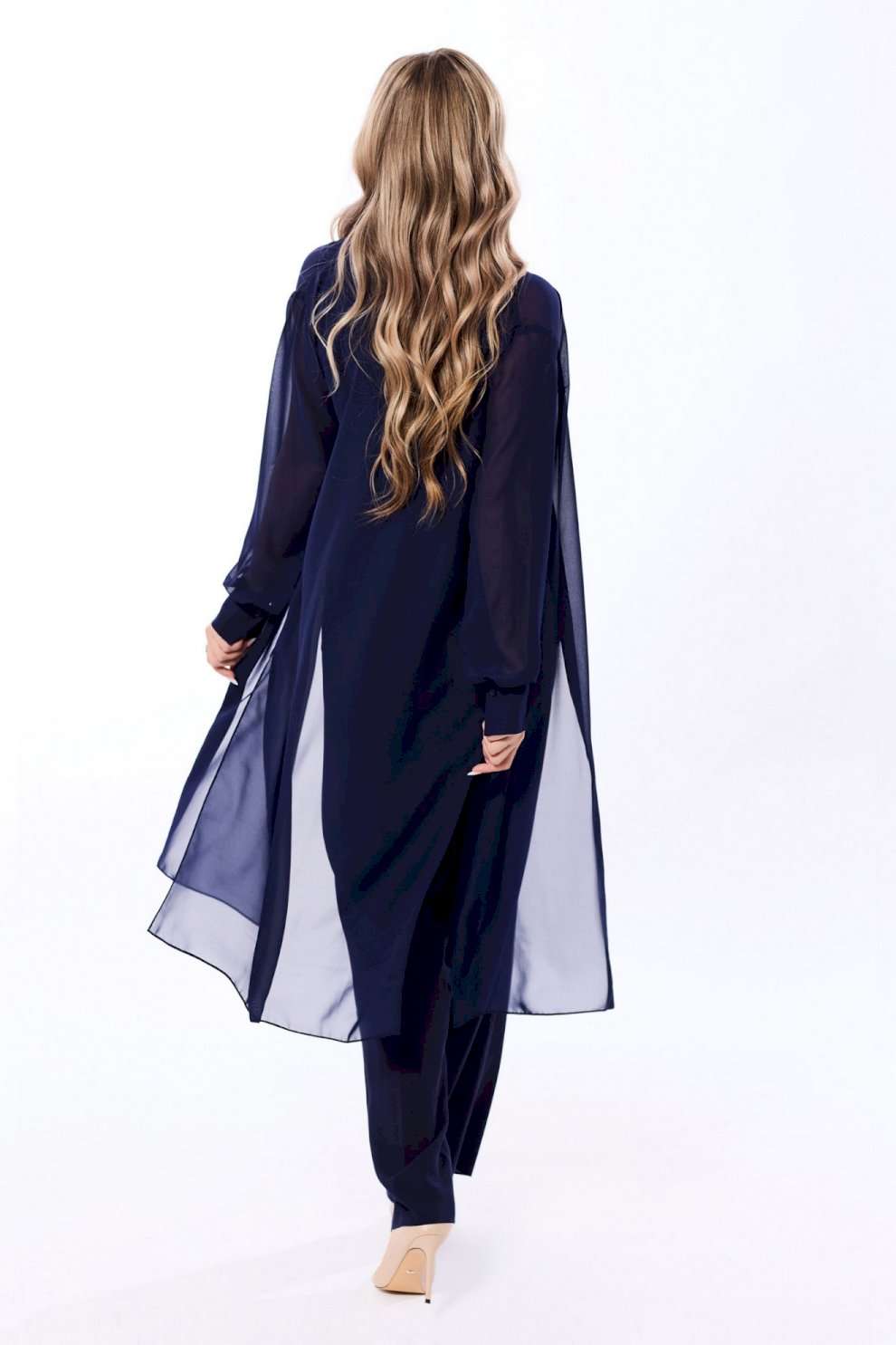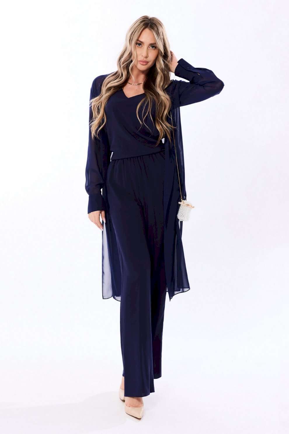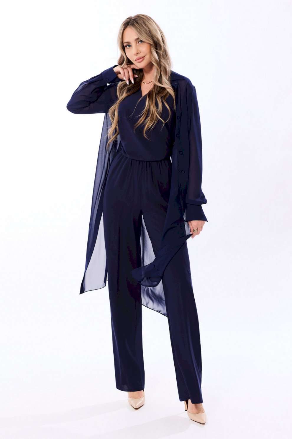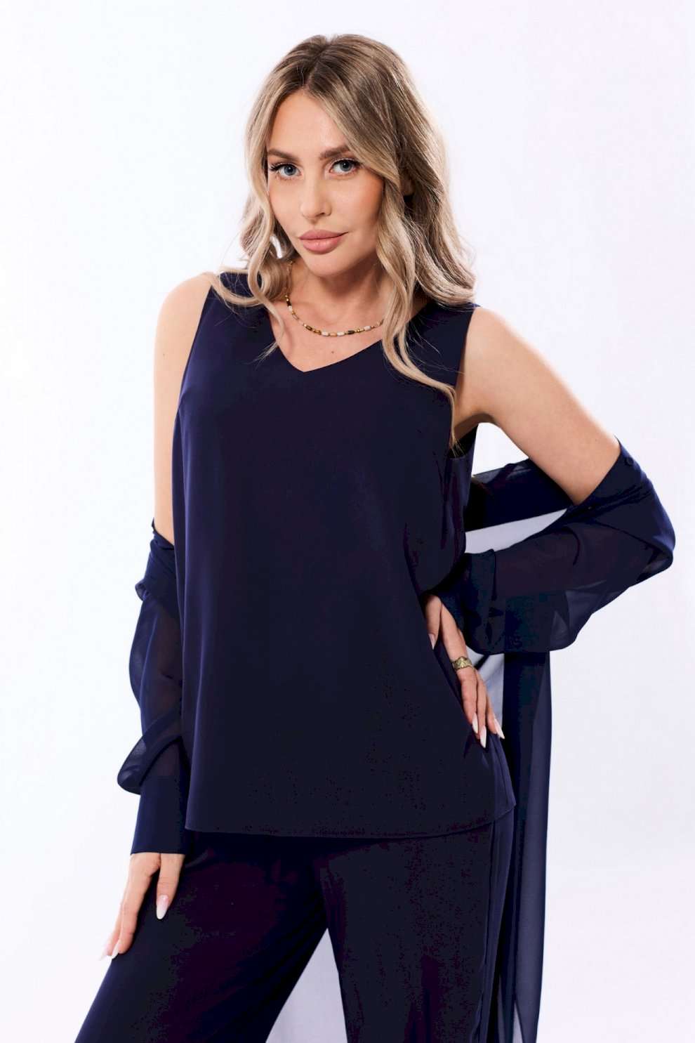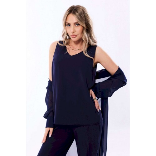Блузон с центральной застежкой на петли и пуговицы, втачным воротником с отрезной стойкой. По переду с нагрудными вытачками, спинка цельная, по боковым швам- разрезы. Рукав втачной, длинный, с отрезной манжетой. Топ без воротника, с V-образным вырезом горловины. По переду с нагрудными вытачками. Брюки прямые, с отрезным поясом. Пояс присборен на резинку. Передние половинки с карманами. Вход в карман наклонный к боковому шву.
