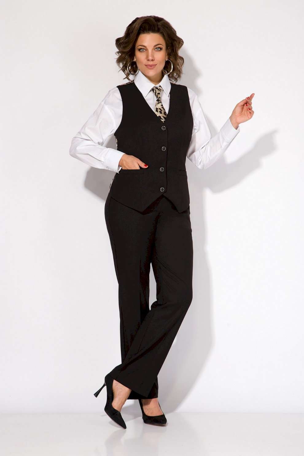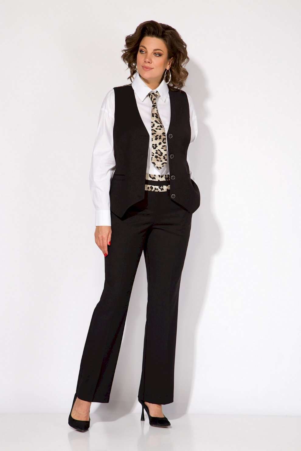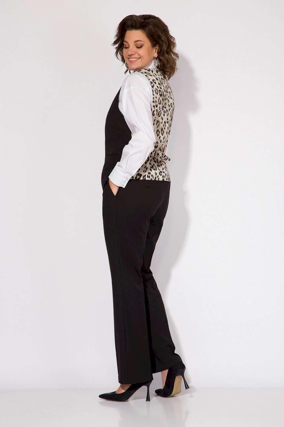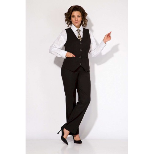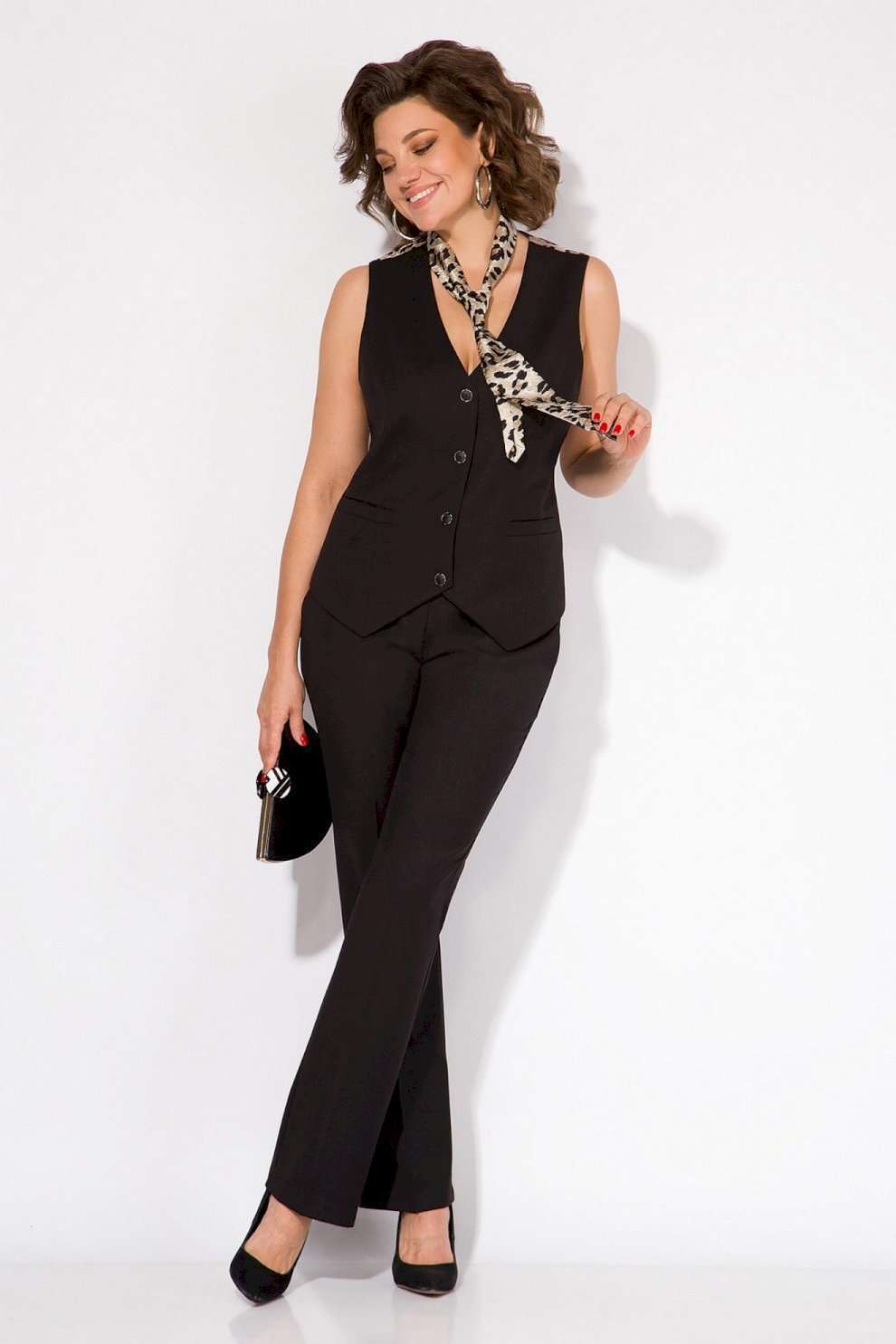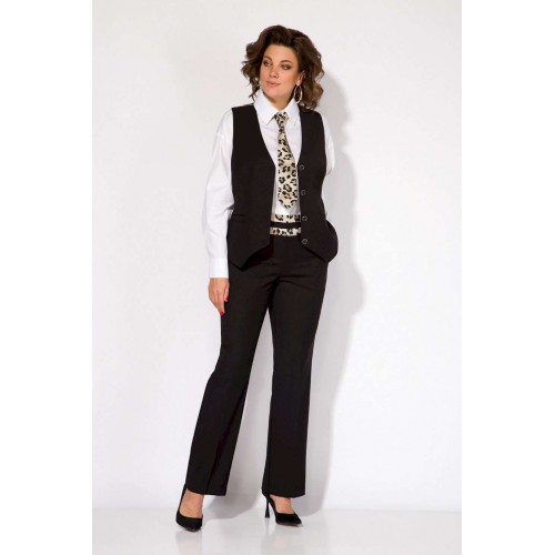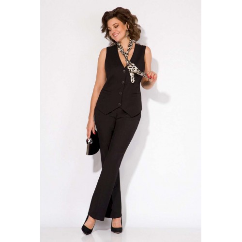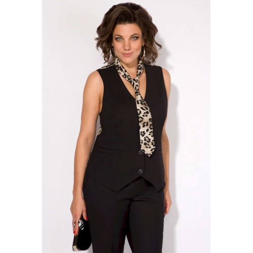 Женский костюм с жилеткой – модный тренд 2025-2026 года. Сделает офисный лук живее и интереснее, поможет разнообразить любой гардероб. Жилетка полупрниталенного силуэта, с застежкой на пуговицы выполнена из костюмной ткани. По полочке расположены продольные рельефы с прорезными карманами. Спинка выполнена из шелкового сатина с эффектным принтом. Есть хлястик для приталивания. Жилетка на шелковой подкладке. Брюки в костюме со средней посадкой на притачном поясе-кокетке со вставками из отделочной ткани. Застежка – потайная тесьма-молния. По спинке имеется резинка. Брюки слегка заужены в области колена. Строгость и утонченность - основные характеристики женской костюмной двойки. Нарядный деловой комплект представлен и в больших размерах, подойдет для высоких женщин и девушек. Прекрасному полу можно носить брючный костюм вне зависимости от возраста или фигуры на работу в офис и любой праздник. Длина жилетки – 55 см. Брюк – 104 см.