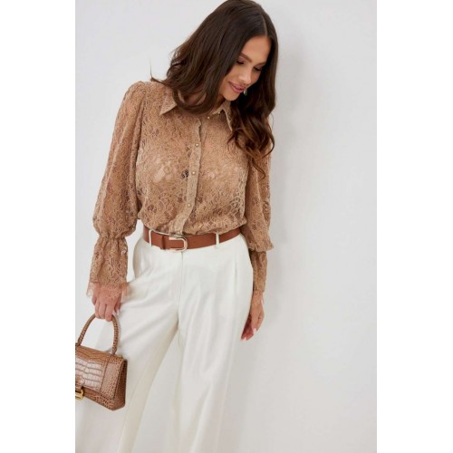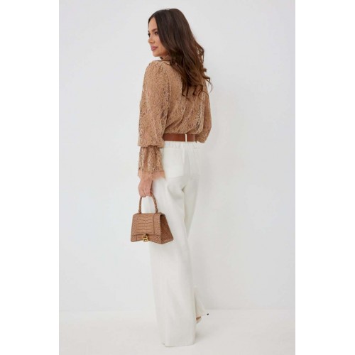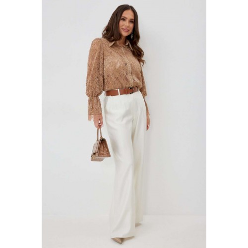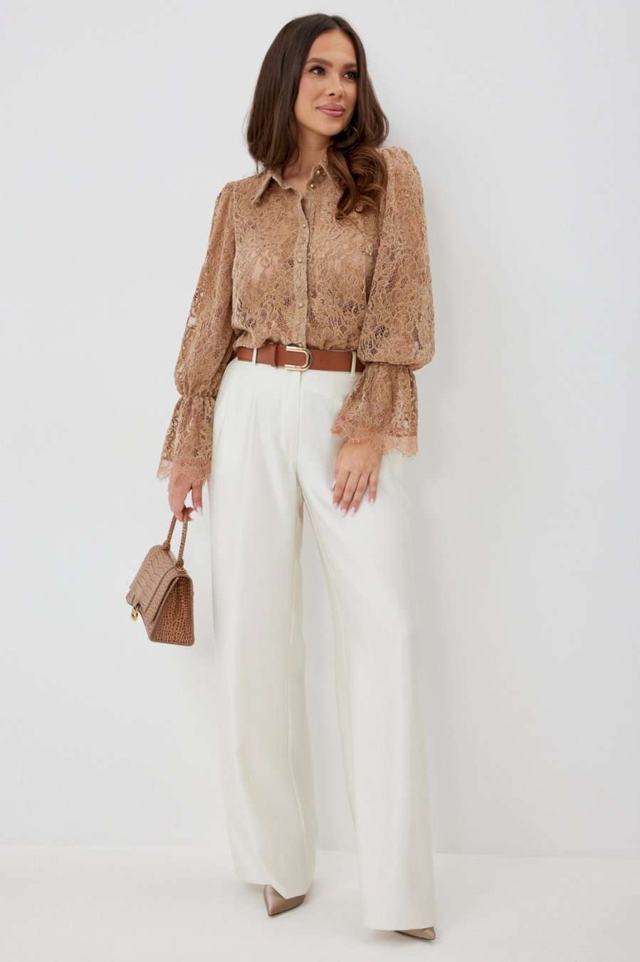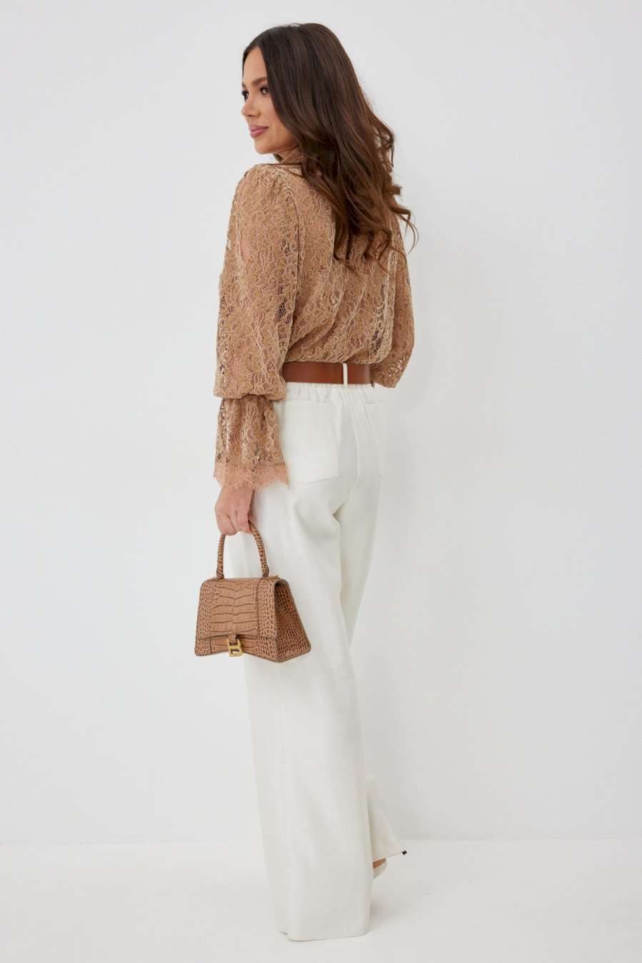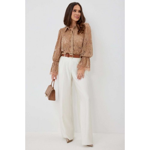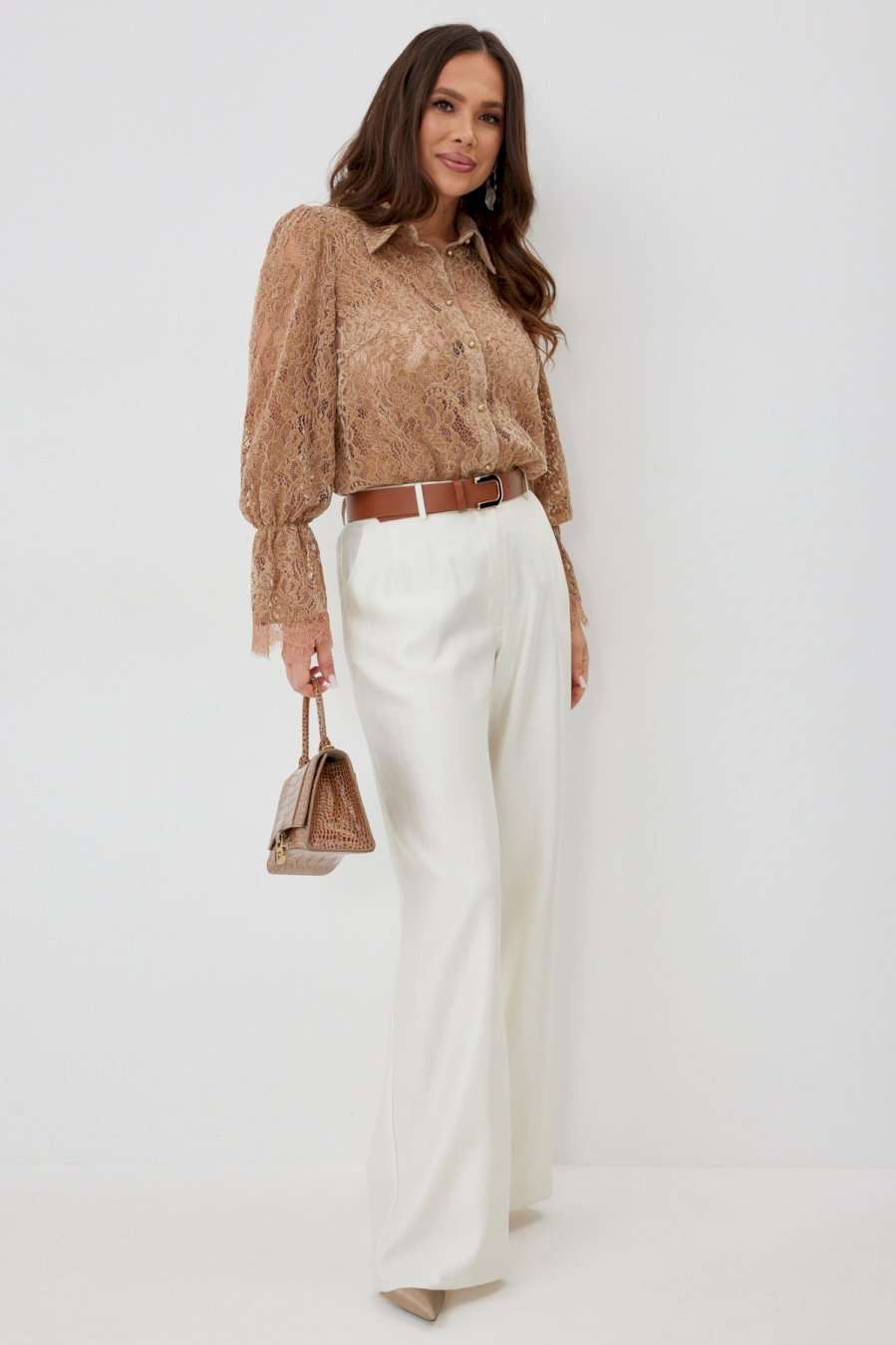 Стильный готовый образ с невероятным сочетанием кружевной блузы в нежном карамельном оттенке с шикарными брюками в красивом молочном цвете. Блуза прямого кроя с нагрудными вытачками. Рукав втачной, по низу присборен на эластичную тесьму и дополнен притачной кружевной манжетой. Застежка центральная на пришивные пуговицы. Воротник отложной на стойке. Блуза выполнена из красивого нежного бархатного кружева премиум качества. Брюки классического прямого кроя. Посадка средняя. Пояс притачной, дополнен эластичной тесьмой. Брюки дополнены удобными боковыми и задними карманами. Застежка гульфик на молнию и пуговицу. Выполнены из красивой гладкой костюмной ткани с жемчужным отливом. Красивый пояс в комплекте. Длина блузы от плечевого шва 67см. Длина рукава 69 см. Длина брюк по боковому шву 107 см.