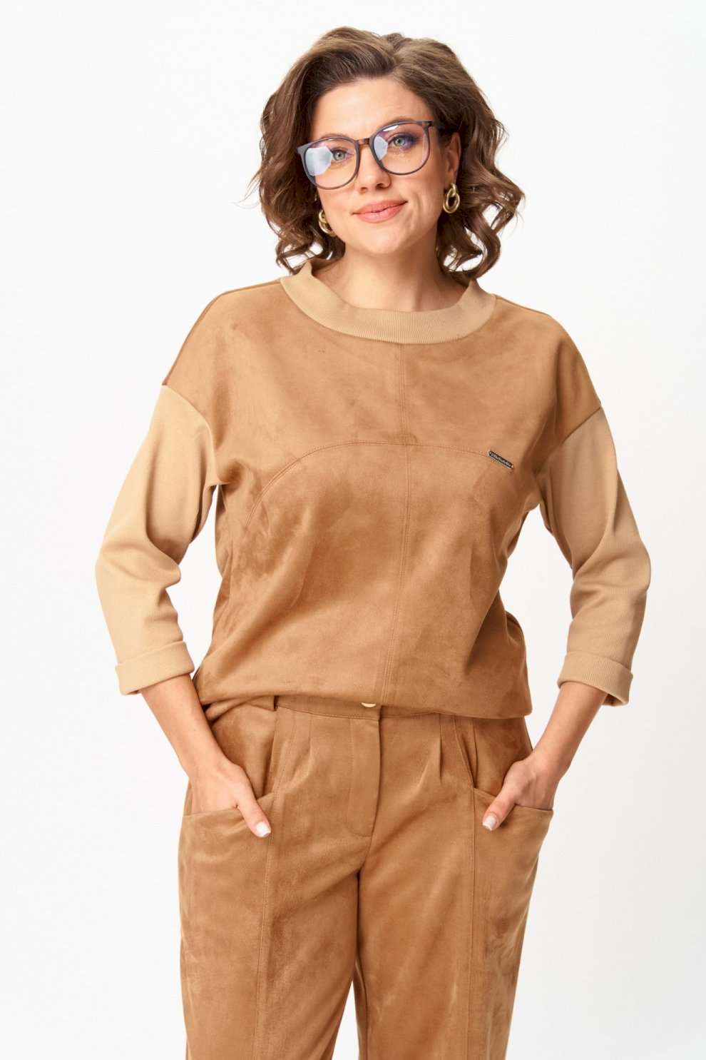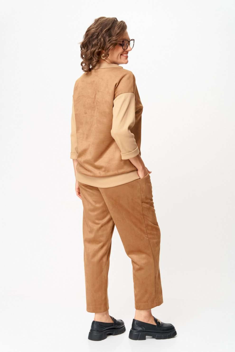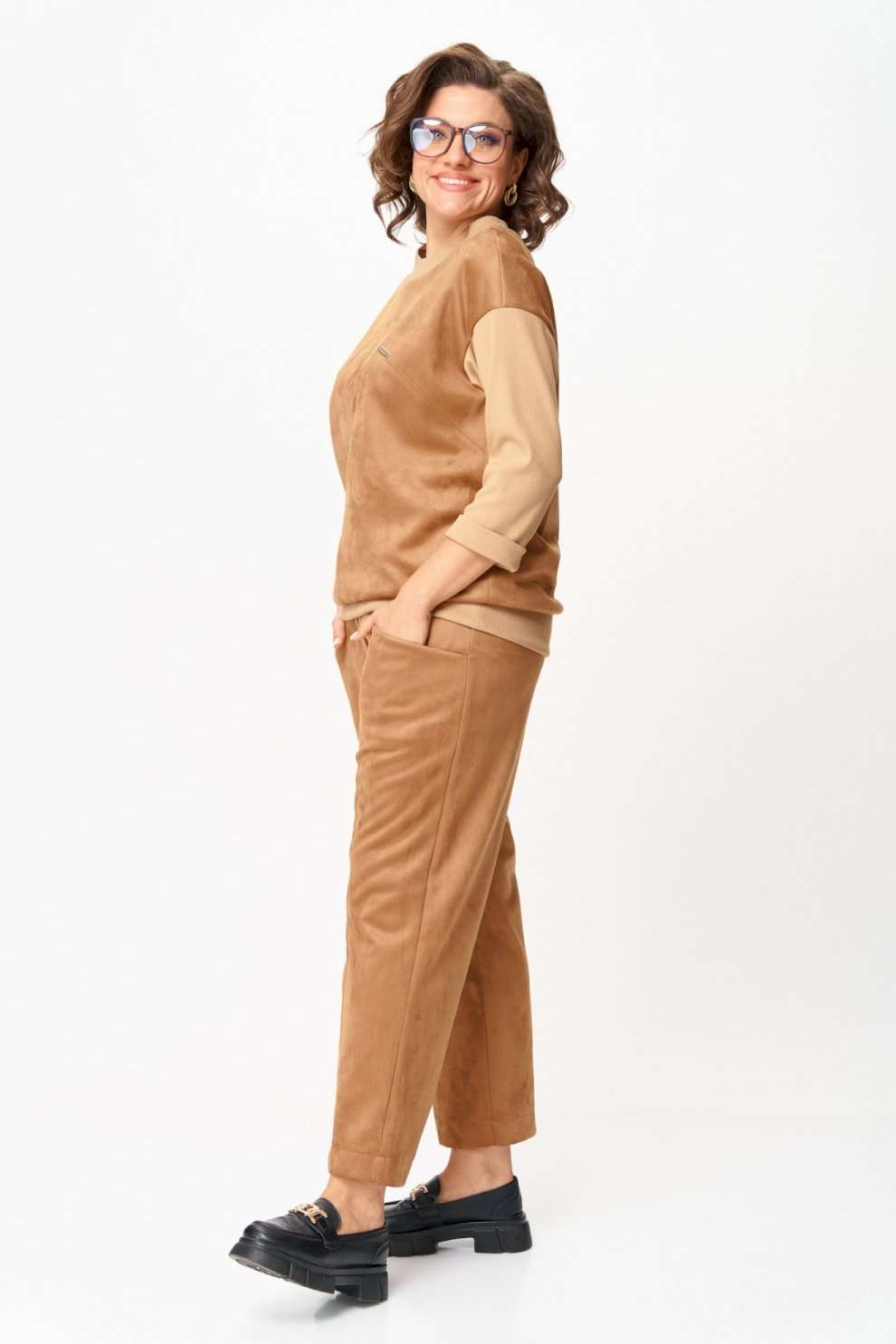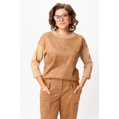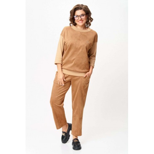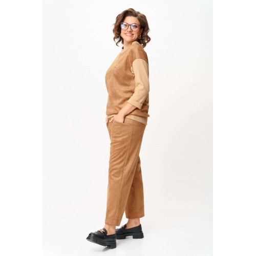 Костюм из текстиля с замшевым напылением Стильный костюм, выполненный из мягкого текстиля с замшевым напылением. Материал приятно ощущается на теле, дышит и сохраняет форму. Универсальный фасон позволяет носить комплект как для повседневных дел, так и в качестве удобного образа на выход. Must-have сезона: мягкий костюм в карамельных оттенках, сочетающий комфорт и стиль, идеально подходящий для повседневных образов. Эта универсальная вещь станет вашей надежной базой на каждый день. Особенности модели: ◾Приятный на ощупь материал, мягкий и комфортный к телу ◾Прямой силуэт с аккуратными швами и лёгкой посадкой ◾Джемпер с рукавом 3/4 и декоративной прострочкой ◾Брюки со средней посадкой и комфортным поясом ◾Универсальный бежево-карамельный оттенок ◾Лаконичный дизайн без лишних деталей Преимущества: ◾Удобный и практичный крой ◾Материал легко очищается и сохраняет внешний вид ◾Подходит для повседневной носки и офиса ◾Хорошо комбинируется с базовой обувью и аксессуарами Выбирайте удобство и элегантность сегодня, чтобы быть в тренде завтра! Изделие подойдет на рост 170 см.