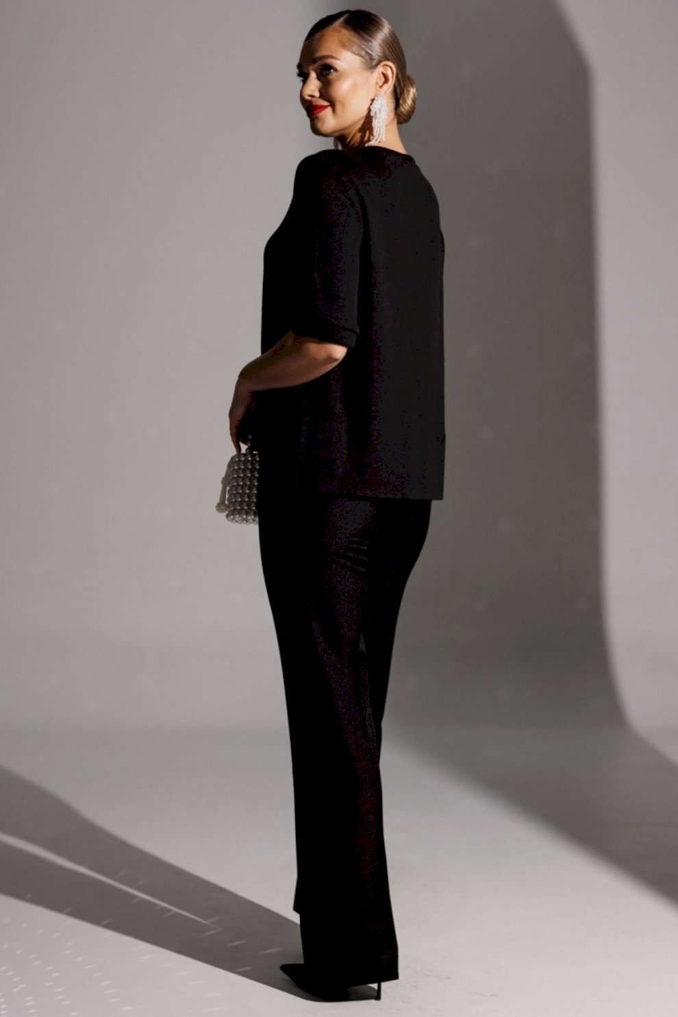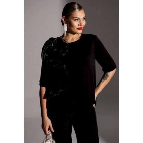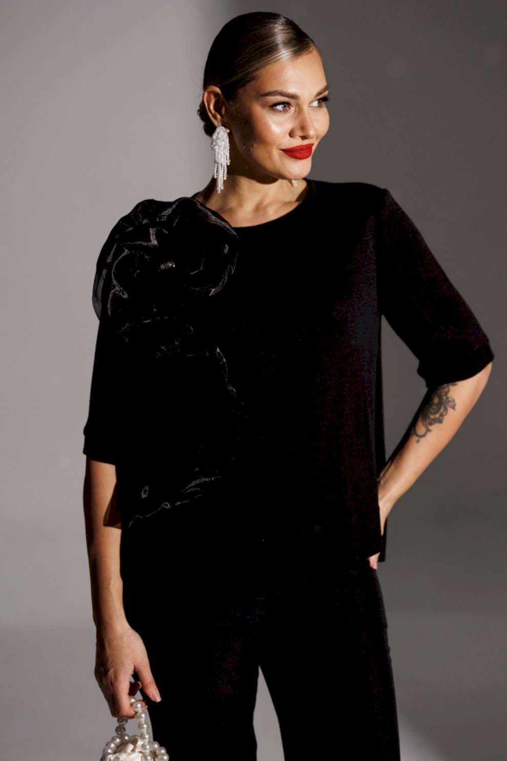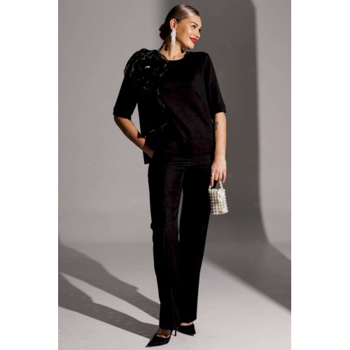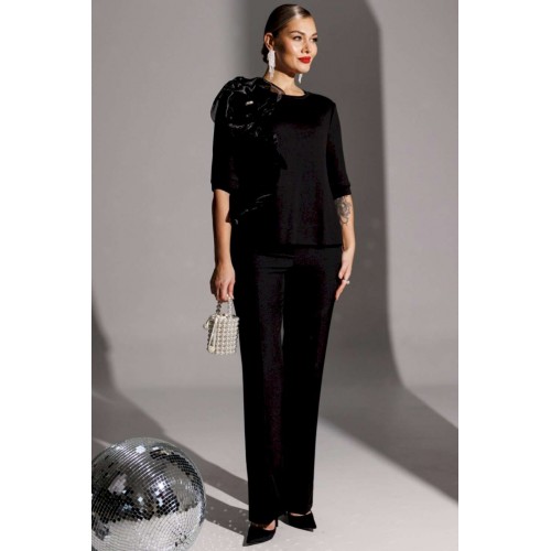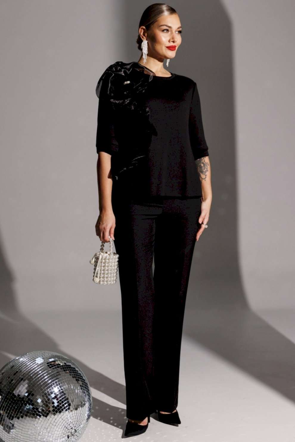 Создать нарядный образ с брюками возможно вместе с нашей новинкой ! Комплект состоит из блузы и брюк. Блуза выполнена из тонкого, струящегося трикотажа, имеющего в составе ангору. Блуза полуприлегающего силуэта, по низу с перепадом длины. Перед декорирован акцентным дизайнерским цветком из органзы. Рукав втачной с манжетой. Брюки классические, прямого силуэта, с заутюженными стрелками, боковыми карманами шлевками для ремня. длина спинки блузона: 67 см длина брюк: 109 см