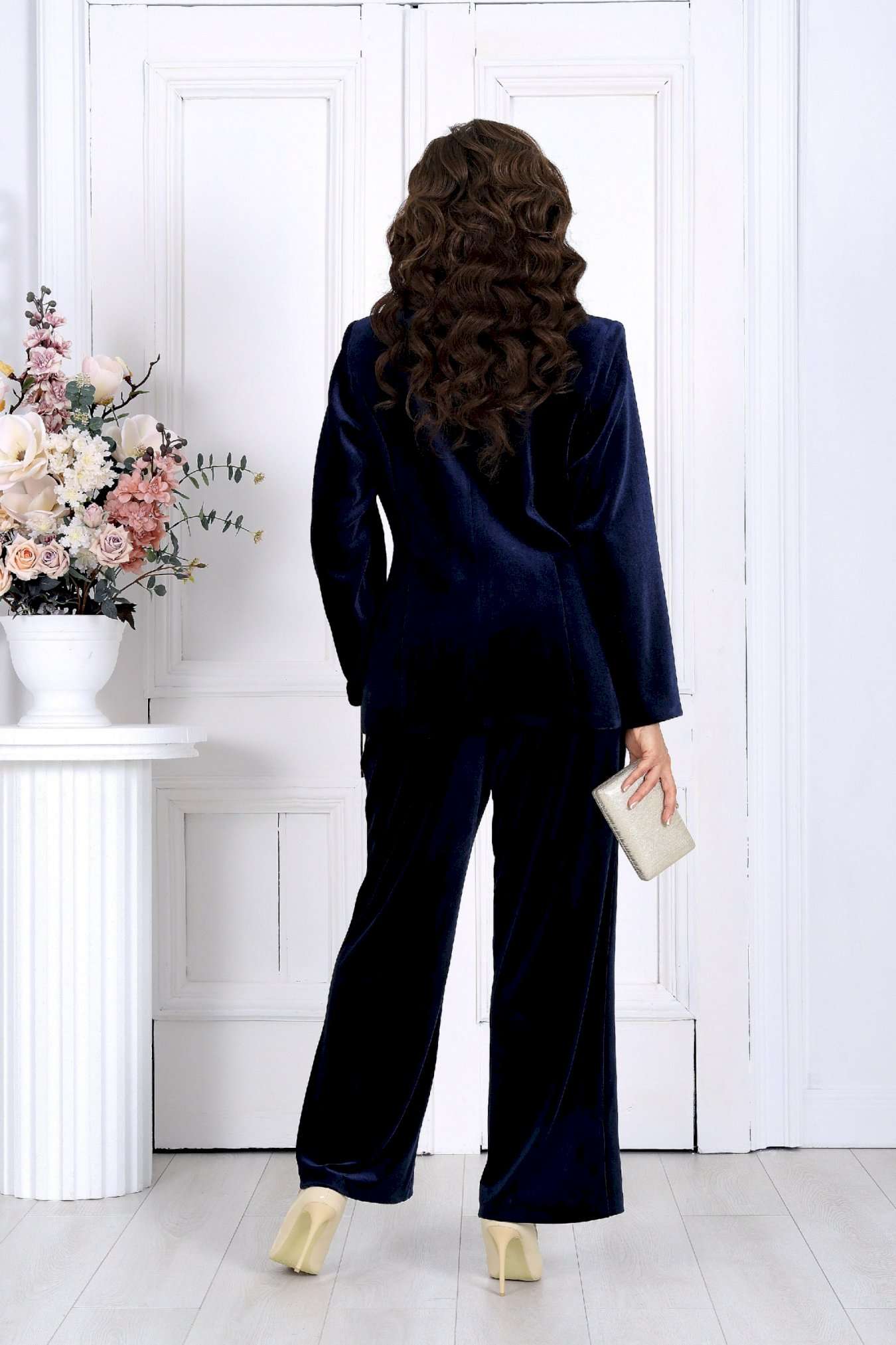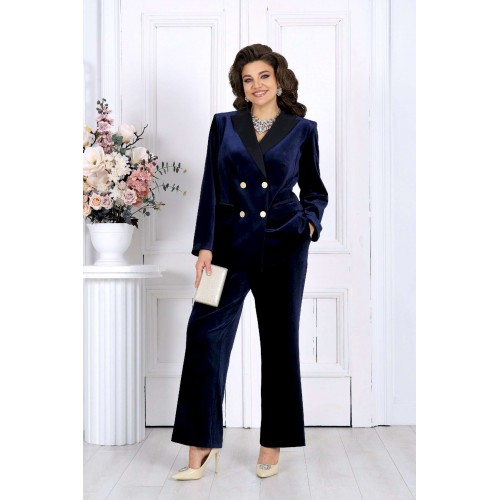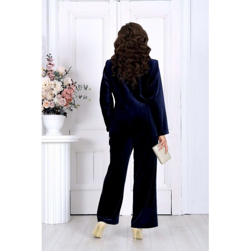 Этот костюм — воплощение классики вечерней моды и станет незаменимым вариантом для женщин, которые ищут стильный и одновременно комфортный наряд на торжество. Воротник и лацканы из сатина придают изделию утонченный и благородный вид, что делает его подходящим для новогоднего корпоратива, свадьбы или юбилея. Высококачественные материалы и продуманное лекало обеспечивают не только привлекательный внешний вид, но и максимальный комфорт. Такой костюм идеально подойдет для полных женщин, которые ценят элегантность и удобство. Комплект брючный 2-х предметный, состоящий из жакета и брюк. Жакет классический на подкладке, выполнен из велюра. Модель полуприлегающего силуэта с отложным воротником и лацканами «ласточкино крыло». Спереди обработаны смещенные к боковым рельефные швы, направленные от пройм до низа, и вытачки, идущие от прорезных карманов с клапаном до центра груди. Перед с двубортной внешней застежкой на 2 металлические пуговицы и внутренней на 2 потайные. Спинка со средним и рельефными швами. Рукав длинный, втачной, двухшовный. Воротник, лацканы и «рамка» кармана выполнены из сатина в цвет основной ткани. Длина жакета-67 см; длина рукава-61 см. Брюки классические длинные, прямого силуэта, с посадкой на талии, выполнены из трикотажного полотна «велюр». Модель с центральной застёжкой на тесьму-«молнию», на притачном поясе, застегивающемся на петлю и пуговицу. Передние и задние половинки брюк с талиевыми вытачками, направленными от пояса вниз. Спереди обработаны боковые наклонные карманы. Для лучшего прилегания брюк в области талии в поясе по задним половинкам вставлена эластичная лента. Длина брюк по боковому (с поясом)-107 см (52-54 р-р), 108 см (56-60 р-р).