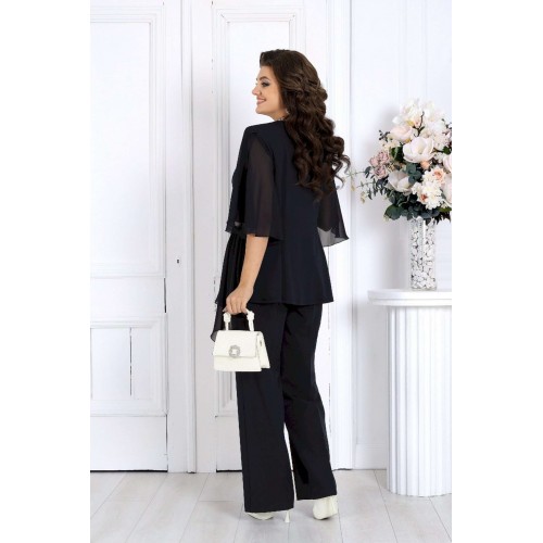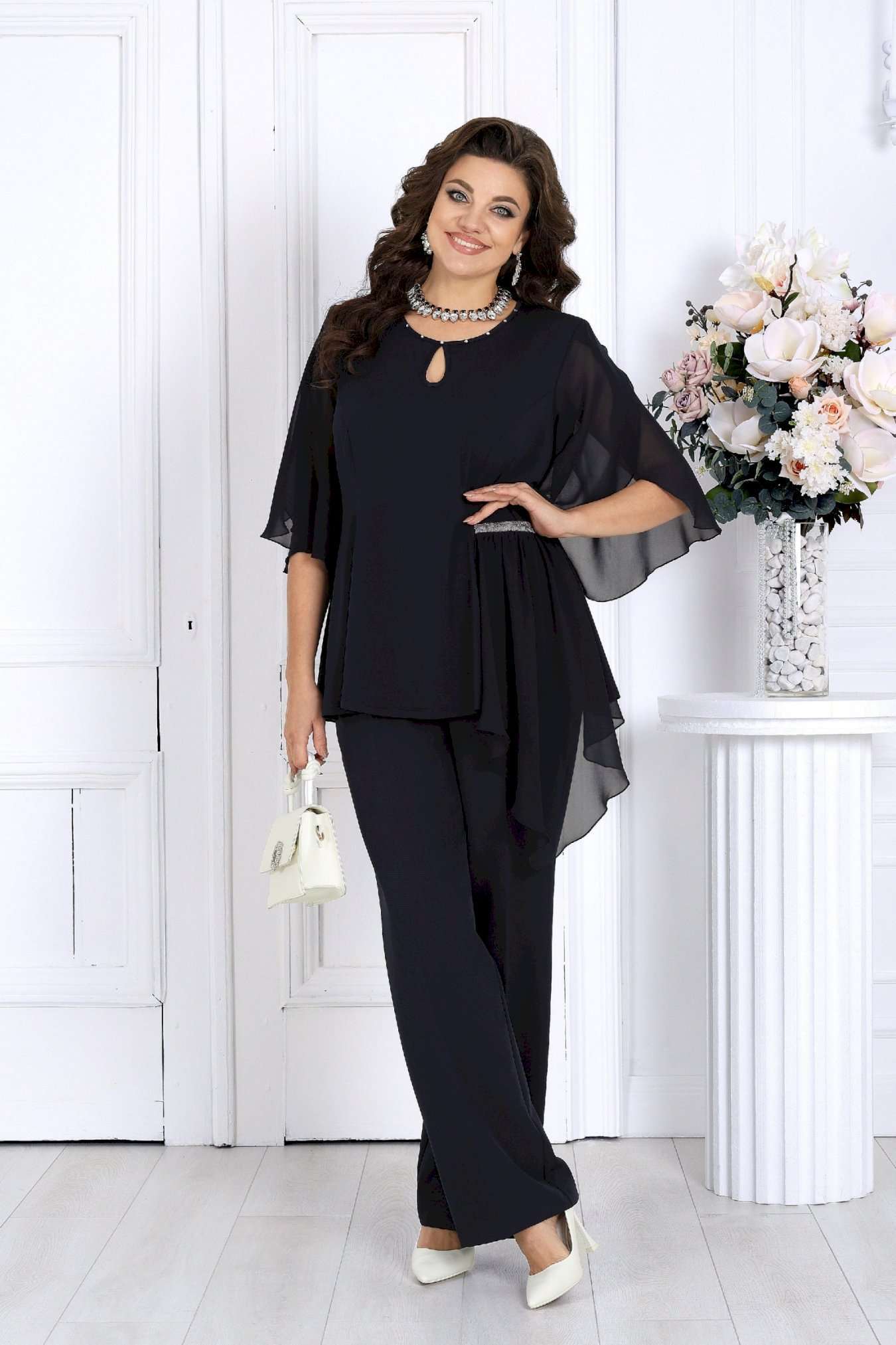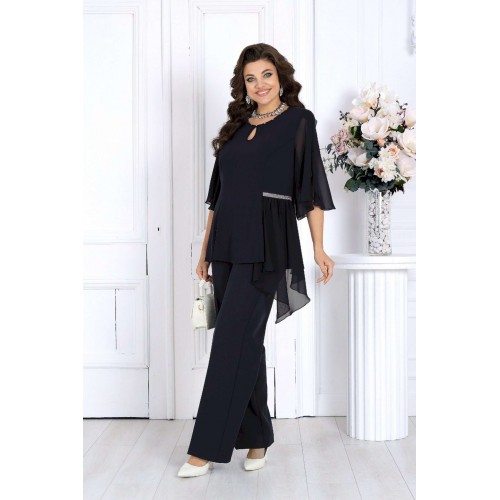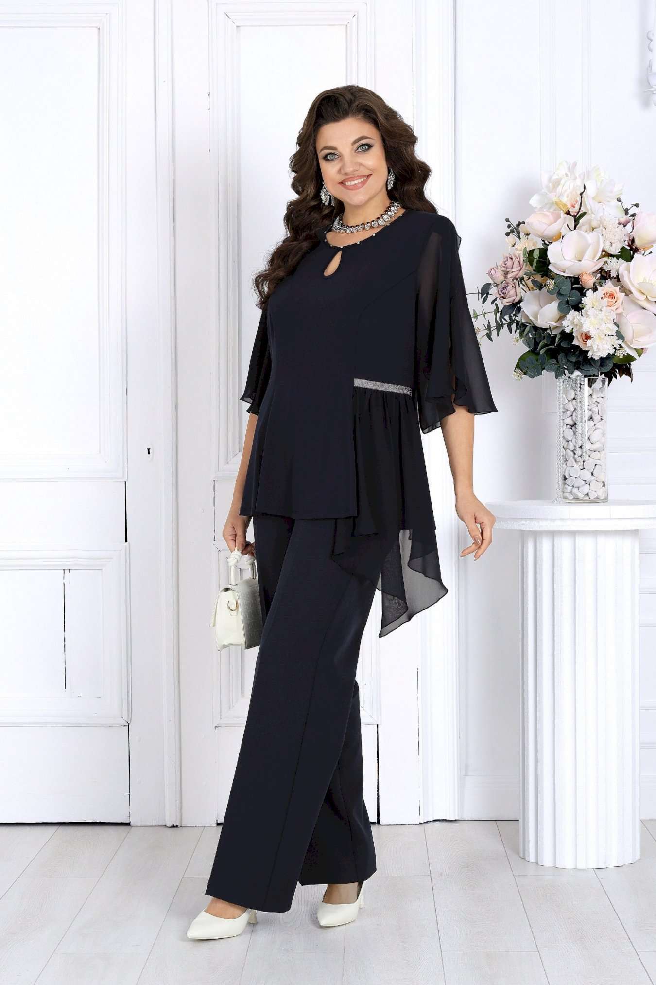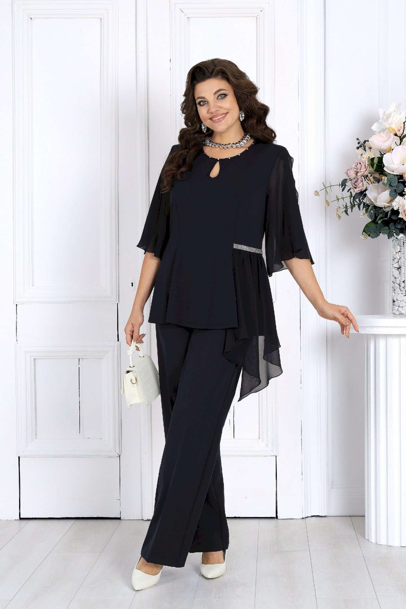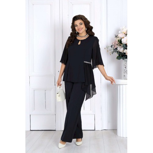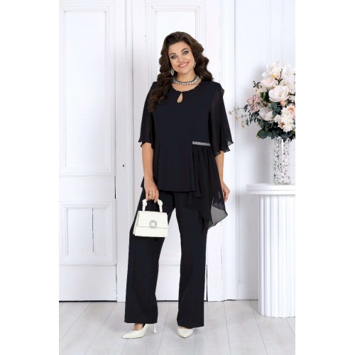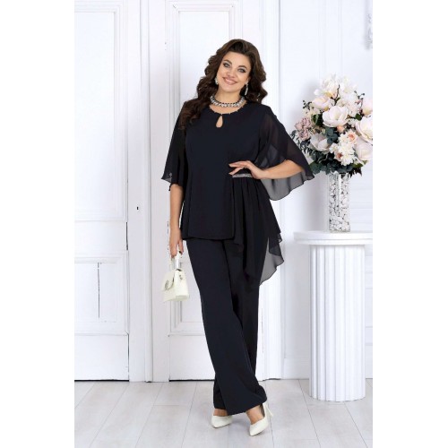 Этот костюм сочетает в себе женственность, комфорт и безупречный крой, подчеркивающий фигуру и скрывающий возможные нюансы. Воздушная блузка выполнена из мягкого трикотажа «масло» и дополнена асимметричной шифоновой деталью, создающей красивый драпирующийся силуэт. Украшение в виде страз и изящный вырез «капля» добавляют образу благородного блеска и утонченности. Легкий рукав формы «крылышко» дарит ощущение свободы и легкости движений. Классические брюки со стрелками идеально садятся по фигуре благодаря эластичной вставке в поясе и мягкой посадке на талии. Этот костюм отлично подходит для женщин с пышными формами — подчеркивает достоинства, визуально вытягивает силуэт и делает образ торжественным и уверенным. Идеален для новогодних праздников, юбилеев, вечеринок и торжеств. Комфортный и нарядный — он станет вашей любимой праздничной двойкой! Комплект брючный 2-х предметный, состоящий из блузки и брюк. Блузка полуприлегающего силуэта, выполнена из трикотажного полотна «масло». Модель без воротника и застежки. На переде и спинке обработаны рельефные швы, направленные от проймы до низа. На левой боковой части переда – горизонтальный подрез с отлетной деталью из шифона. Шов подреза декорирован тесьмой со стразами. Горловина круглой формы, окантована косой бейкой из основного полотна; спереди декорирована стразами и дополнена вырезом «капля». Рукав короткий, формы «крылышко на запах», со скругленными срезами; выполнен из шифона. Длина блузки – 57 см; длина рукава – 41 см. Брюки классические, длинные, с посадкой на талии, выполнены из костюмно- плательной ткани. Модель со стрелками. Передние и задние половинки брюк с талиевыми вытачками, направленными от пояса вниз. Спереди обработаны наклонные боковые карманы и центральная застёжка на тесьму-«молнию». Притачной пояс застегивается на 1 петлю и 1 пуговицу; для лучшего прилегания по линии талии в притачном поясе предусмотрена эластичная лента, вставленная по спинке. Длина брюк по боковому (с поясом) -- 107 см.