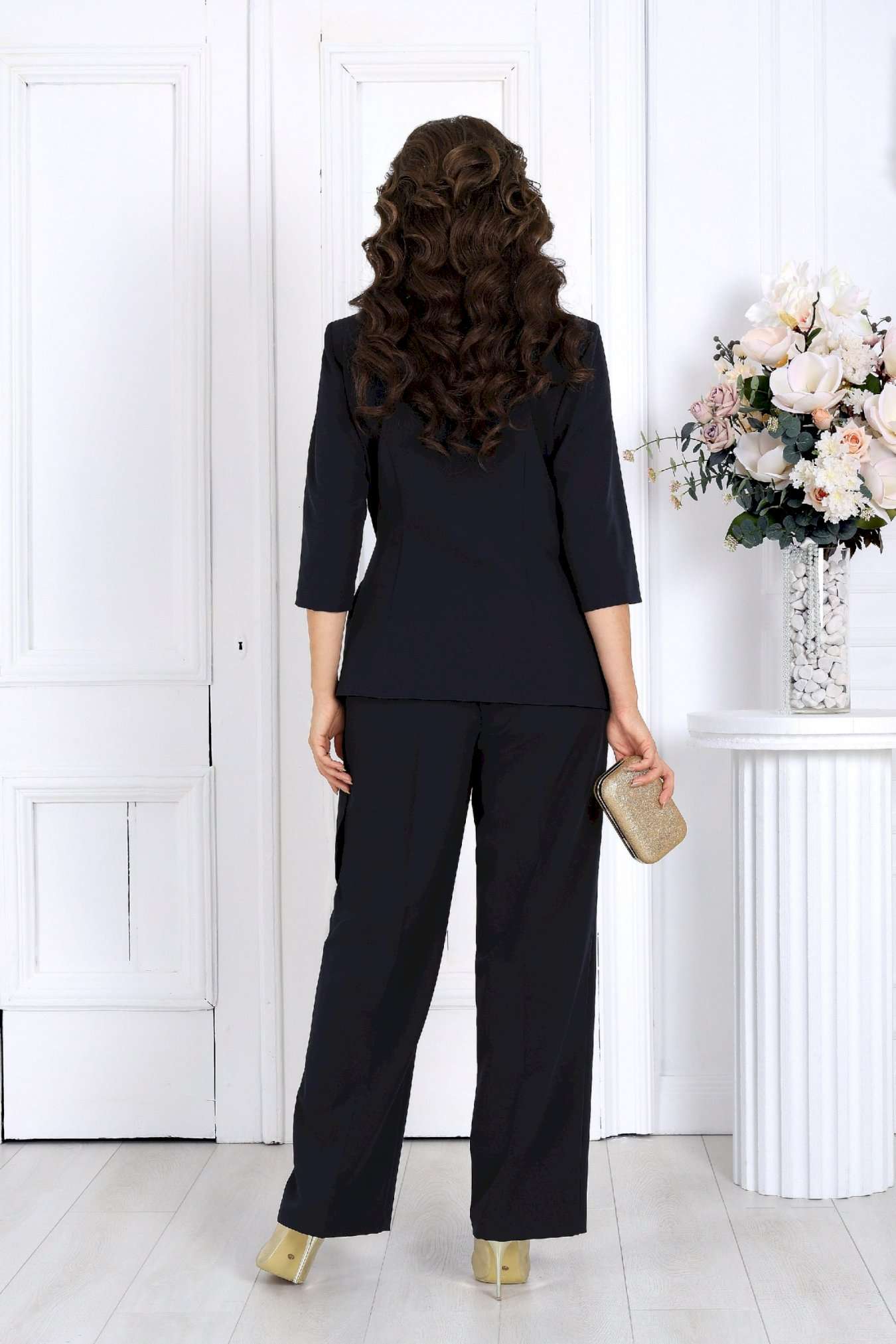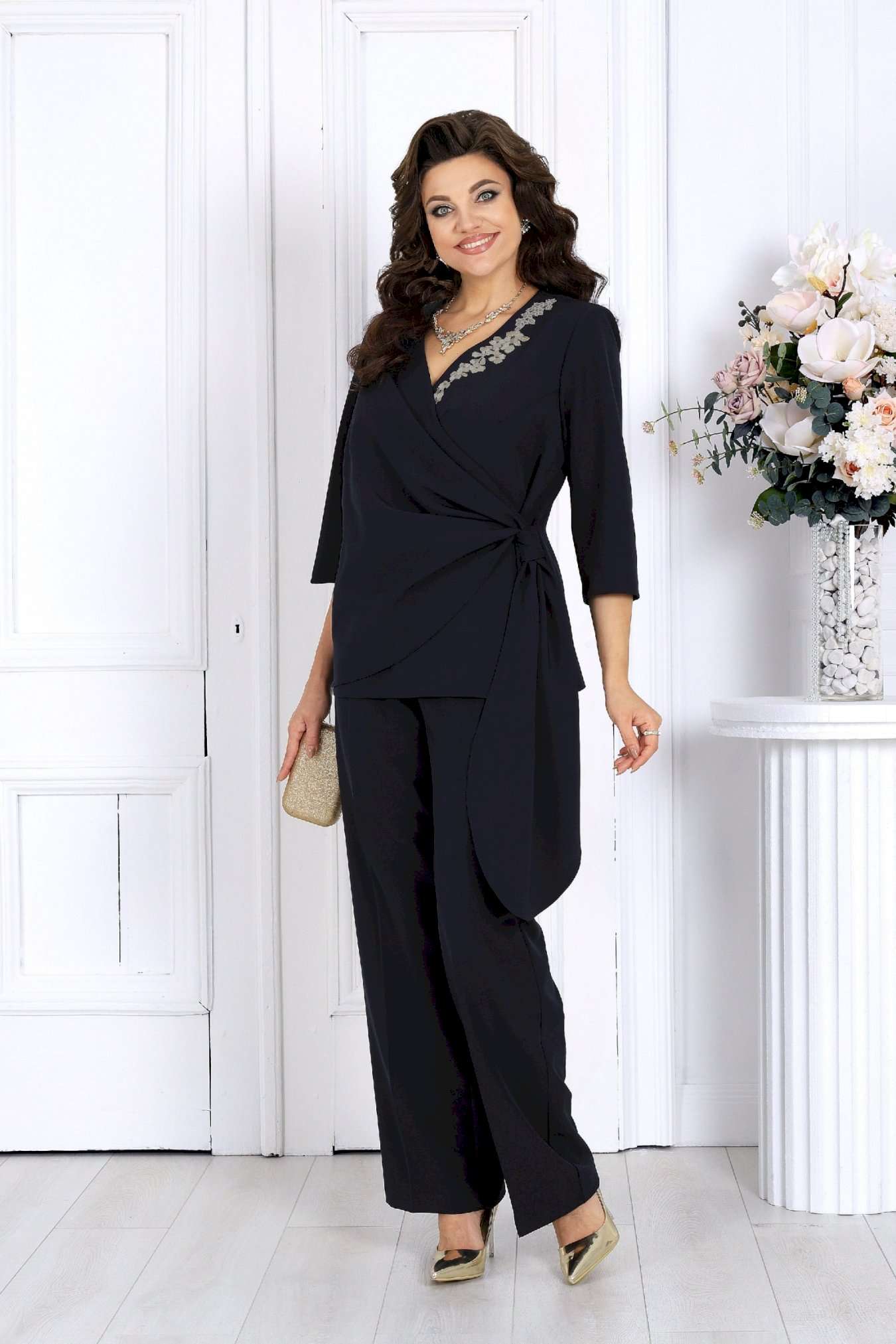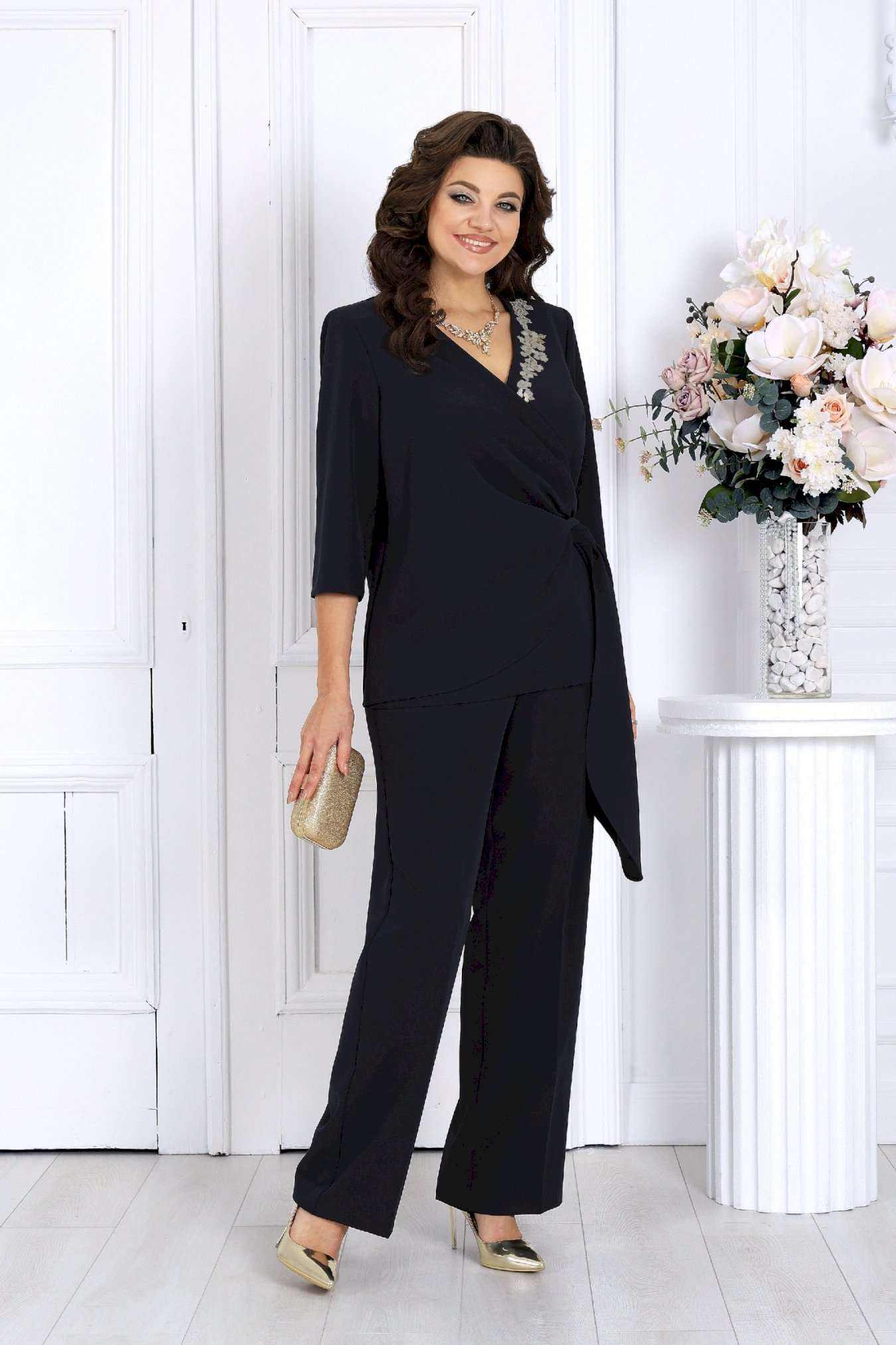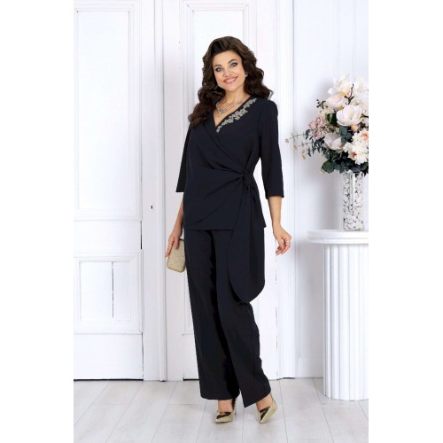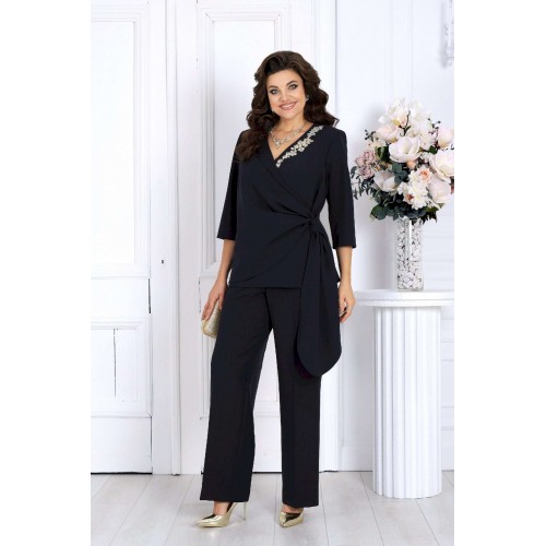 Брючный костюм — идеальный выбор для торжества. Элегантная вечерняя блузка на запах и брюки со стрелками создают утончённый силуэт и визуально стройнят. Модель выполнена из качественной костюмной ткани, украшена кружевом в области декольте. Подойдёт как нарядный костюм на праздник, новогодний вечер, юбилей, встречу гостей или официальный ужин. Комплект брючный 2-х предметный, состоящий из блузки и брюк. Блузка полуприлегающего силуэта, выполнена из костюмно-плательной ткани. Модель без застежки, с плечевыми накладками. Перед состоит из двух деталей, скрепленных между собой на запах: левая деталь переда входит в правый боковой шов, правая деталь – протянута в шлевку левого бокового шва. Спинка с талиевыми вытачками и горловиной округлой формы. Горловина переда декорирована аппликацией из кружева. Рукав втачной, трехчетвертной. Длина блузки – 65 см; длина рукава – 43 см. Брюки классические, длинные, с посадкой на талии, выполнены из костюмно- плательной ткани. Модель со стрелками. Передние и задние половинки брюк с талиевыми вытачками, направленными от пояса вниз. Спереди обработаны наклонные боковые карманы и центральная застёжка на тесьму-«молнию». Притачной пояс застегивается на 1 петлю и 1 пуговицу; для лучшего прилегания по линии талии в притачном поясе предусмотрена эластичная лента, вставленная по спинке. Длина брюк по боковому (с поясом) – 107 см.