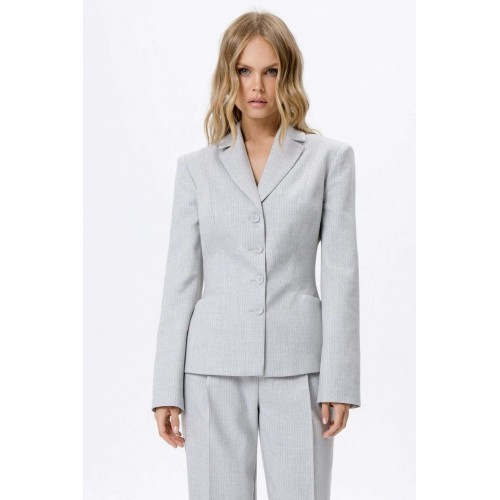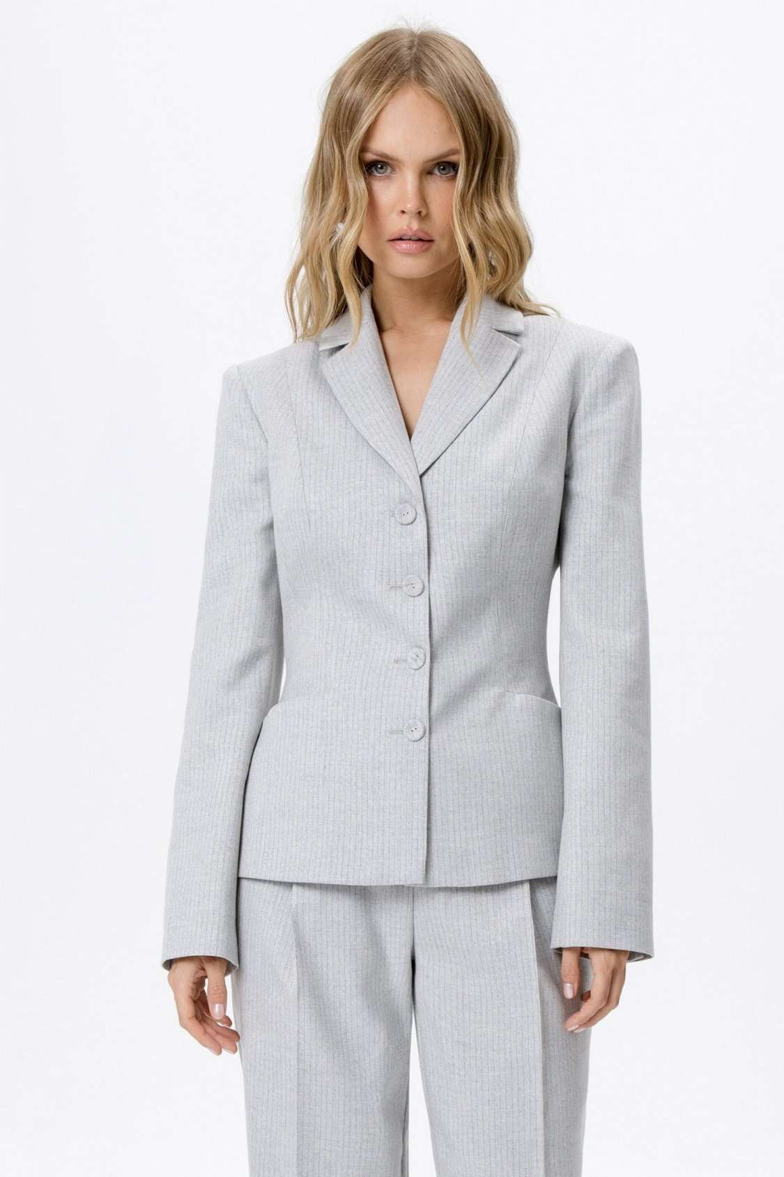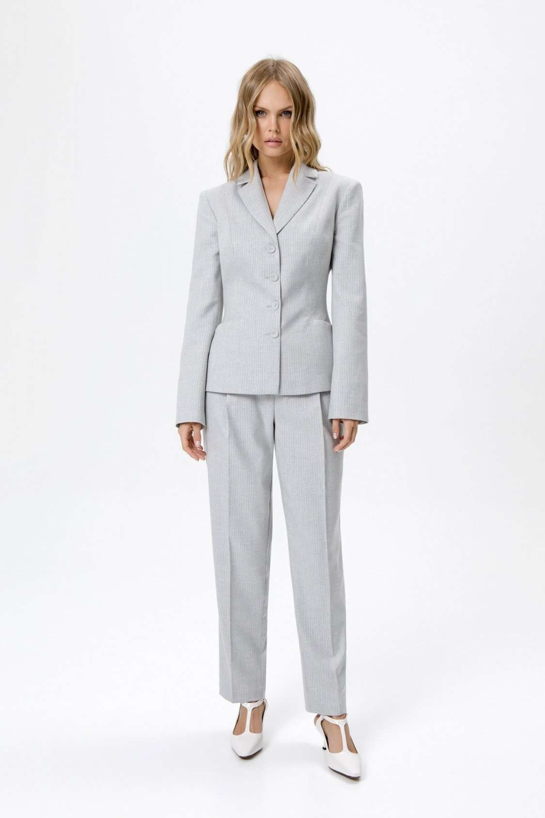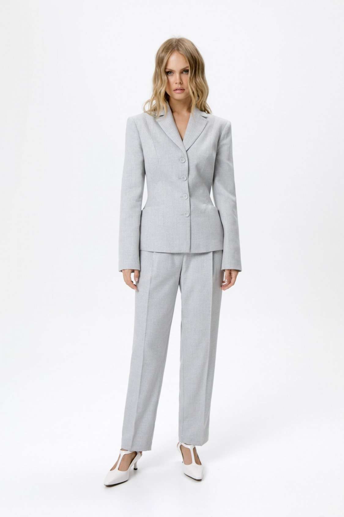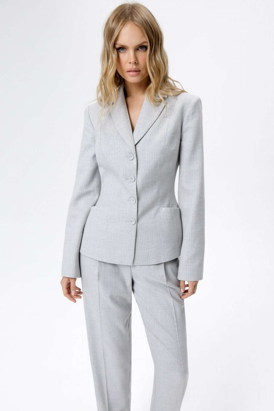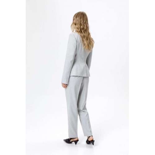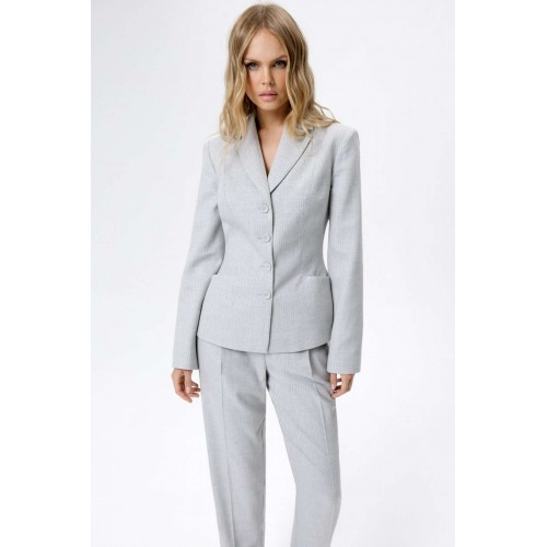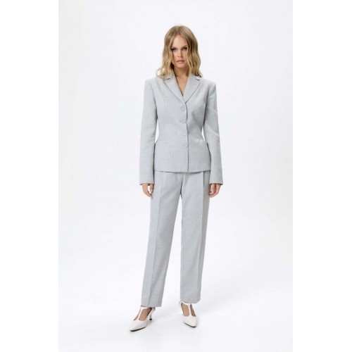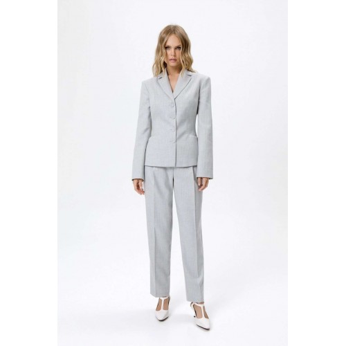 Костюм-двойка из укороченного приталенного жакета с акцентными карманами и укороченных классических брюк со стрелками.