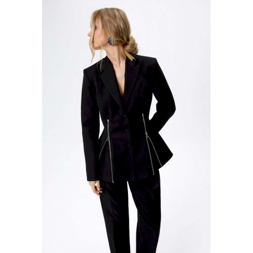 Костюм-двойка из приталенного жакета с молниями и укороченных классических брюк со стрелками.