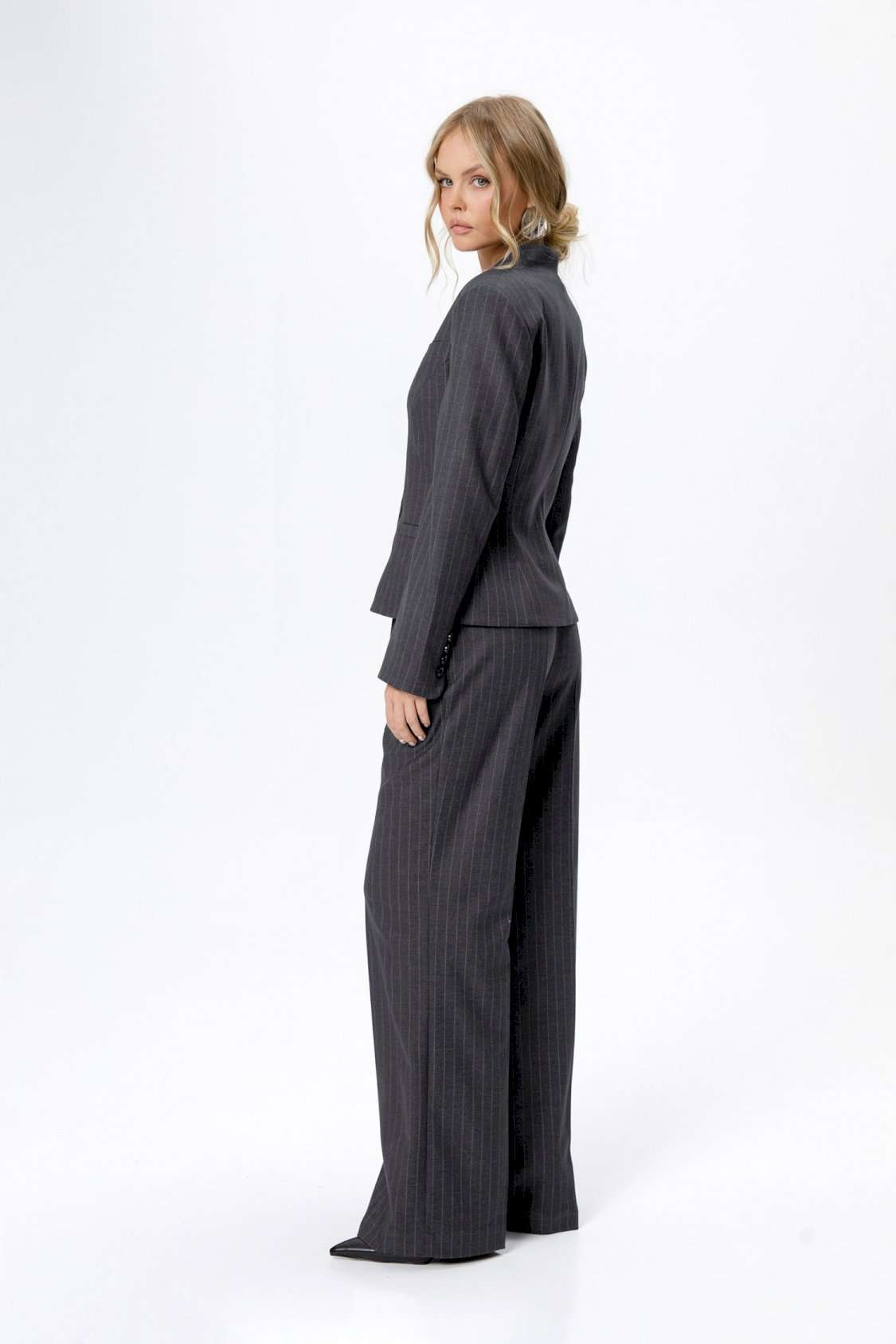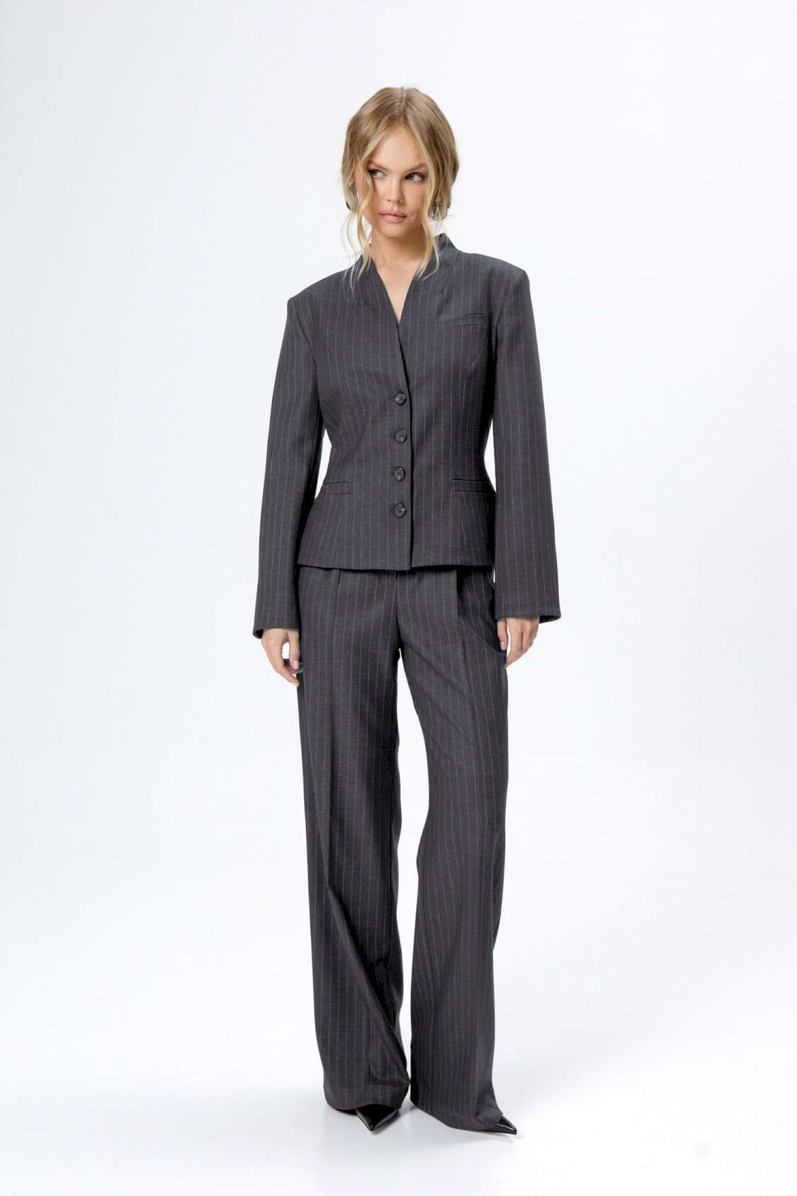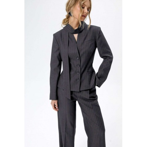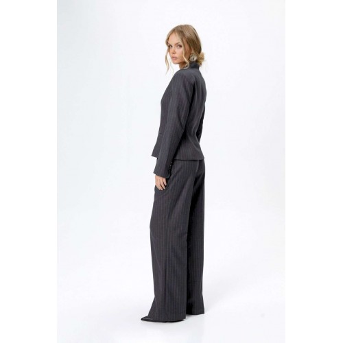 Костюм-двойка из приталенного жакета со съемным шарфиком и широких прямых брюк. Детали: жакет полуприлегающего силуэта, цельнокроеный воротник-стойка, рельефные швы переда и спинки, функциональные карманы, застежка на петли и пуговицы, на подкладке. В комплекте съемный шарфик. Брюки с притачным поясом со шлевками, передние половины с небольшими застроченными мягкими складками и заутюженными стрелками, застежка на молнию и пуговицу, боковые карманы. Задние части брюк с вытачками и заутюженными стрелками. Пояс брюк прямой, без резинки. Длина жакета по спинке около 56 см в размерах 40-46 и около 58,5 см в размерах 48-52, длина рукава около 62,5 см. Длина брюк по боковому шву с поясом около 114 см в размерах 40-46 и около 115,5 см в размерах 48-52. Длина по внутреннему шву около 83 см