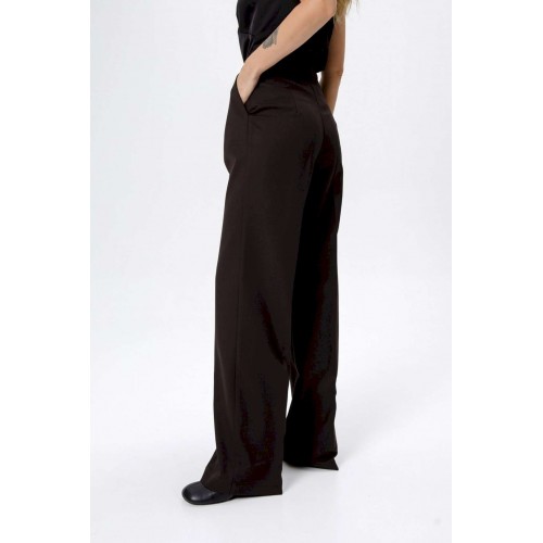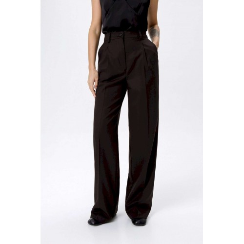 Классический костюм-двойка из приталенного жакета и прямых широких брюк со стрелками. Детали: приталенный силуэт, пиджачный воротник, функциональные карманы, двубортная застежка на петли и пуговицы, спинка со средним швом, втачные двухшовные рукава, жакет на подкладке. Брюки с высокой посадкой на притачном поясе со шлевками, передние половины с небольшими застроченными мягкими складками и заутюженными стрелками, застежка на молнию и пуговицу, боковые карманы. Длина жакета по спинке около 68 см в размерах 40-46 и около 71 см в размерах 48-52, длина рукавов около 62 см. Длина рукава около 61 см. Длина брюк по боковому шву с поясом около 114 см в размерах 40-46 и около 115,5 см в размерах 48-52. Длина по внутреннему шву около 83 см