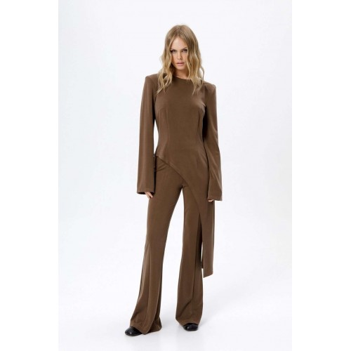 Трикотажный костюм-двойка из асимметричной туники и облегающих брюк-клеш.