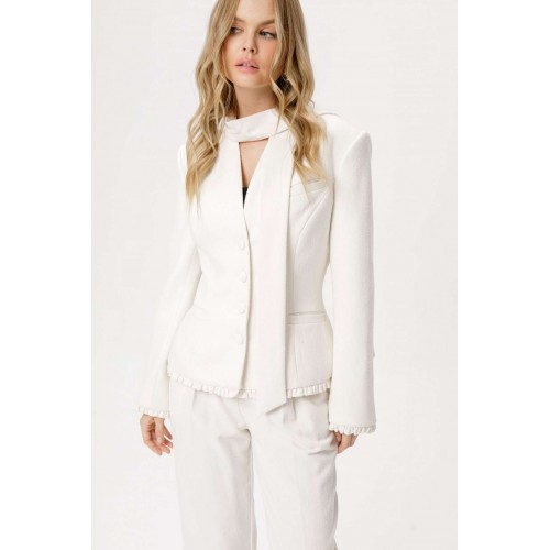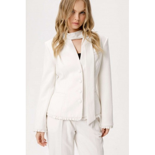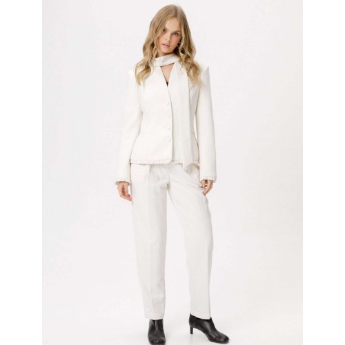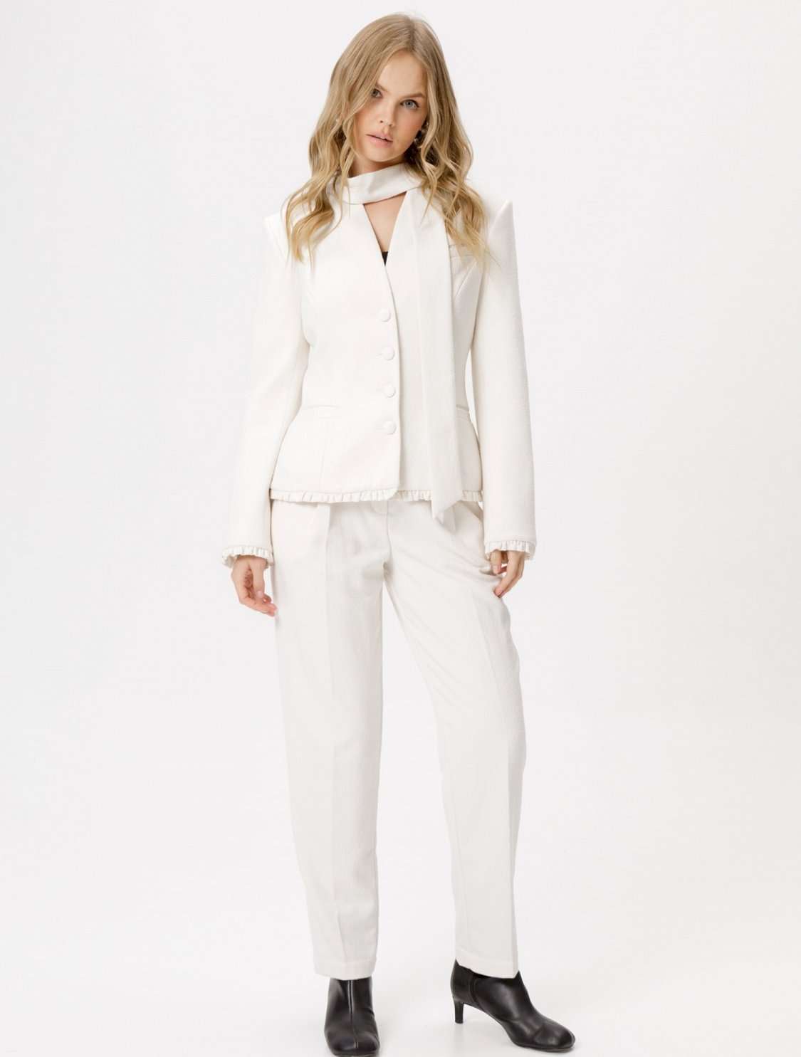 Костюм-двойка из приталенного жакета со съемным шарфиком и укороченных классических брюк со стрелками из фактурной ткани «букле». Детали: жакет полуприлегающего силуэта, цельнокроеный воротник-стойка, рельефные швы переда и спинки, функциональные карманы, застежка на петли и пуговицы, на подкладке. В комплекте съемный шарфик. Брюки с притачным поясом со шлевками, передние половины с застроченными мягкими складками и заутюженными стрелками, застежка на молнию и пуговицу, боковые карманы. Задние части брюк с вытачками и заутюженными стрелками. Пояс брюк без резинки. Длина жакета по спинке около 56 см в размерах 40-46 и около 58,5 см в размерах 48-52, длина рукава с оборкой около 61 см. Длина брюк по боковому шву с поясом около 100 см в размерах 40-46 и около 101,5 см в размерах 48-52. Длина по внутреннему шву около 71,5 см