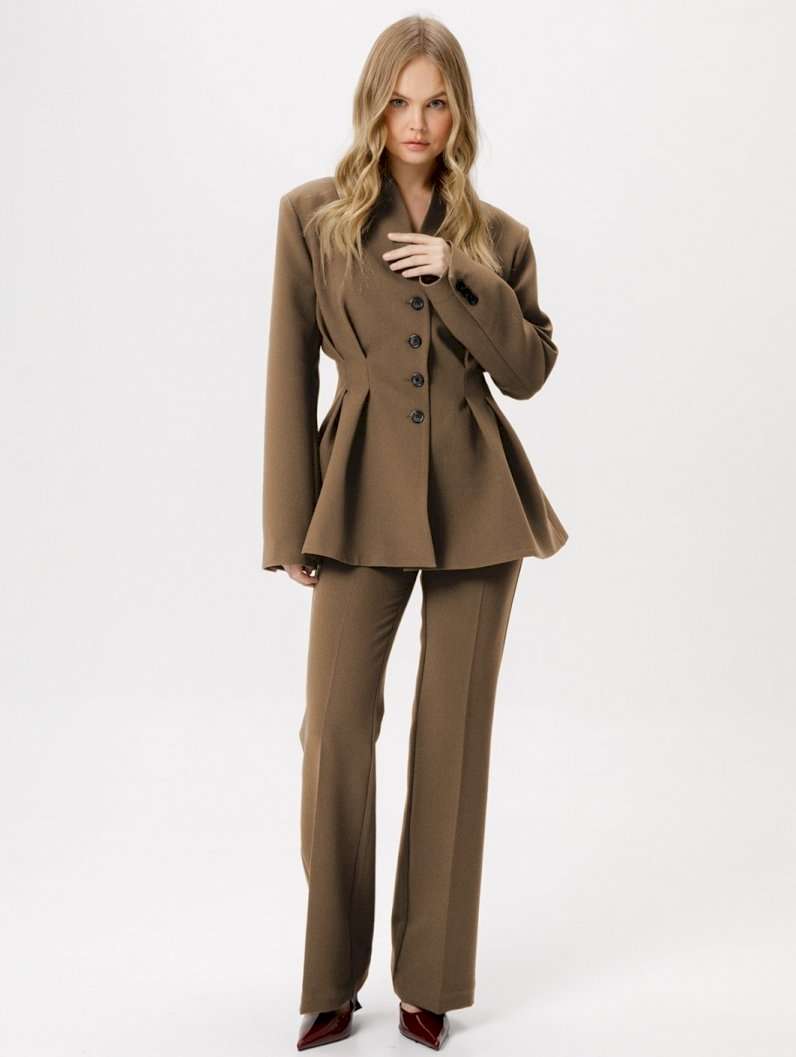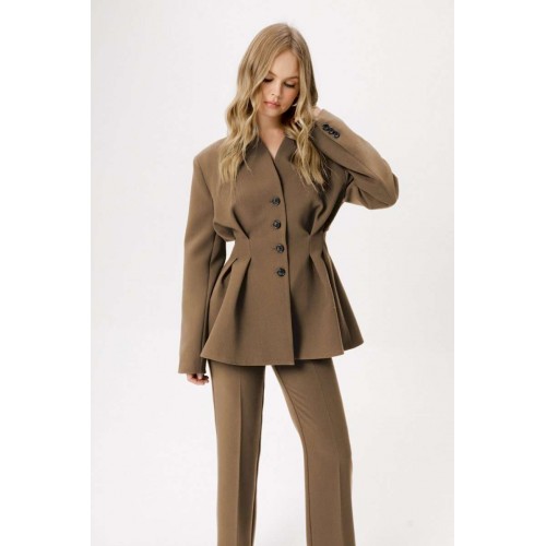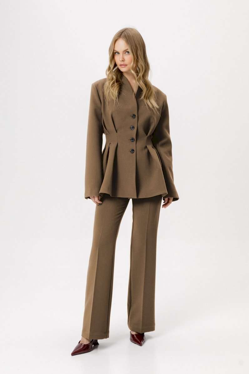 Костюм-двойка из приталенного жакета со складками и брюк-клеш со стрелками. Детали: жакет полуприлегающего силуэта с расширенными плечами, цельнокроеный воротник-стойка, застежка на петли и пуговицы, рукава втачные двушхшовные, жакет на подкладке. Брюки с притачным поясом со шлевками, передние половины с заутюженными стрелками, застежка на молнию и потайные крючки, боковые карманы. Задние части брюк с вытачками и заутюженными стрелками. Пояс брюк без резинки. Длина жакета по спинке около 66 см в размерах 40-46 и около 67,5 см в размерах 48-52, длина рукава около 61 см. Длина брюк по боковому шву с поясом около 112 см в размерах 40-46 и около 115,5 см в размерах 48-52. Длина по внутреннему шву около 82 см
