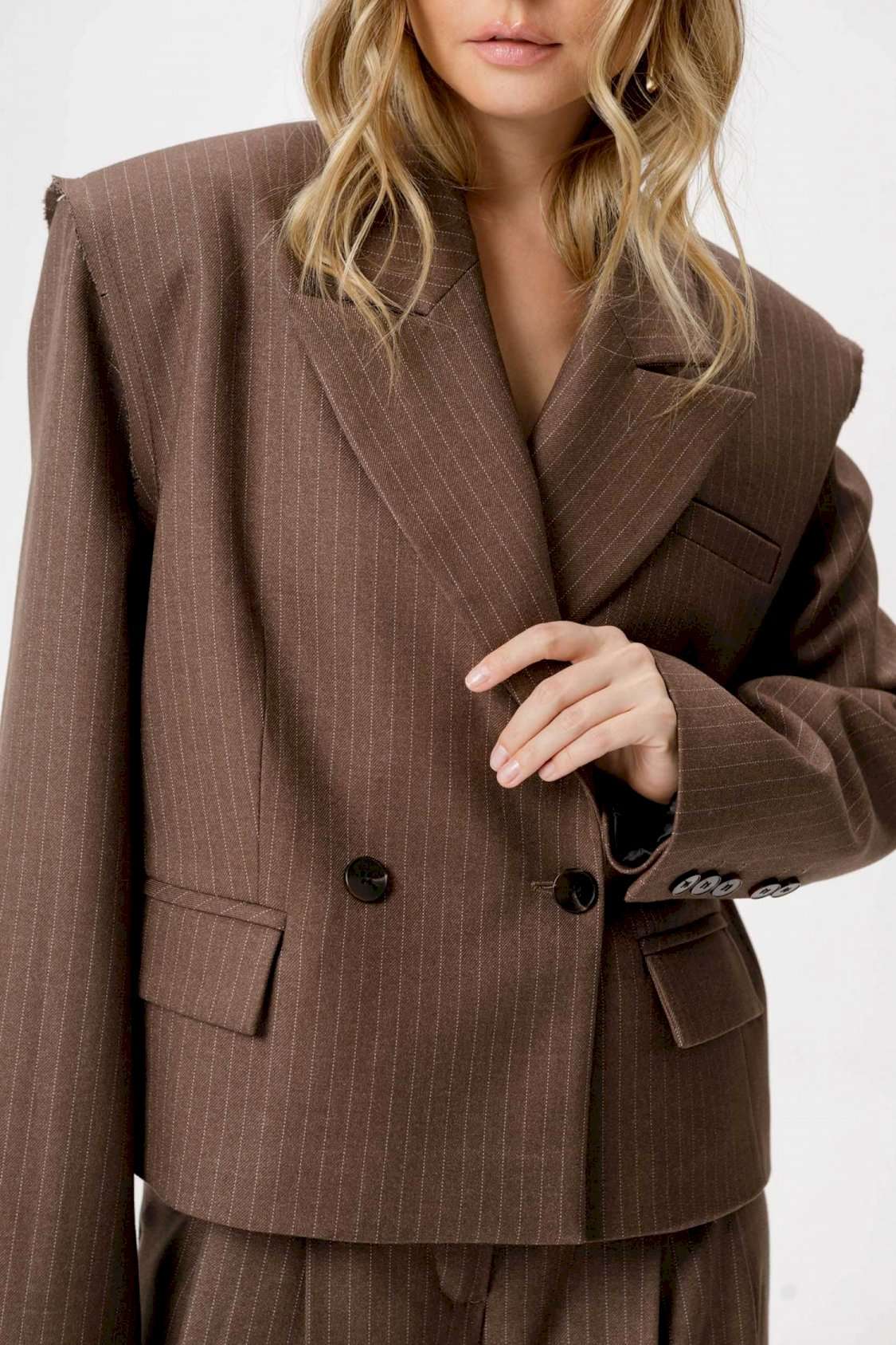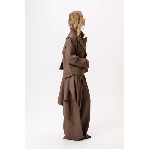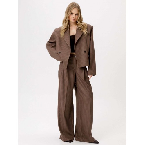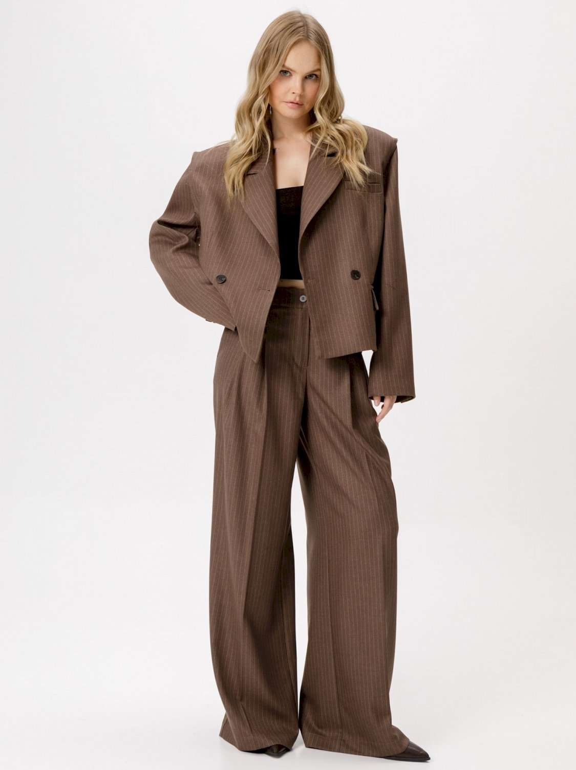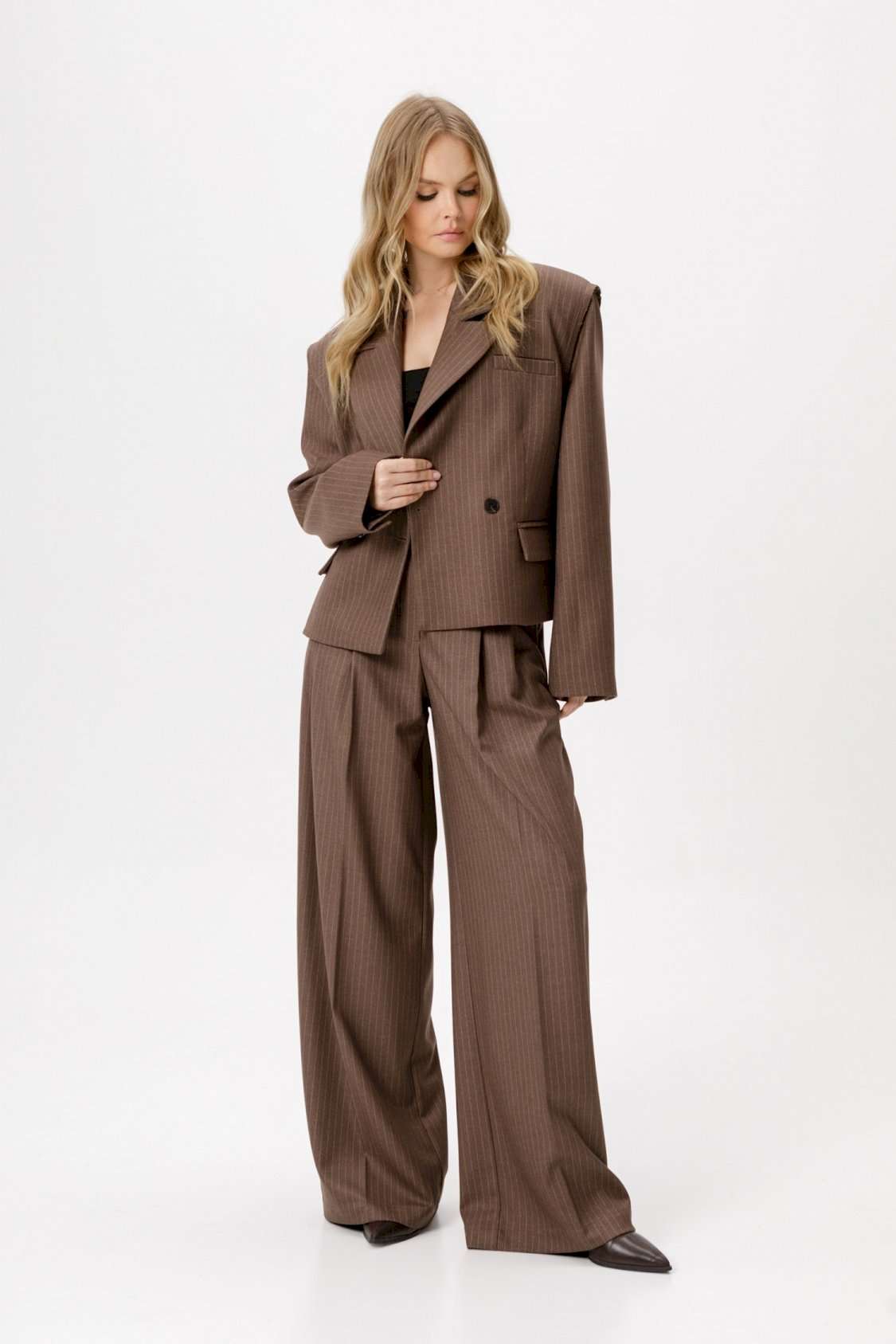 Костюм-двойка из укороченного оверсайз жакета с необработанным краем пройм и широких брюк-палаццо из текстильной ткани в полоску. Детали: жакет прямого силуэта, пиджачный воротник, двубортная застежка на две петли и пуговицы, функциональные карманы, спинка с фигурной кокеткой, рукава втачные, жакет на подкладке. Брюки с притачным поясом со шлевками, складки у пояса, застежка на молнию и пуговицу, боковые карманы, заутюженные стрелки. Задние части брюк с вытачками и имитацией карманов. Длина жакета по спинке около 55 см в размерах 40-46 и около 56,5 см в размерах 48-52, длина рукавов около 61 см. Длина брюк по боковому шву с поясом около 109,5 см, длина по внутреннему шву около 83 см